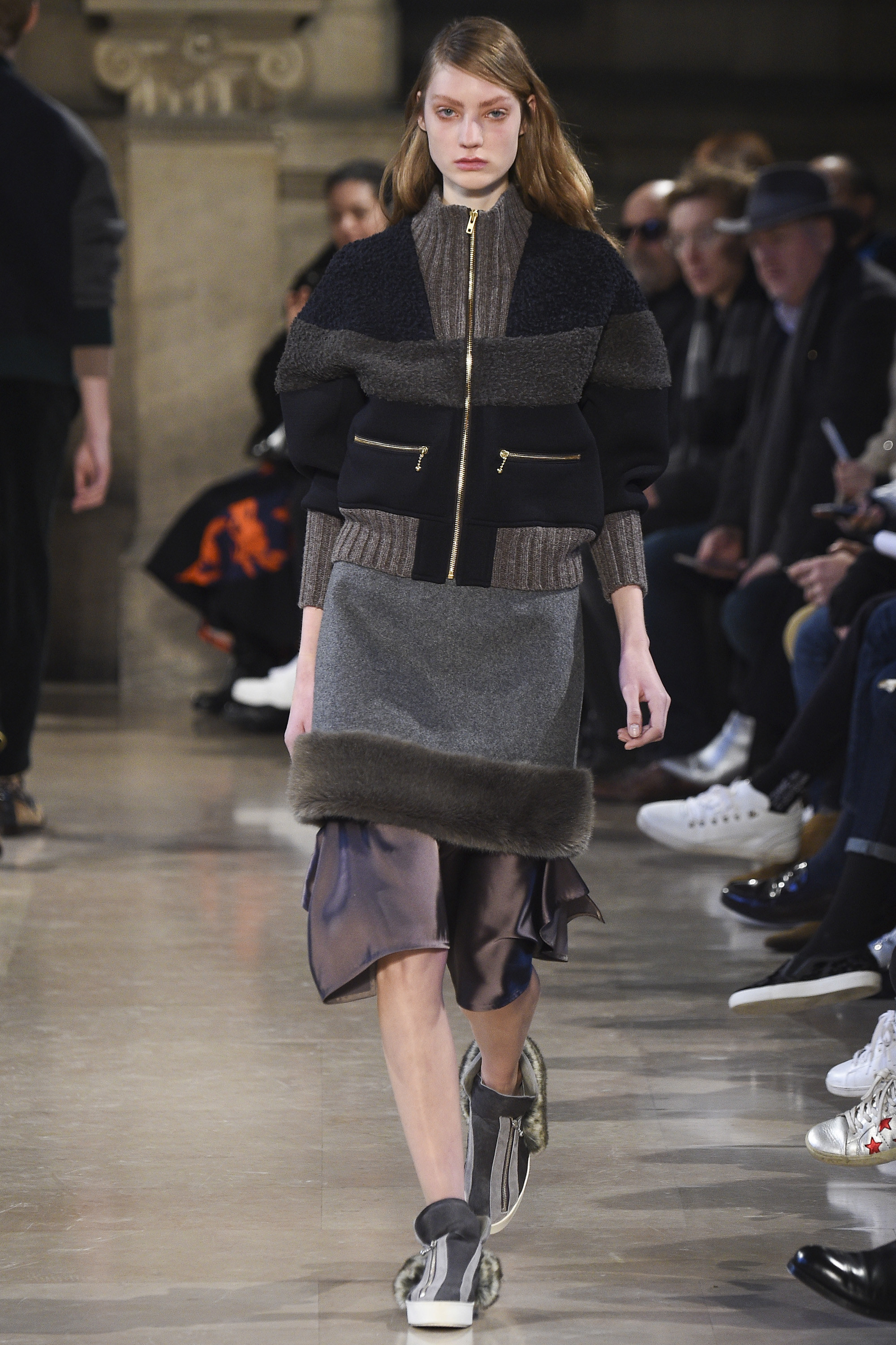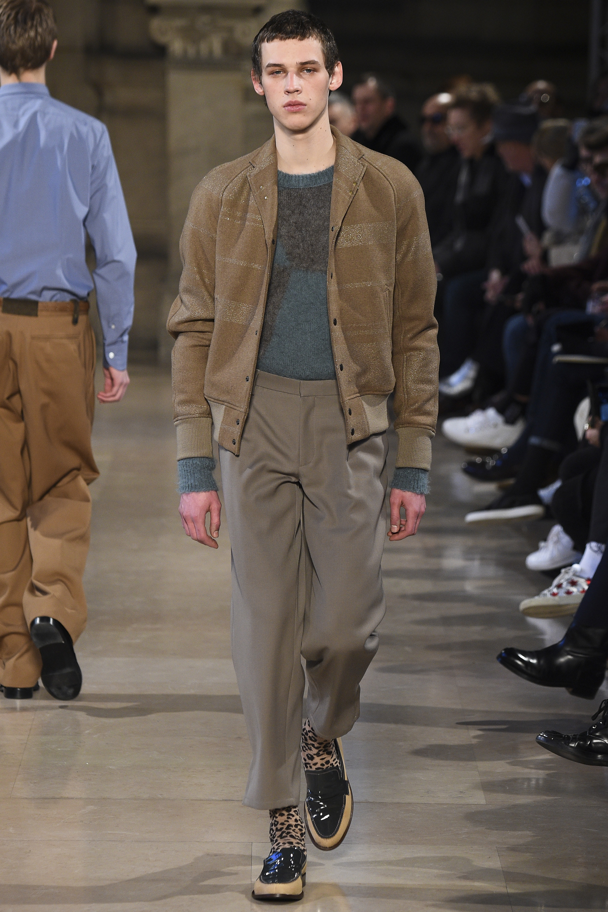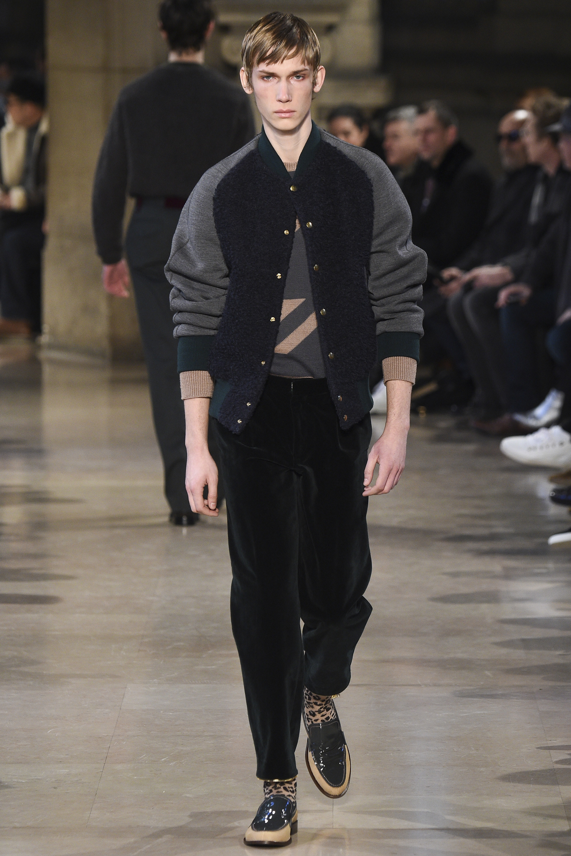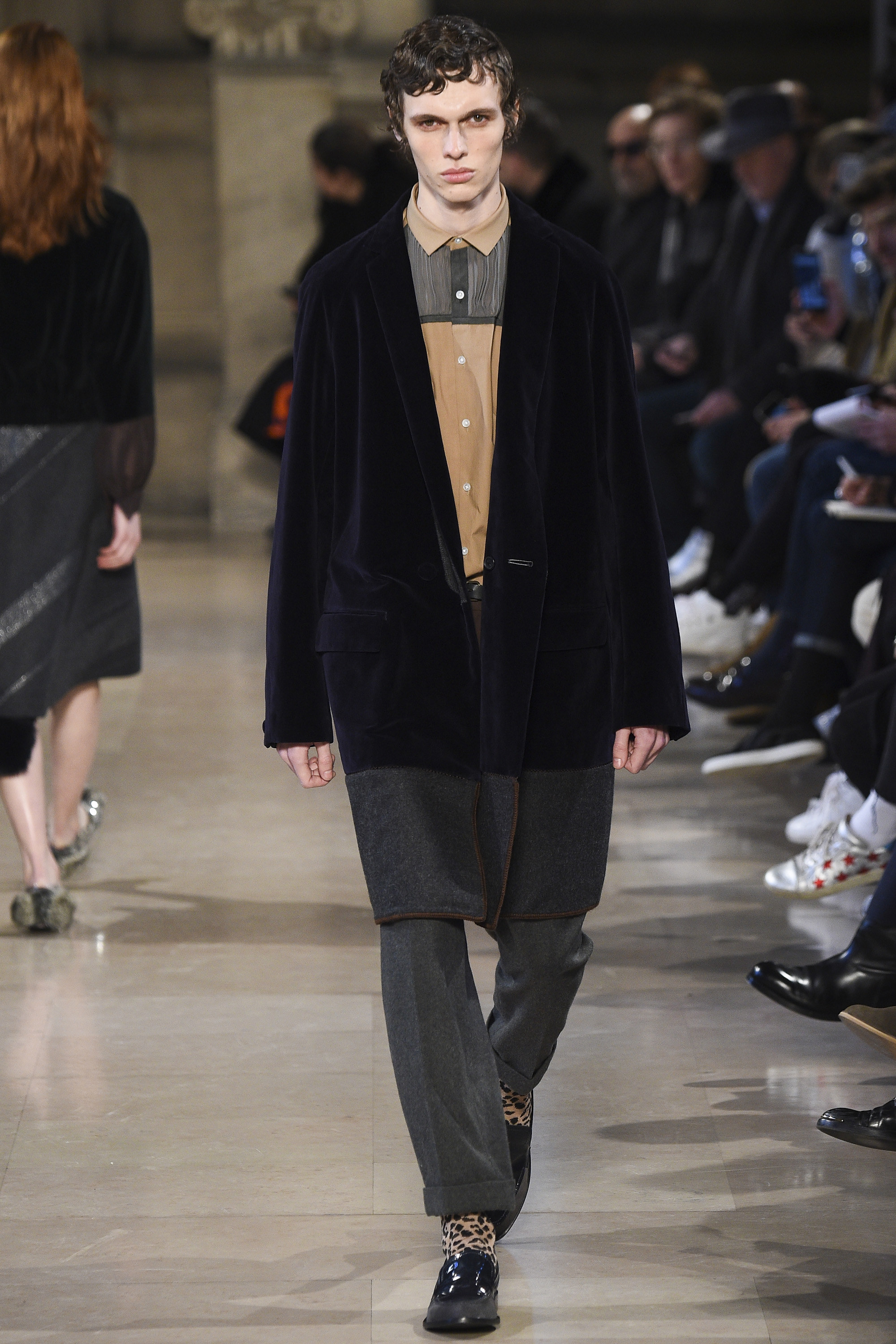 Abe balanced the lush details with softness and rawness, such as a plush wool fabric used for sweatshirts and varsity jackets; fluffy mohair patched with cable knit for chunky knitwear, or his signature jersey for relaxed tailored pants. But the surprise came with the variety of fits he offered, with tailored jackets offering new proportions, like a large boxy double-breasted one done in ultrasoft fabric worn over a collar-less tuxedo shirt. A more constructed jacket was cropped and worn over a ribbed knit cardigan. Inserted in the lineup were six women’s looks that played with the same elements and the balance between dressy and casual with more fur, more prints and more animal dots.