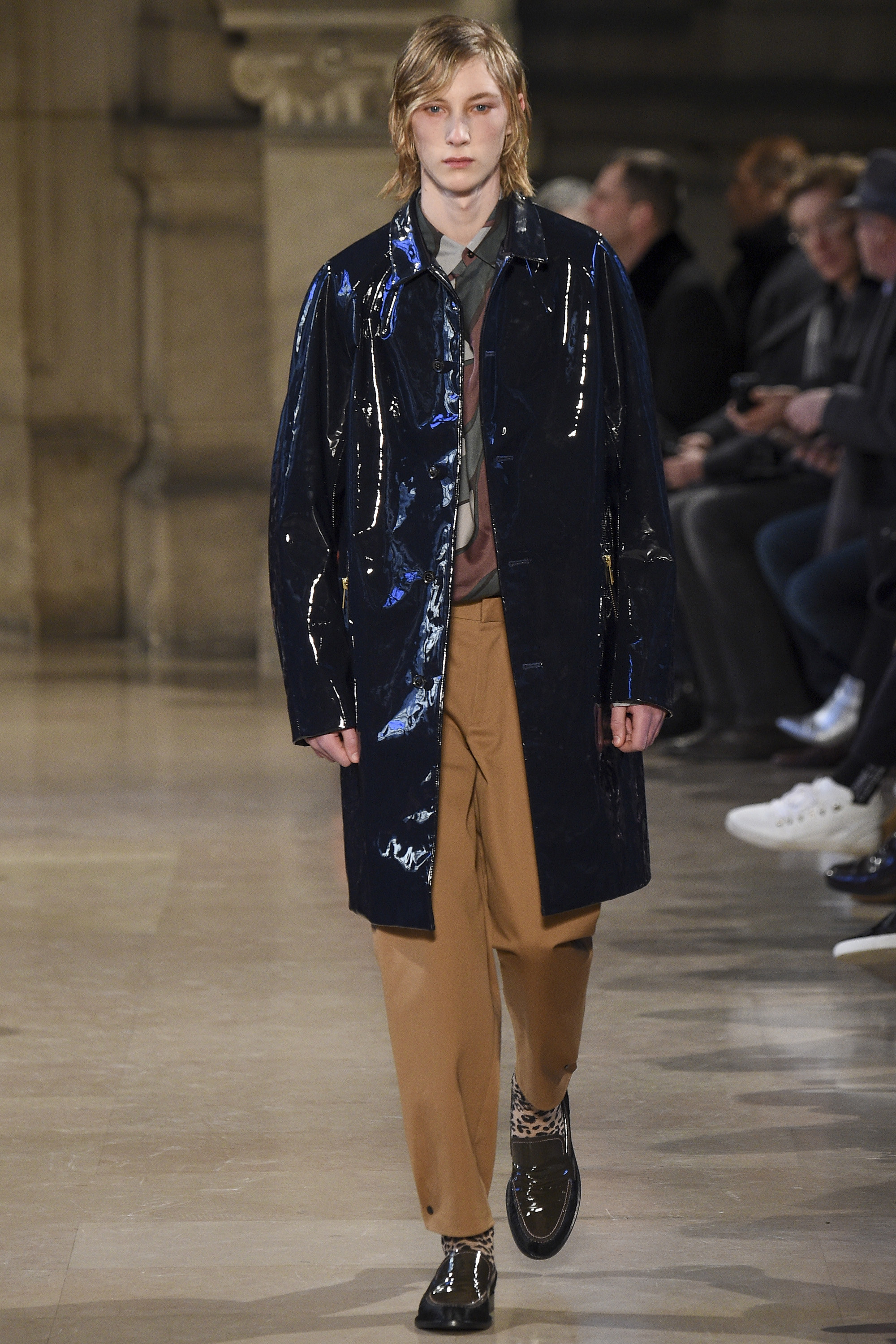 It was a mellow and dapper collection from Junichi Abe for his brand Kolor, and not only because of the warmth of the downbeat jazzy soundtrack — it was one of his best Kolor collections to date, full of nonchalant smartness. The show started with a tough, chic navy blue patent leather coat balanced by the soft beige of a tailored pant and the muted colors of a silk shirt. The look sent the message that Abe was in a glamorized mode, but the designer did it with a subtle touch and never fell into too precious of territory. Leopard dots came flocked on gray tailoring, such as down the belt of a pant or at the bottom of a roomy coat. Polka dots overprinted on a masculine cotton tartan shirt; dark ponyskin on the collars of checked coats and suits, and a Lurex tweed fabric inserted at the waistband of tailored flannel pants were some of the feminine elements spicing the collection, which was tinged with casual and sporty elements, giving them a dressy glaze.