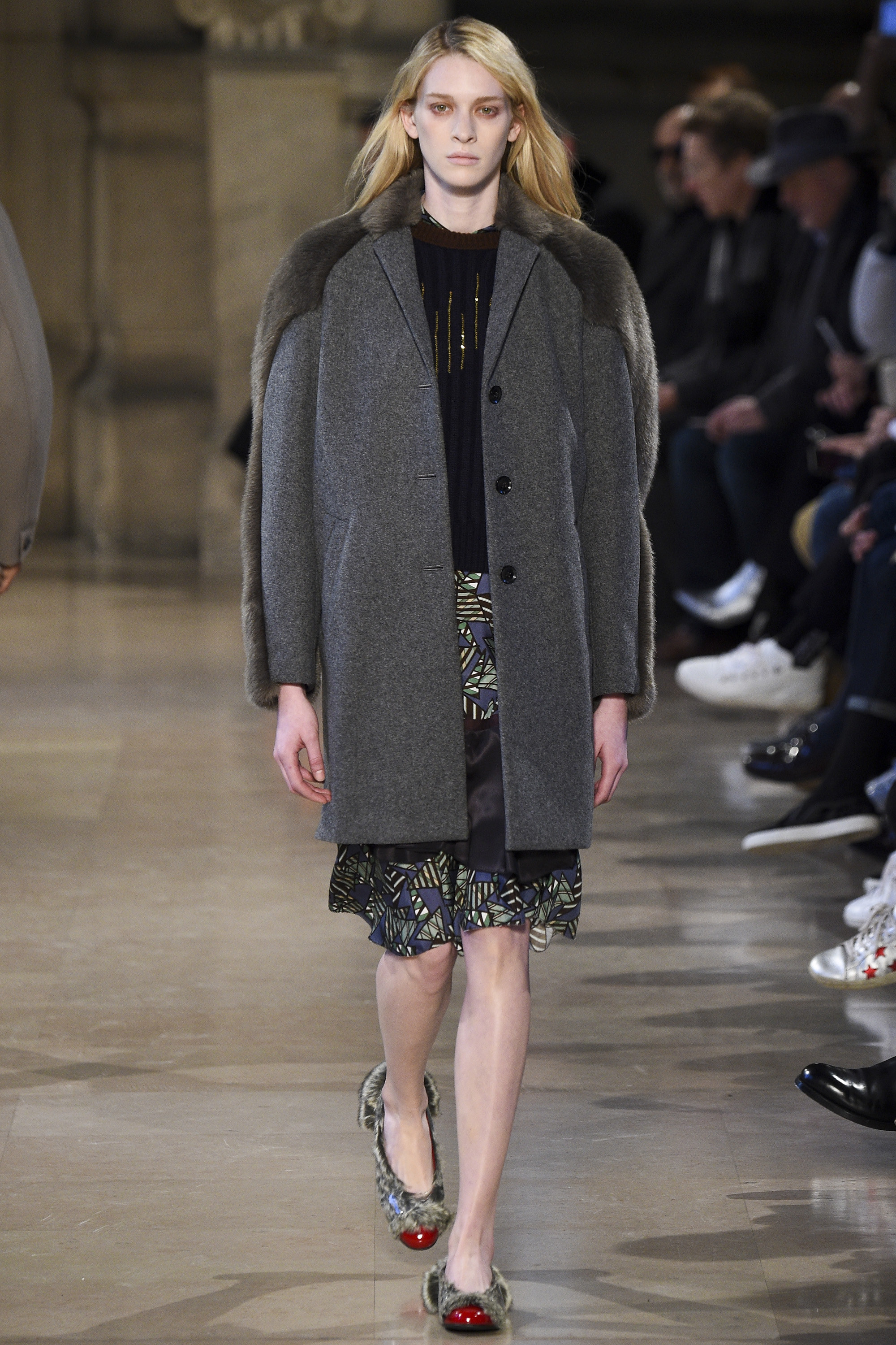 Abe balanced the lush details with softness and rawness, such as a plush wool fabric used for sweatshirts and varsity jackets; fluffy mohair patched with cable knit for chunky knitwear, or his signature jersey for relaxed tailored pants. But the surprise came with the variety of fits he offered, with tailored jackets offering new proportions, like a large boxy double-breasted one done in ultrasoft fabric worn over a collar-less tuxedo shirt. A more constructed jacket was cropped and worn over a ribbed knit cardigan. Inserted in the lineup were six women’s looks that played with the same elements and the balance between dressy and casual with more fur, more prints and more animal dots.
