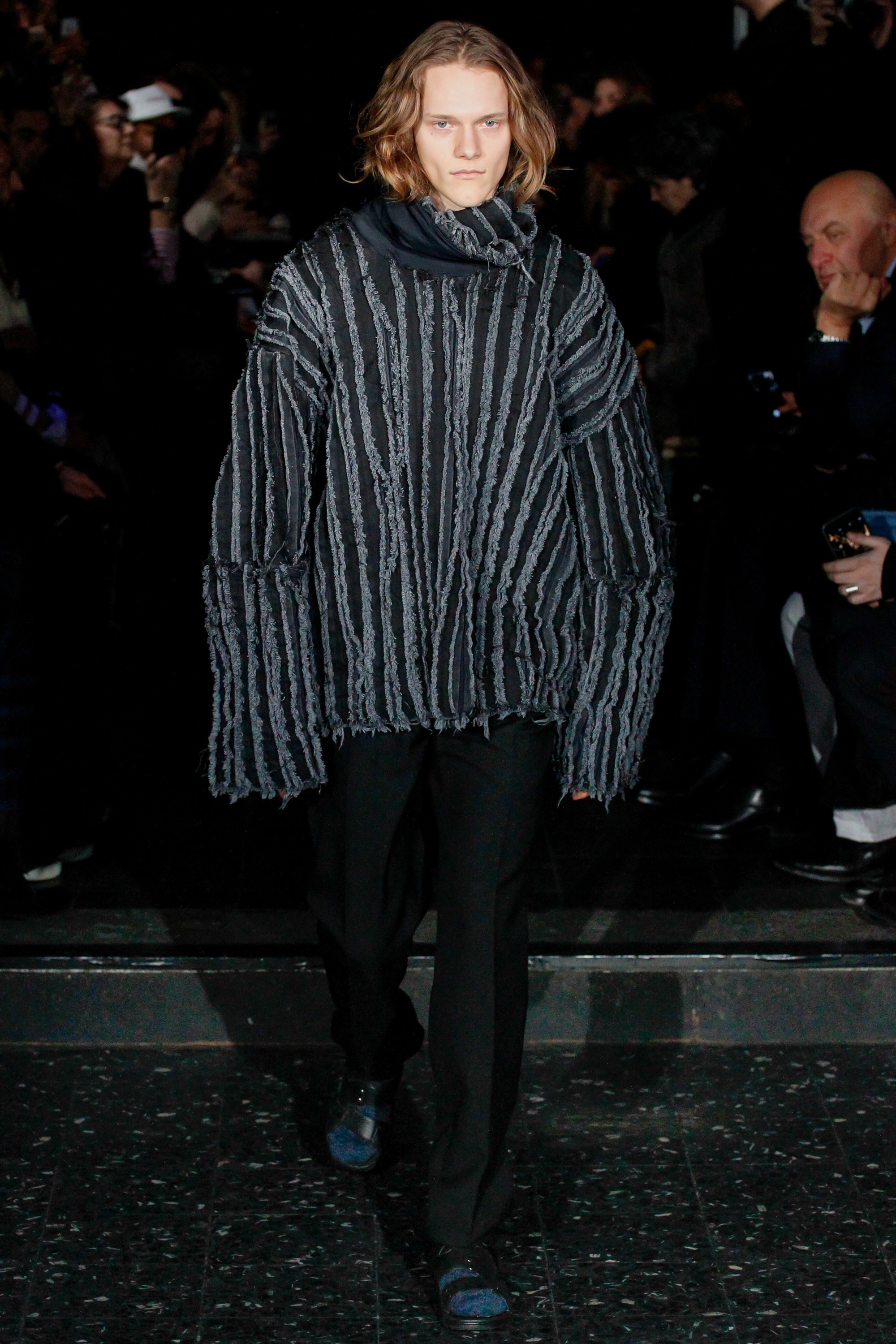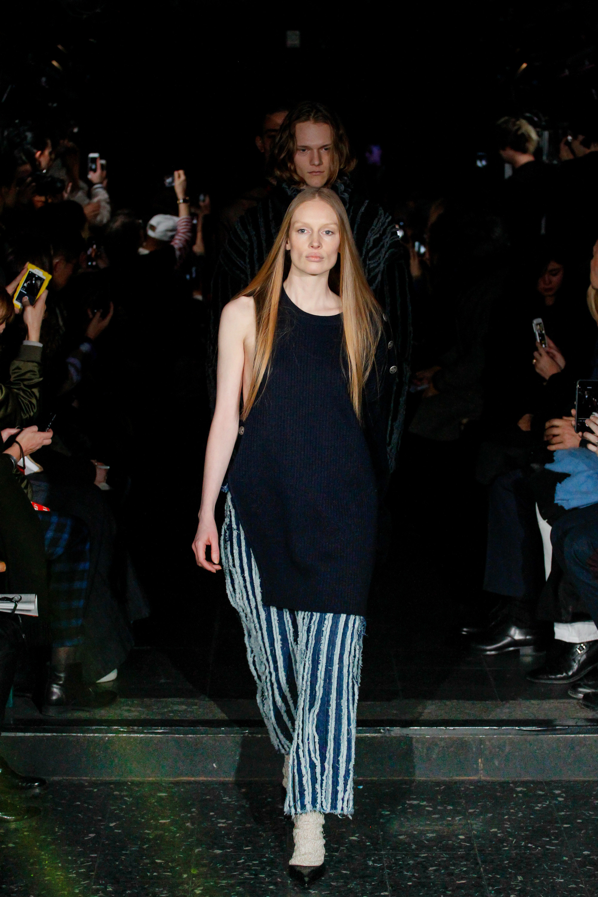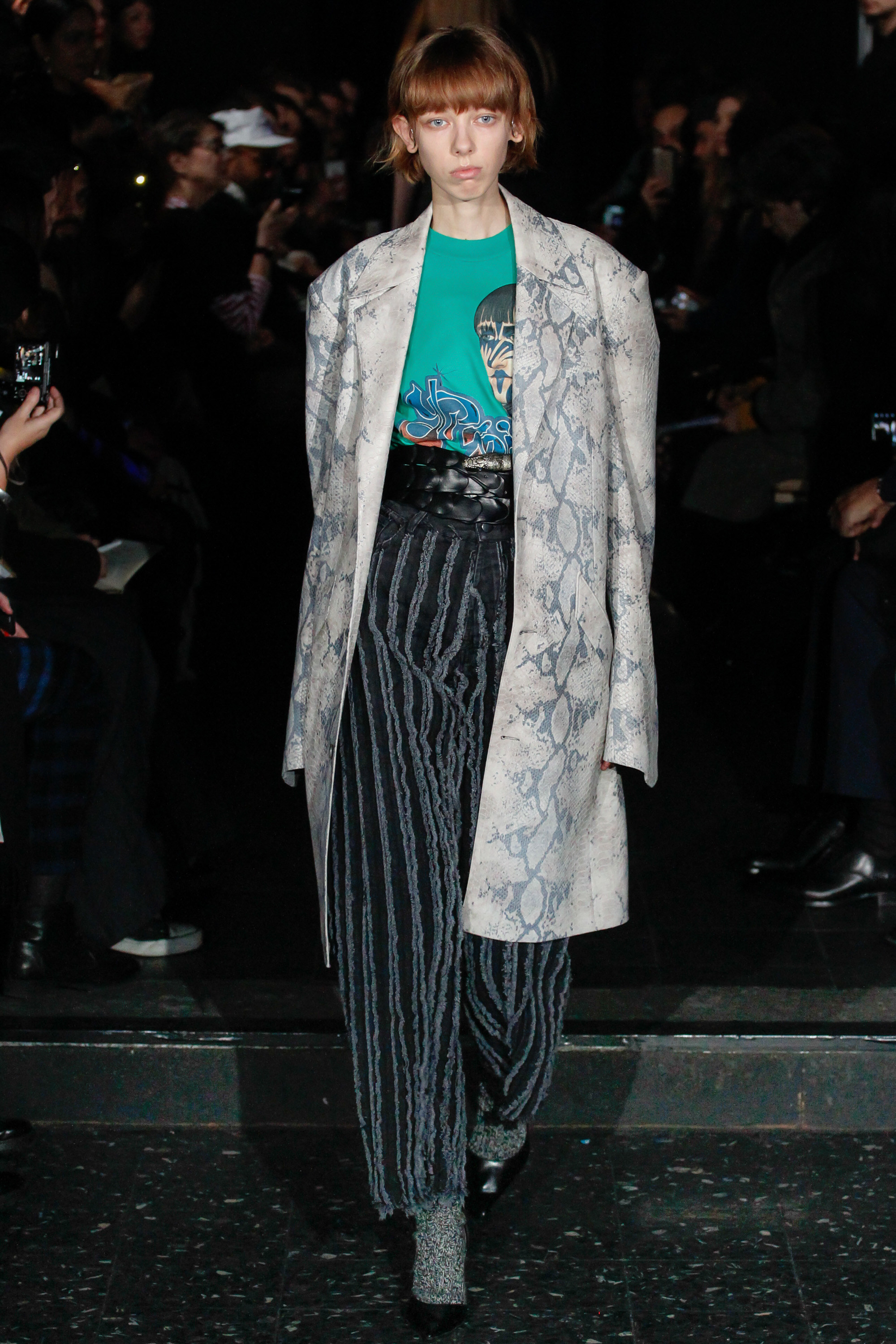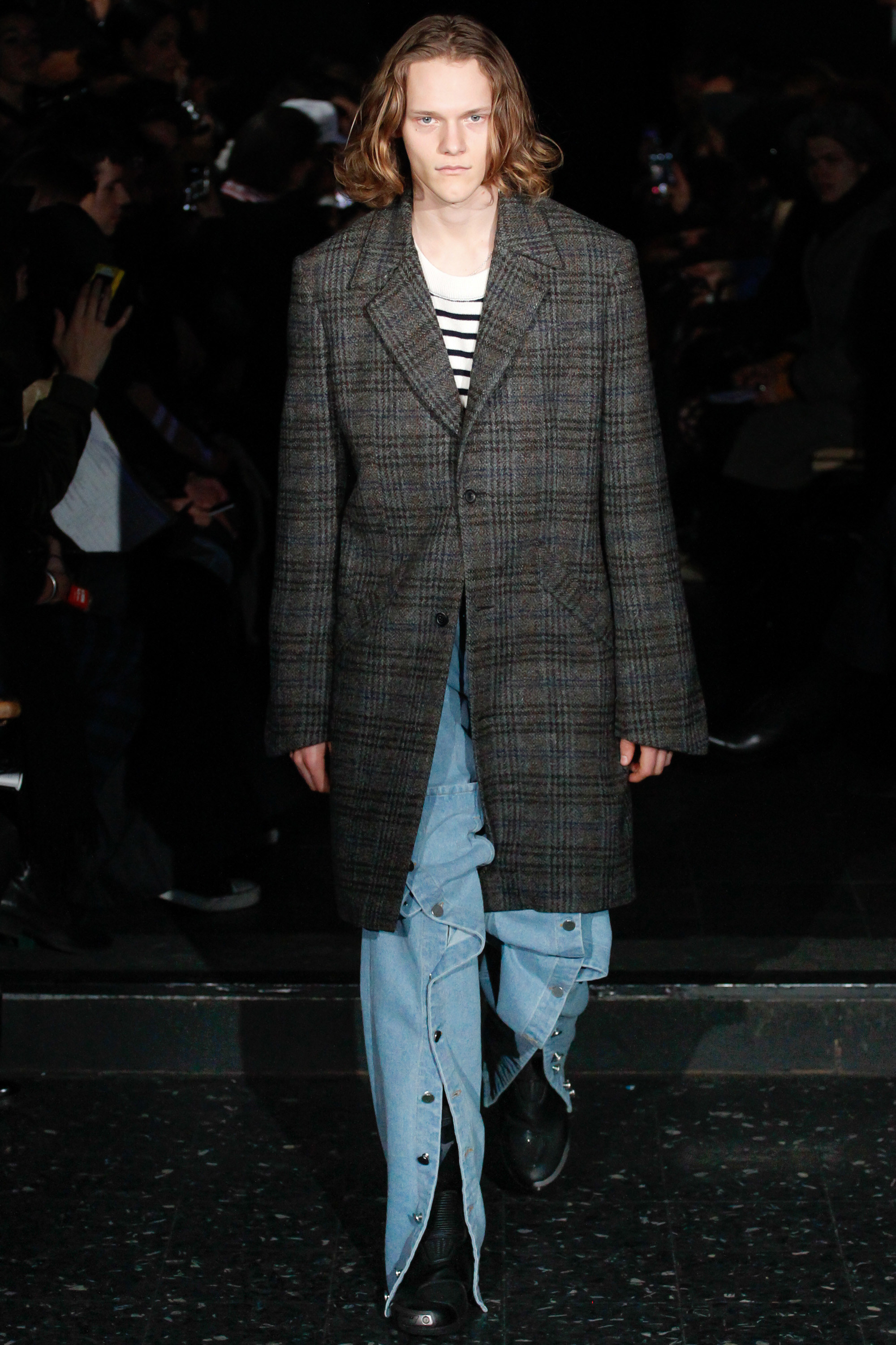The chief issue with a “schizophrenic” collection is that it excuses Martens of reconciling the disparate parts, so that the broad-appeal outerwear—whether in Harris tweed or composed of shearling strips, each edge exposed—never quite aligned with rose-embroidered mesh shirts or fake snakeskin pants. Still, it’s worth noting that Y/Project was an early champion of gender ambiguity, and maybe this is where the bolder pieces belong. After asking an editor seatmate whether she believed guys would sport the chaps, she replied, “No, but girls might.”