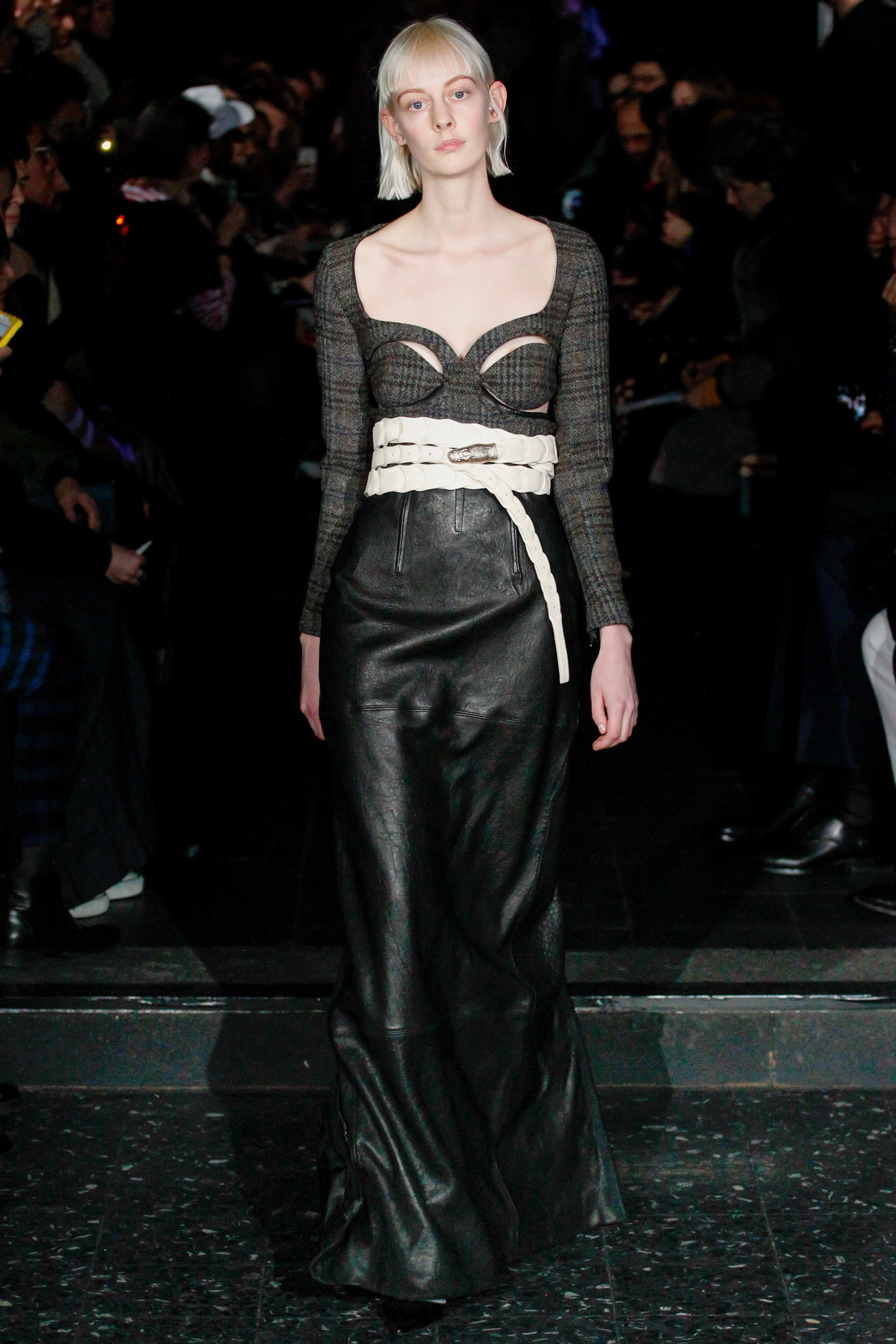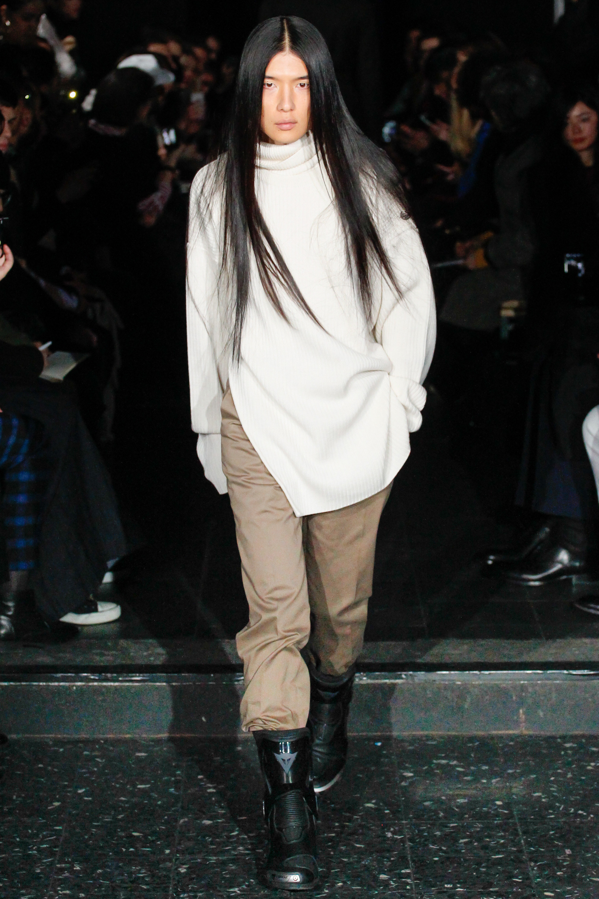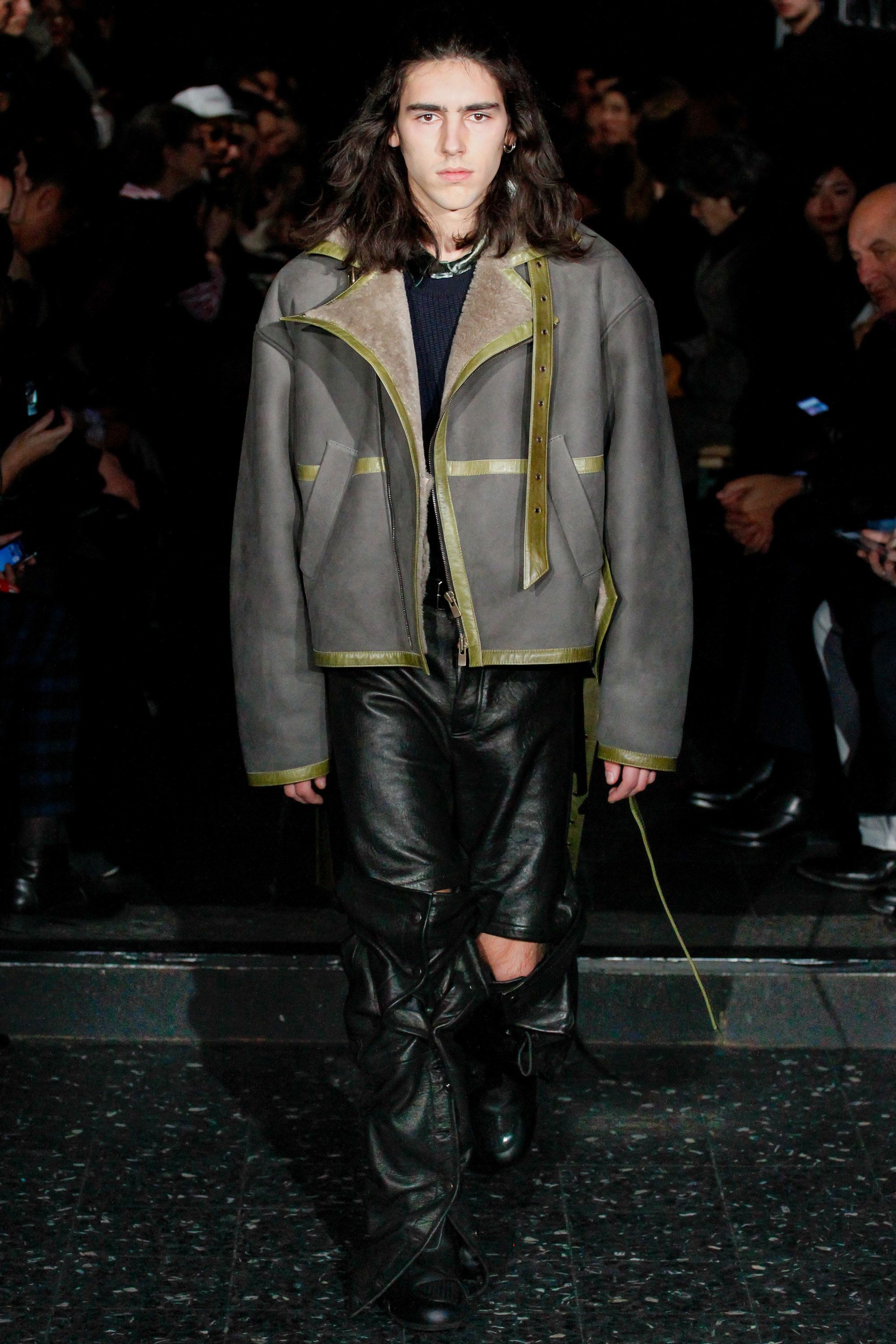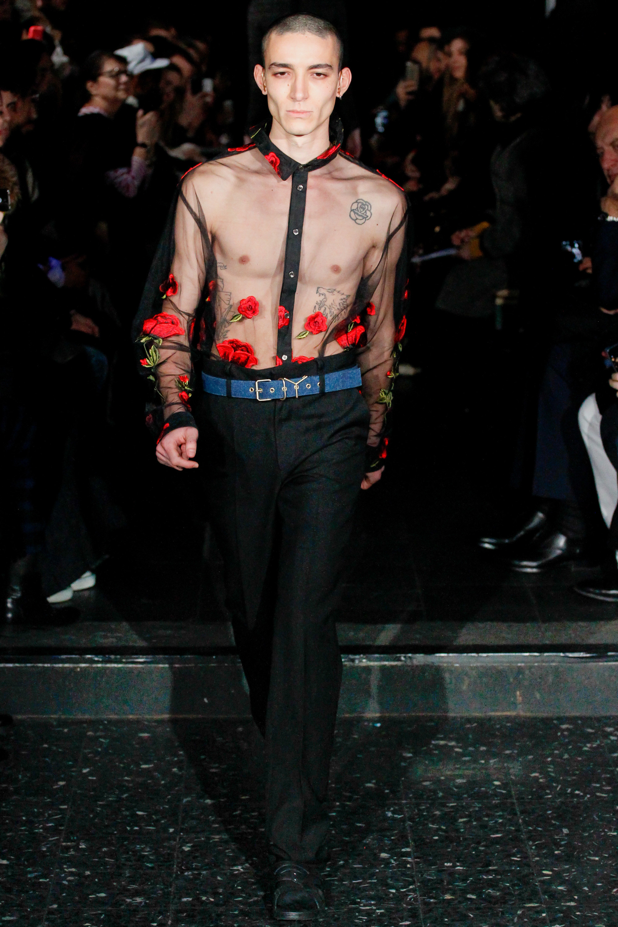 The chief issue with a “schizophrenic” collection is that it excuses Martens of reconciling the disparate parts, so that the broad-appeal outerwear—whether in Harris tweed or composed of shearling strips, each edge exposed—never quite aligned with rose-embroidered mesh shirts or fake snakeskin pants. Still, it’s worth noting that Y/Project was an early champion of gender ambiguity, and maybe this is where the bolder pieces belong. After asking an editor seatmate whether she believed guys would sport the chaps, she replied, “No, but girls might.”