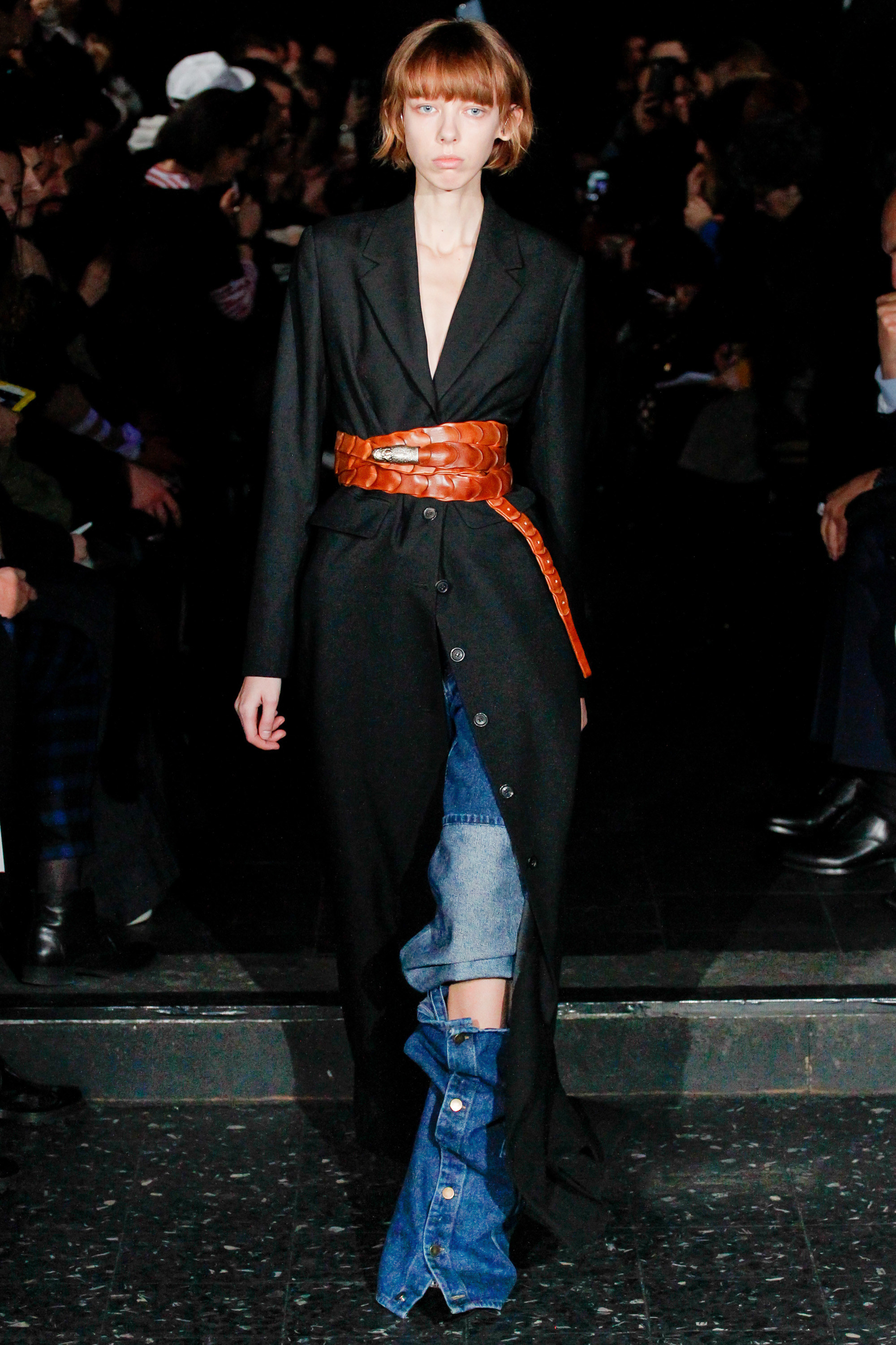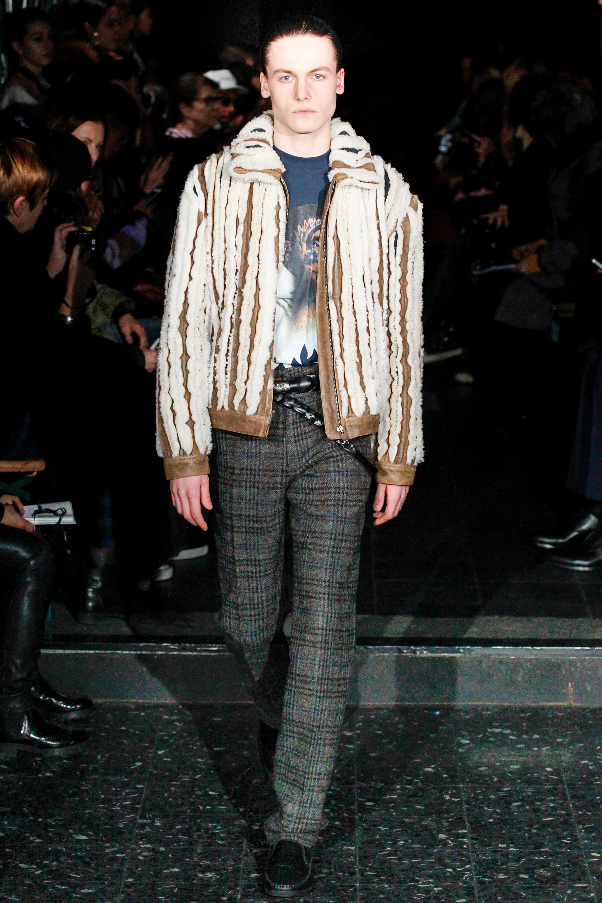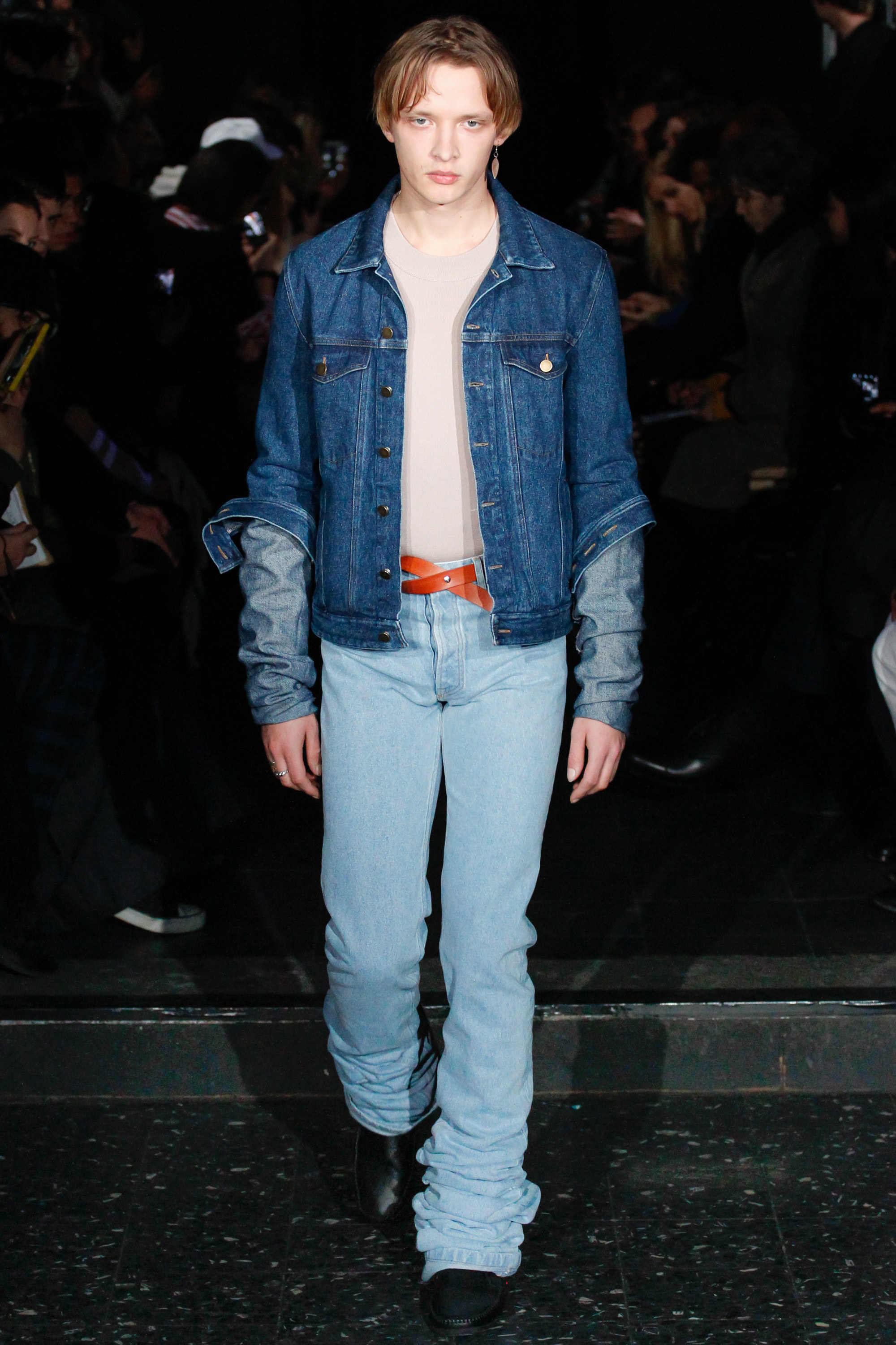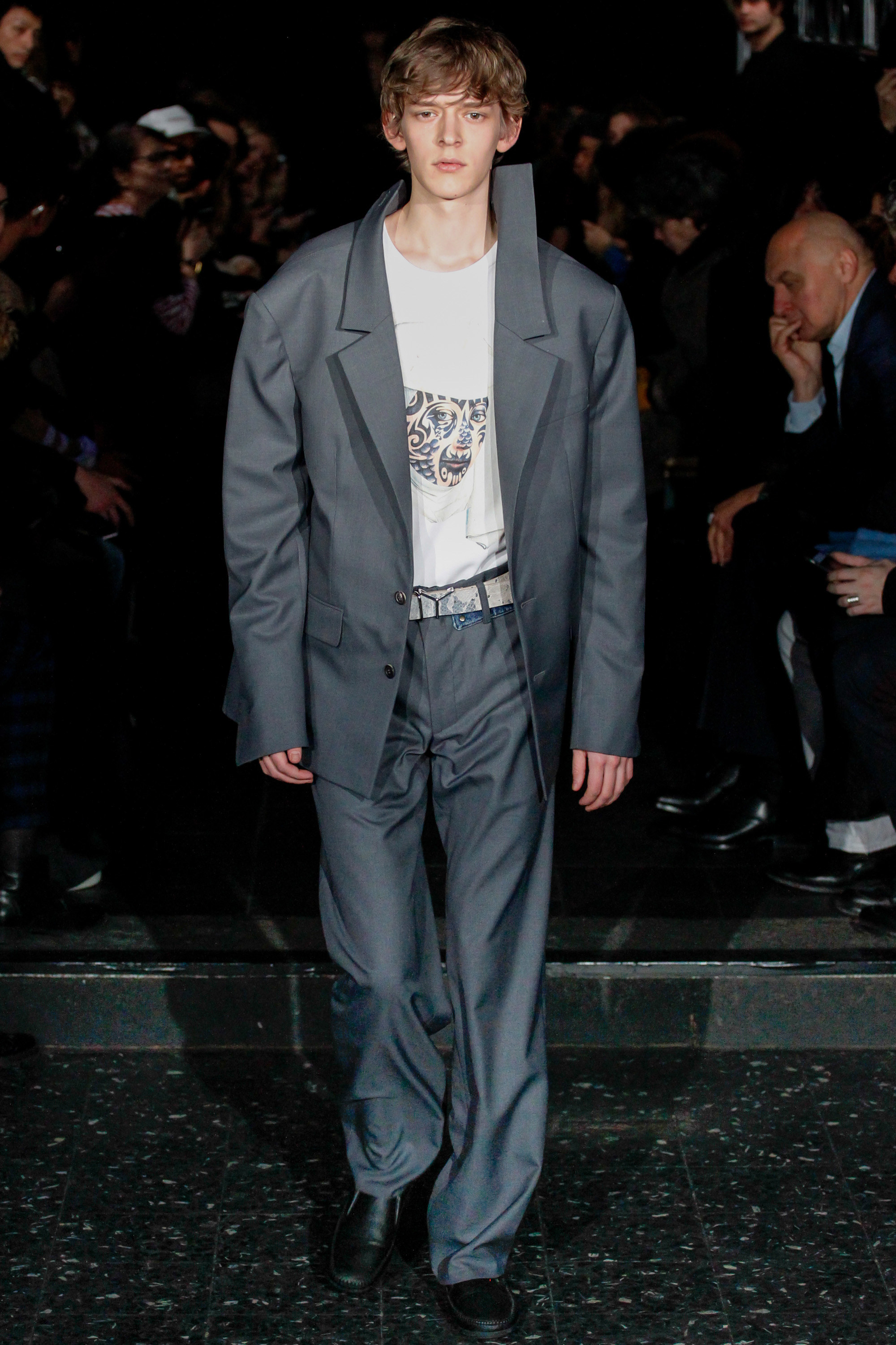 When he related this point of view to the collection, naming all the miscellaneous references—from medieval to streetwear—it sounded more as if he were referring to dissociative identity disorder; but his point about “the freedom to do whatever we want” seemed fair enough. It certainly explained the denim chaps paired with a skin-toned turtleneck and a leather jacket held up by shoulder straps. Even removed from the subterranean concert venue, the collection oozed underground strangeness, seducing at certain moments (a comparatively conservative tunic sweater and khaki pants) and repelling at others (the high-waisted jeans will be a tough sell). Extra-long pants that collapsed at the ankles and surrealistically ill-fitting suits seemed to have been sucked into aTrainspotting trip—or else, let’s just dub them abnormcore. Yet unhinged need not mean unwearable: T-shirts, while largely hidden, featured brilliantly defaced 15th-century Flemish portraits with striking tattoo motifs. They should be sold in museum gift shops.