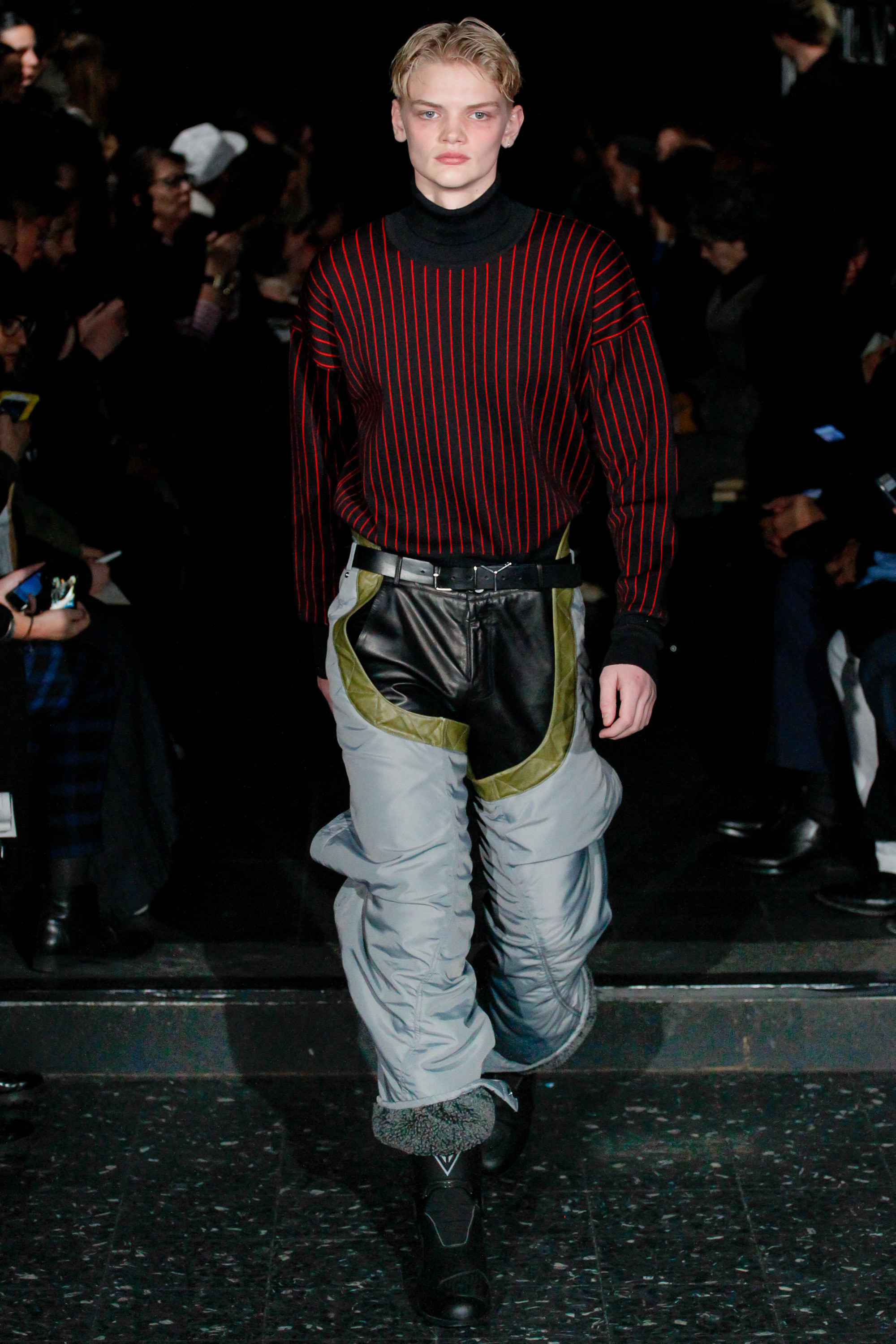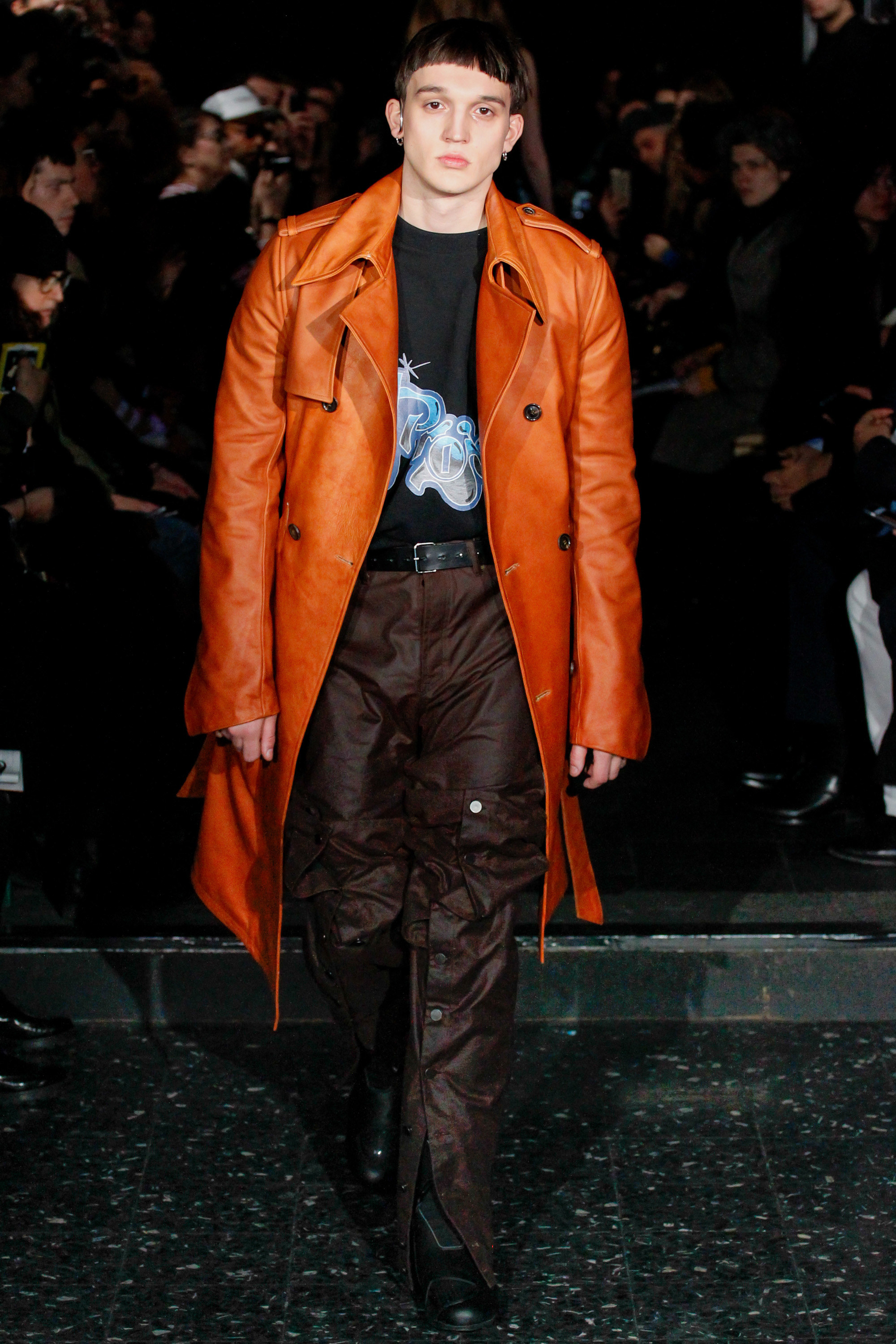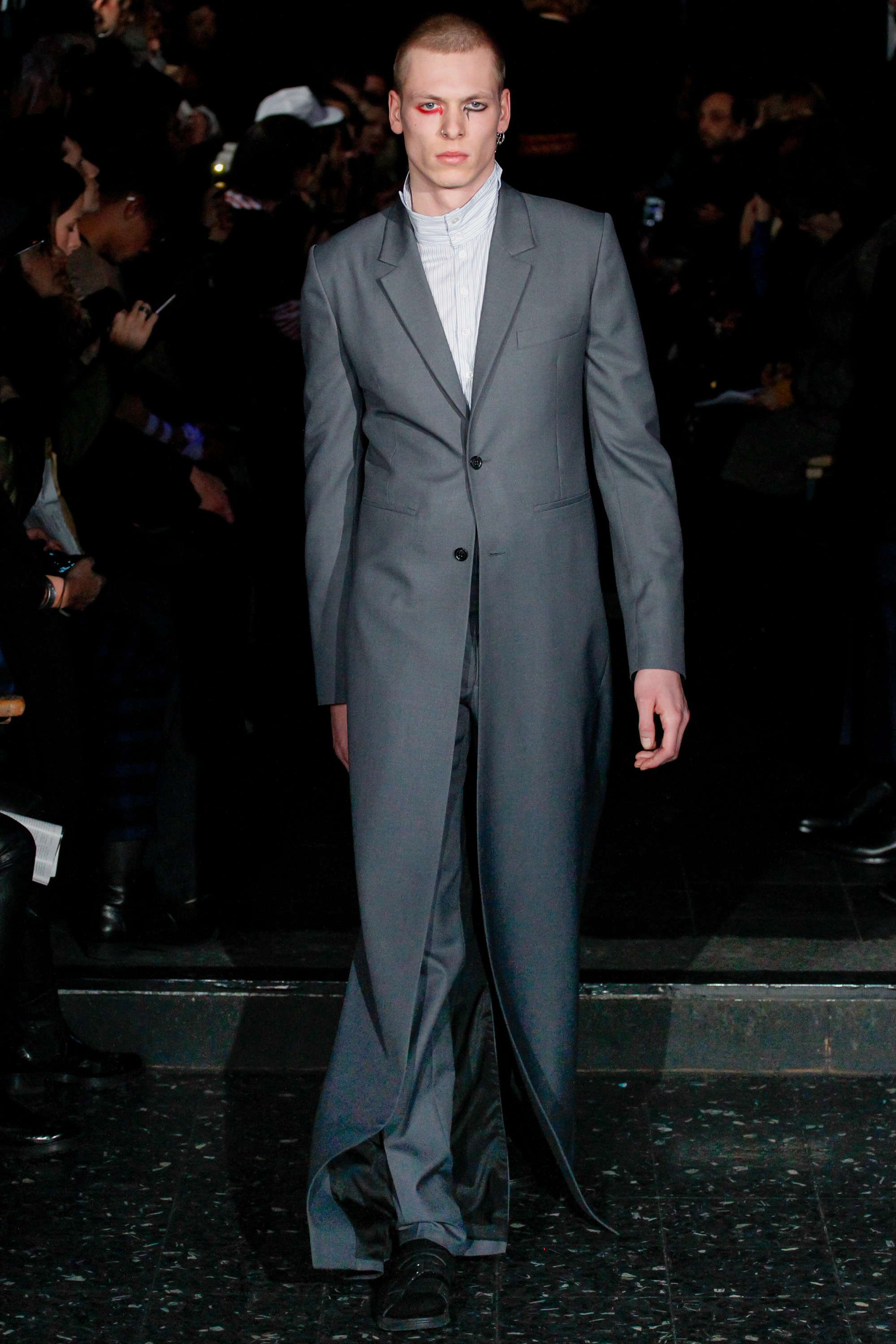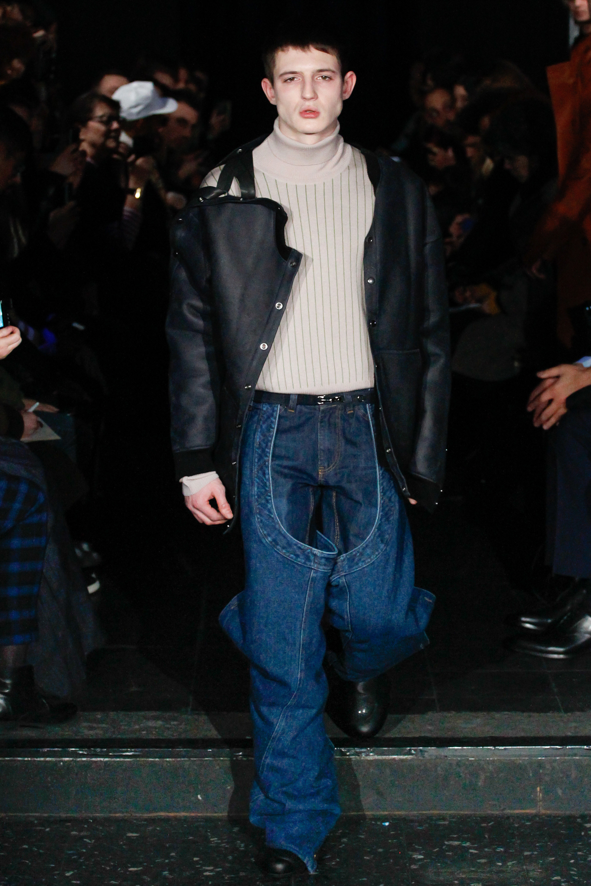 When he related this point of view to the collection, naming all the miscellaneous references—from medieval to streetwear—it sounded more as if he were referring to dissociative identity disorder; but his point about “the freedom to do whatever we want” seemed fair enough. It certainly explained the denim chaps paired with a skin-toned turtleneck and a leather jacket held up by shoulder straps. Even removed from the subterranean concert venue, the collection oozed underground strangeness, seducing at certain moments (a comparatively conservative tunic sweater and khaki pants) and repelling at others (the high-waisted jeans will be a tough sell). Extra-long pants that collapsed at the ankles and surrealistically ill-fitting suits seemed to have been sucked into aTrainspotting trip—or else, let’s just dub them abnormcore. Yet unhinged need not mean unwearable: T-shirts, while largely hidden, featured brilliantly defaced 15th-century Flemish portraits with striking tattoo motifs. They should be sold in museum gift shops.