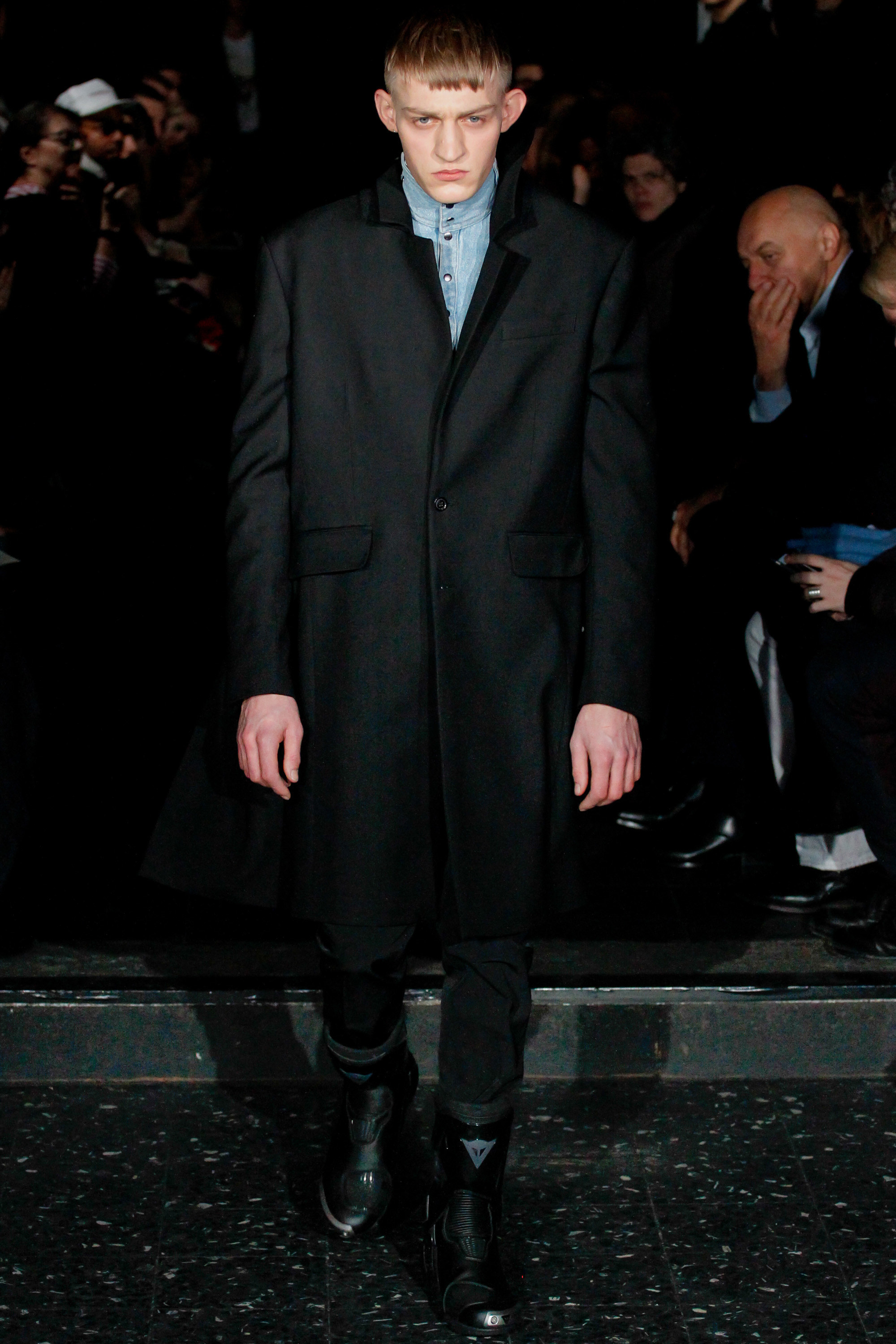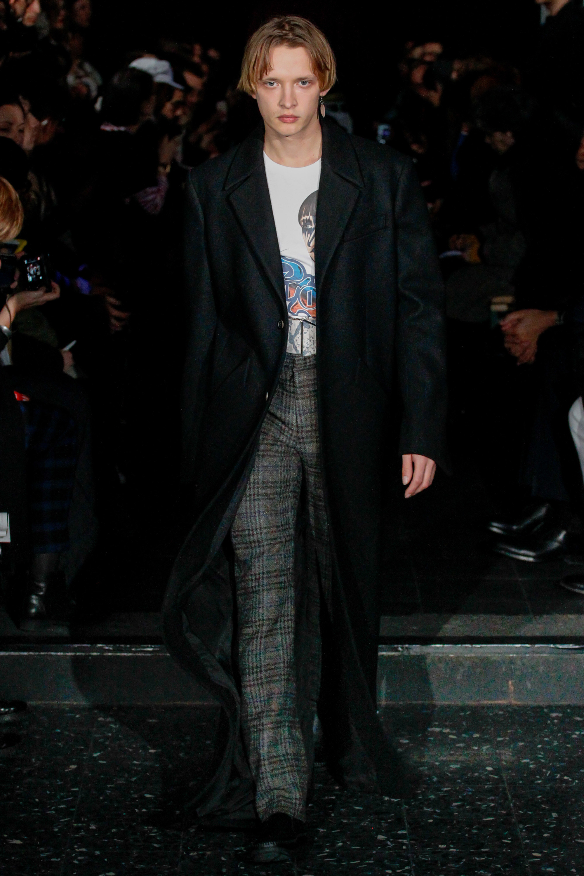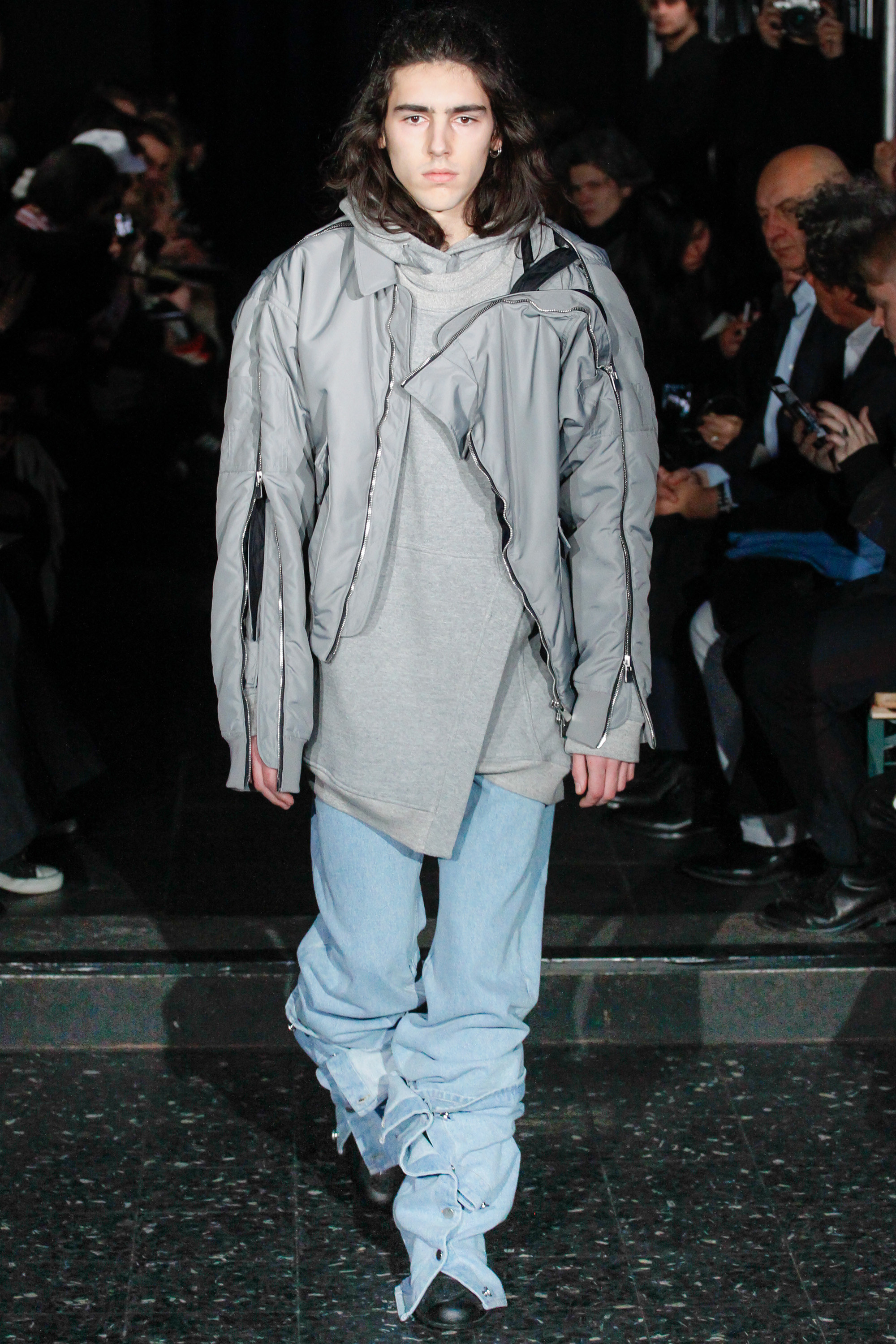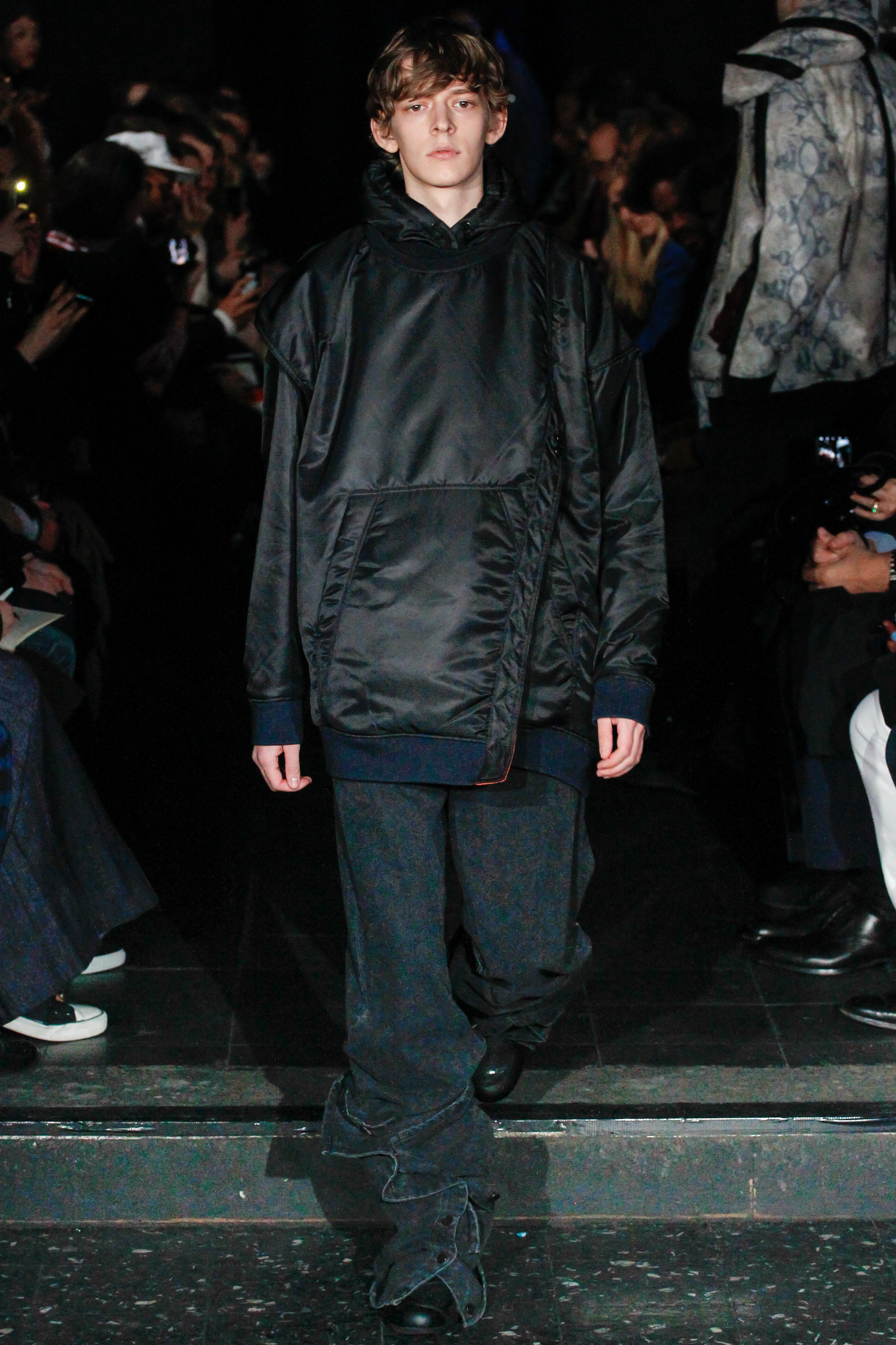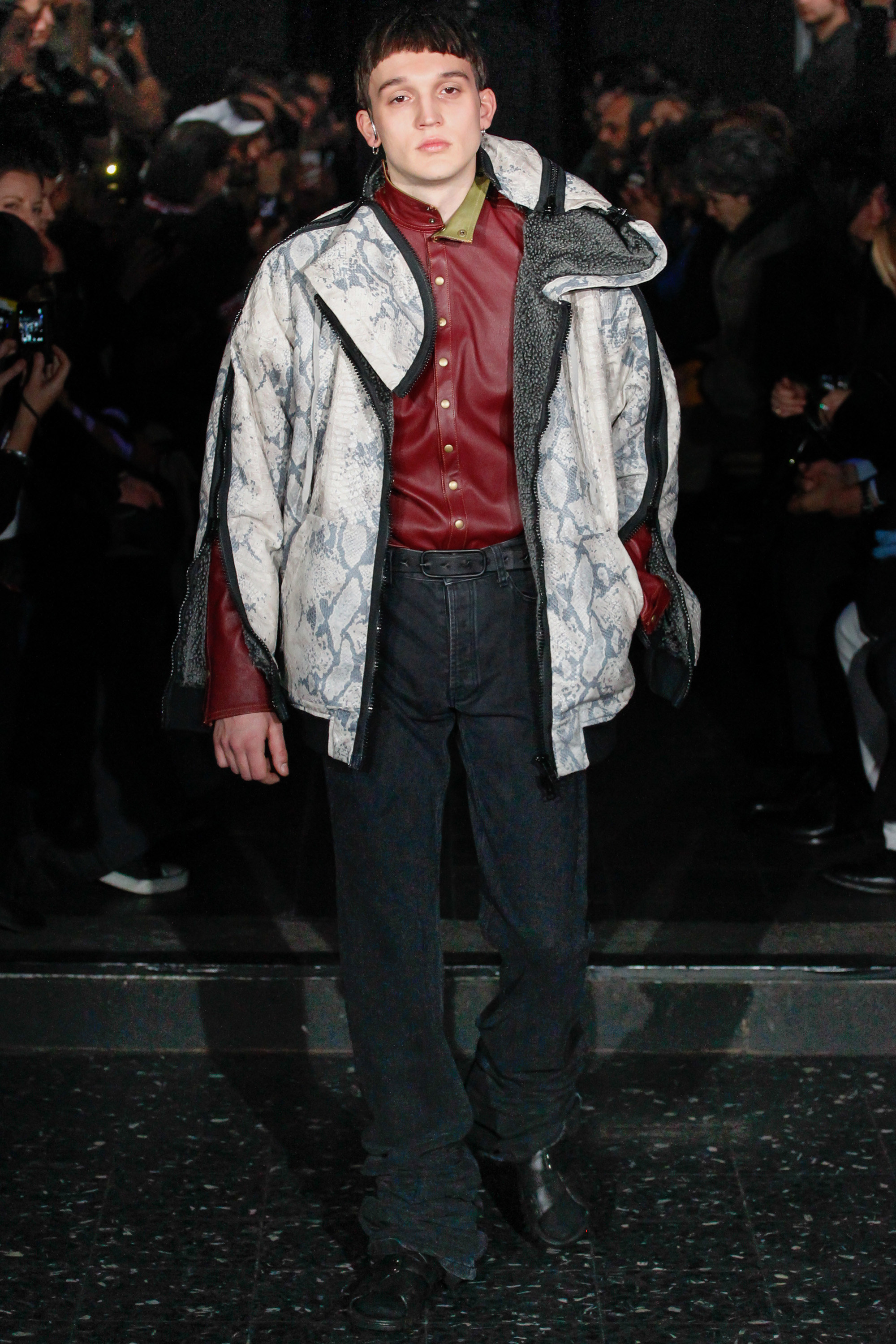 When he related this point of view to the collection, naming all the miscellaneous references—from medieval to streetwear—it sounded more as if he were referring to dissociative identity disorder; but his point about “the freedom to do whatever we want” seemed fair enough. It certainly explained the denim chaps paired with a skin-toned turtleneck and a leather jacket held up by shoulder straps. Even removed from the subterranean concert venue, the collection oozed underground strangeness, seducing at certain moments (a comparatively conservative tunic sweater and khaki pants) and repelling at others (the high-waisted jeans will be a tough sell). Extra-long pants that collapsed at the ankles and surrealistically ill-fitting suits seemed to have been sucked into aTrainspotting trip—or else, let’s just dub them abnormcore. Yet unhinged need not mean unwearable: T-shirts, while largely hidden, featured brilliantly defaced 15th-century Flemish portraits with striking tattoo motifs. They should be sold in museum gift shops.