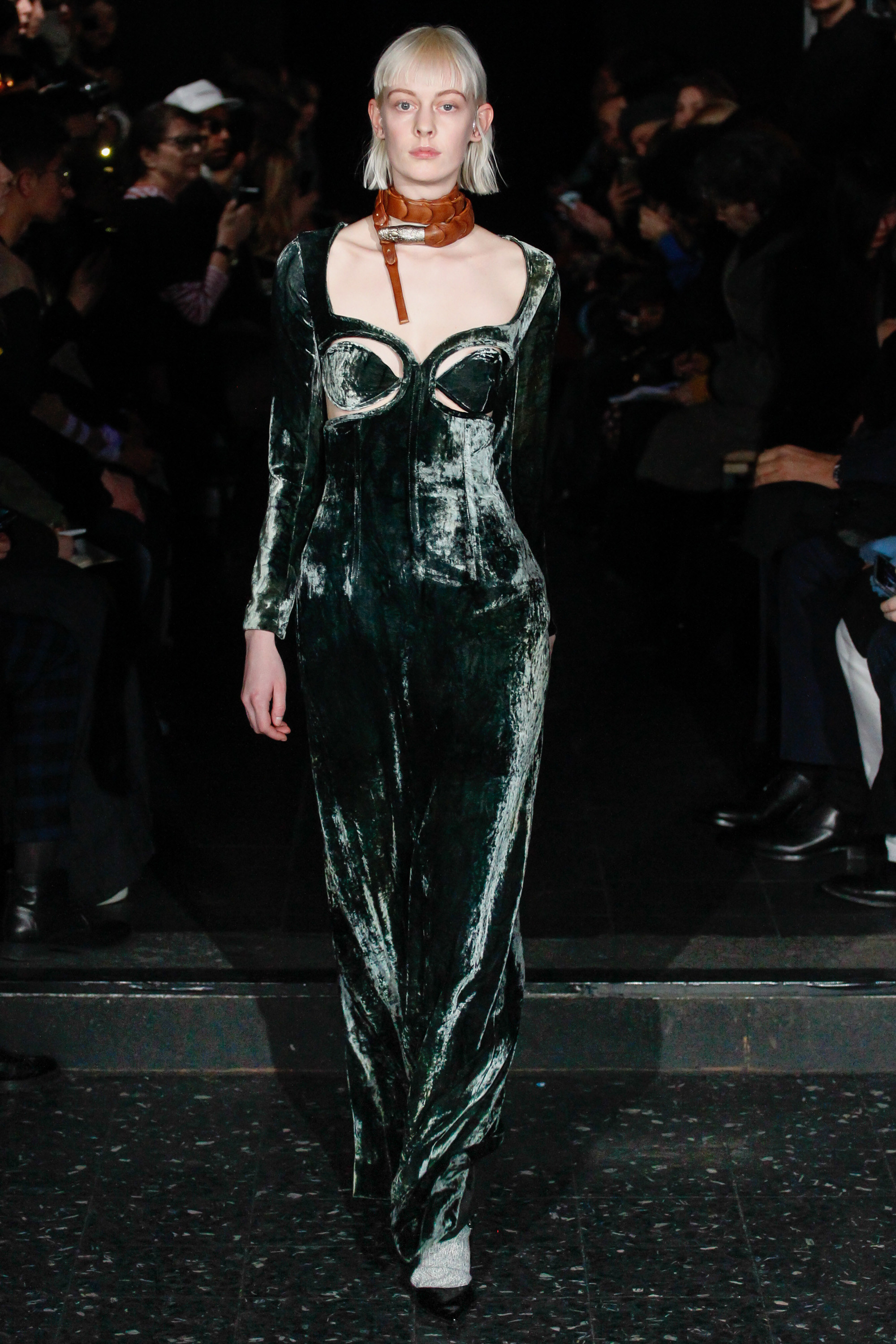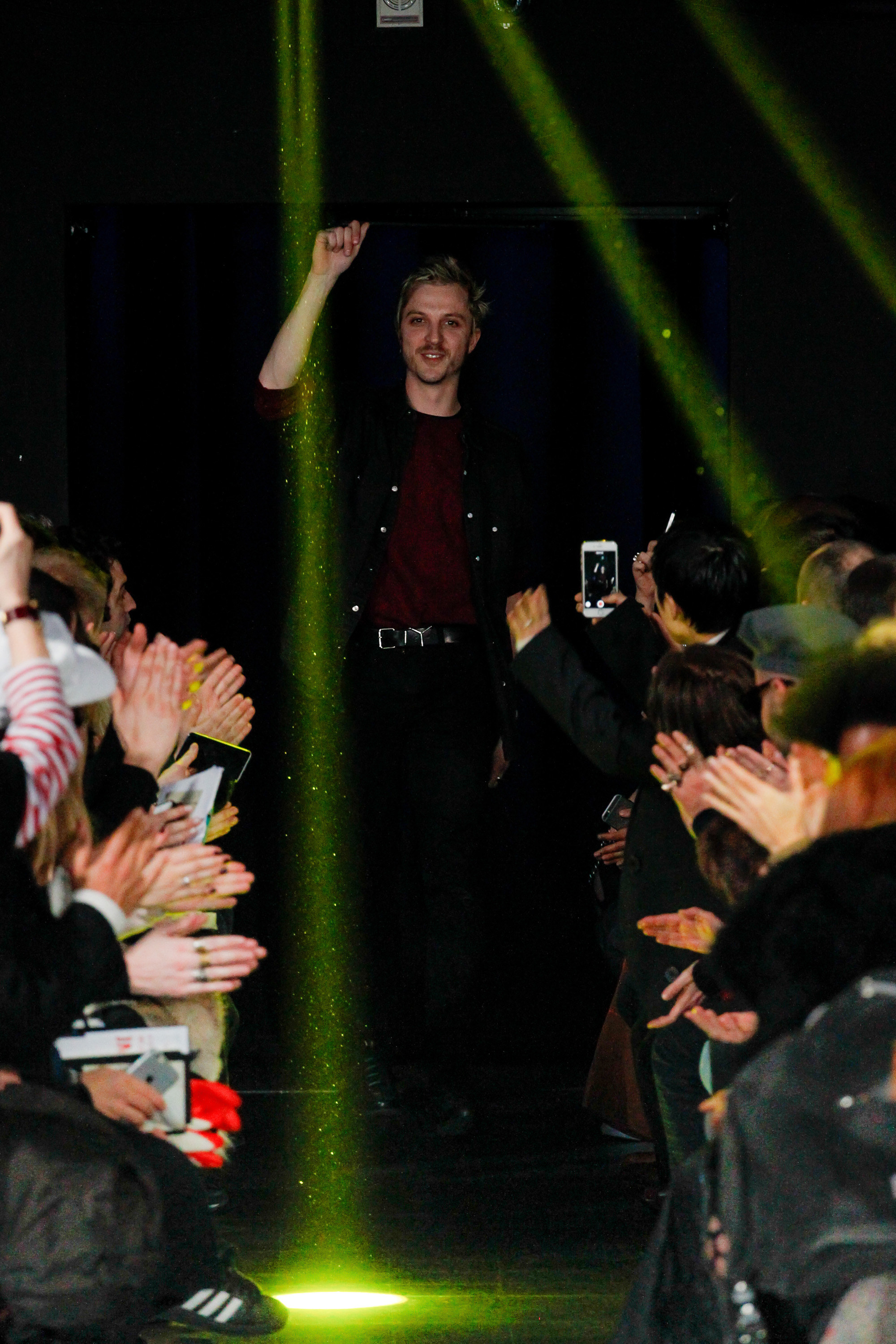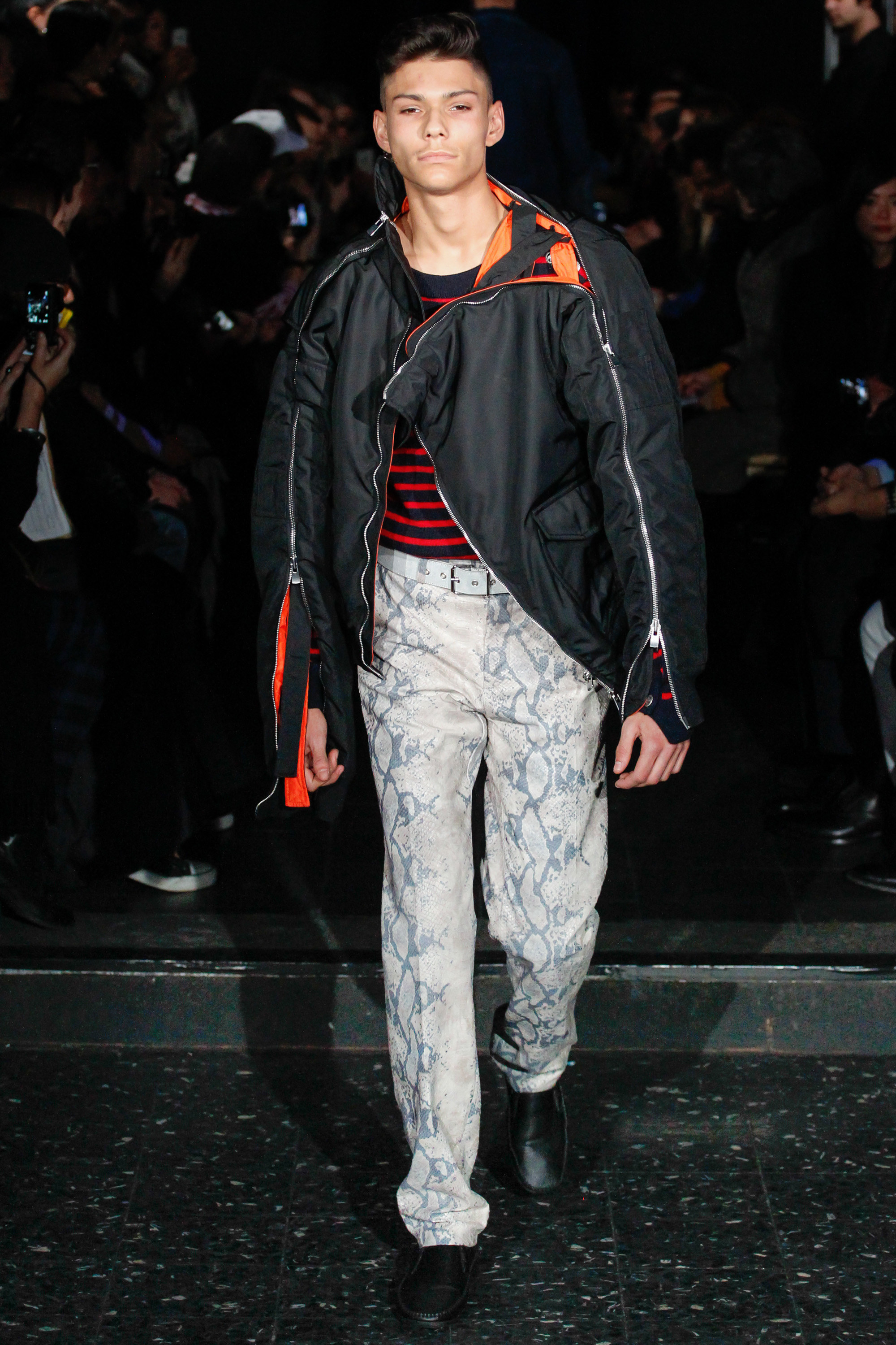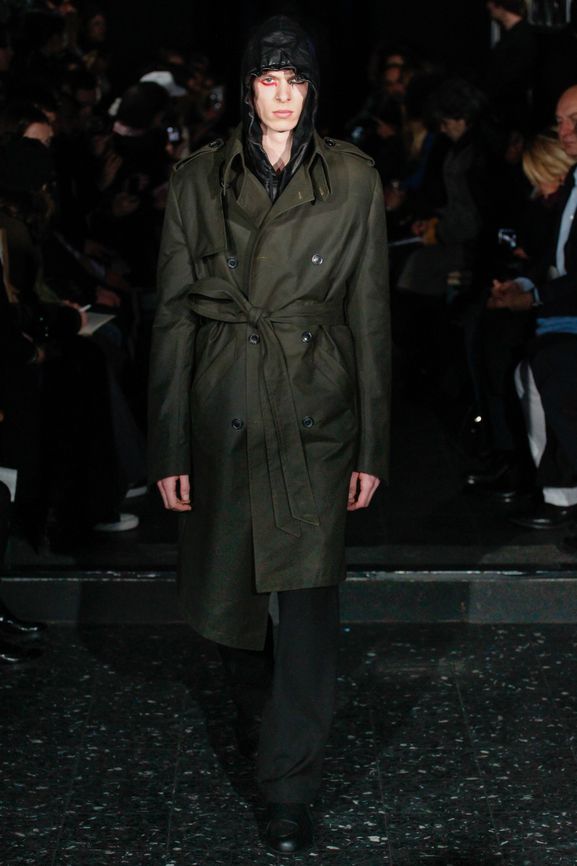 When he related this point of view to the collection, naming all the miscellaneous references—from medieval to streetwear—it sounded more as if he were referring to dissociative identity disorder; but his point about “the freedom to do whatever we want” seemed fair enough. It certainly explained the denim chaps paired with a skin-toned turtleneck and a leather jacket held up by shoulder straps. Even removed from the subterranean concert venue, the collection oozed underground strangeness, seducing at certain moments (a comparatively conservative tunic sweater and khaki pants) and repelling at others (the high-waisted jeans will be a tough sell). Extra-long pants that collapsed at the ankles and surrealistically ill-fitting suits seemed to have been sucked into aTrainspotting trip—or else, let’s just dub them abnormcore. Yet unhinged need not mean unwearable: T-shirts, while largely hidden, featured brilliantly defaced 15th-century Flemish portraits with striking tattoo motifs. They should be sold in museum gift shops.