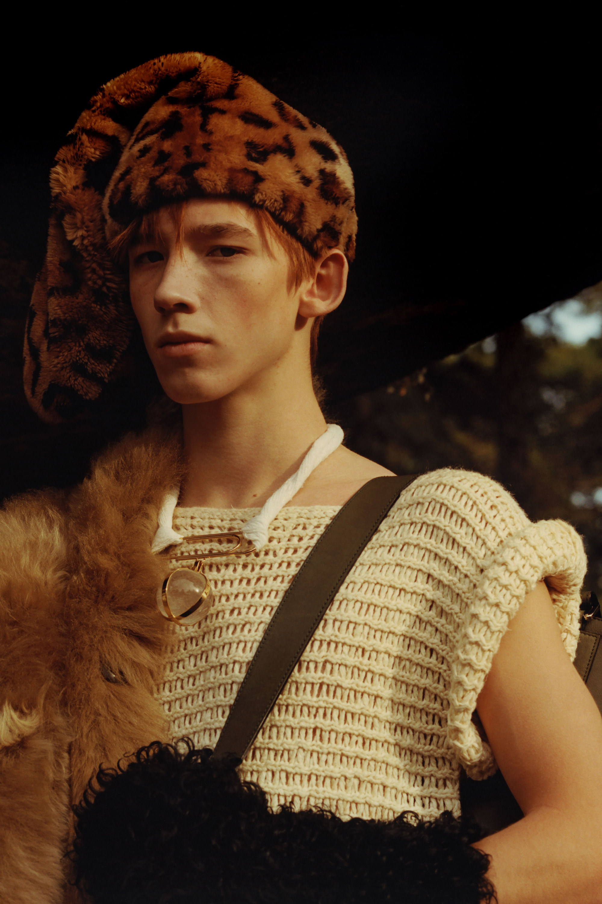 The designer produced an eccentric and eclectic collection for Loewe with military overtones and accents of punk. Consider his tank top and overcoat made of loosely knotted silicone tubes to approximate barbed wire — strictly for photo shoots.