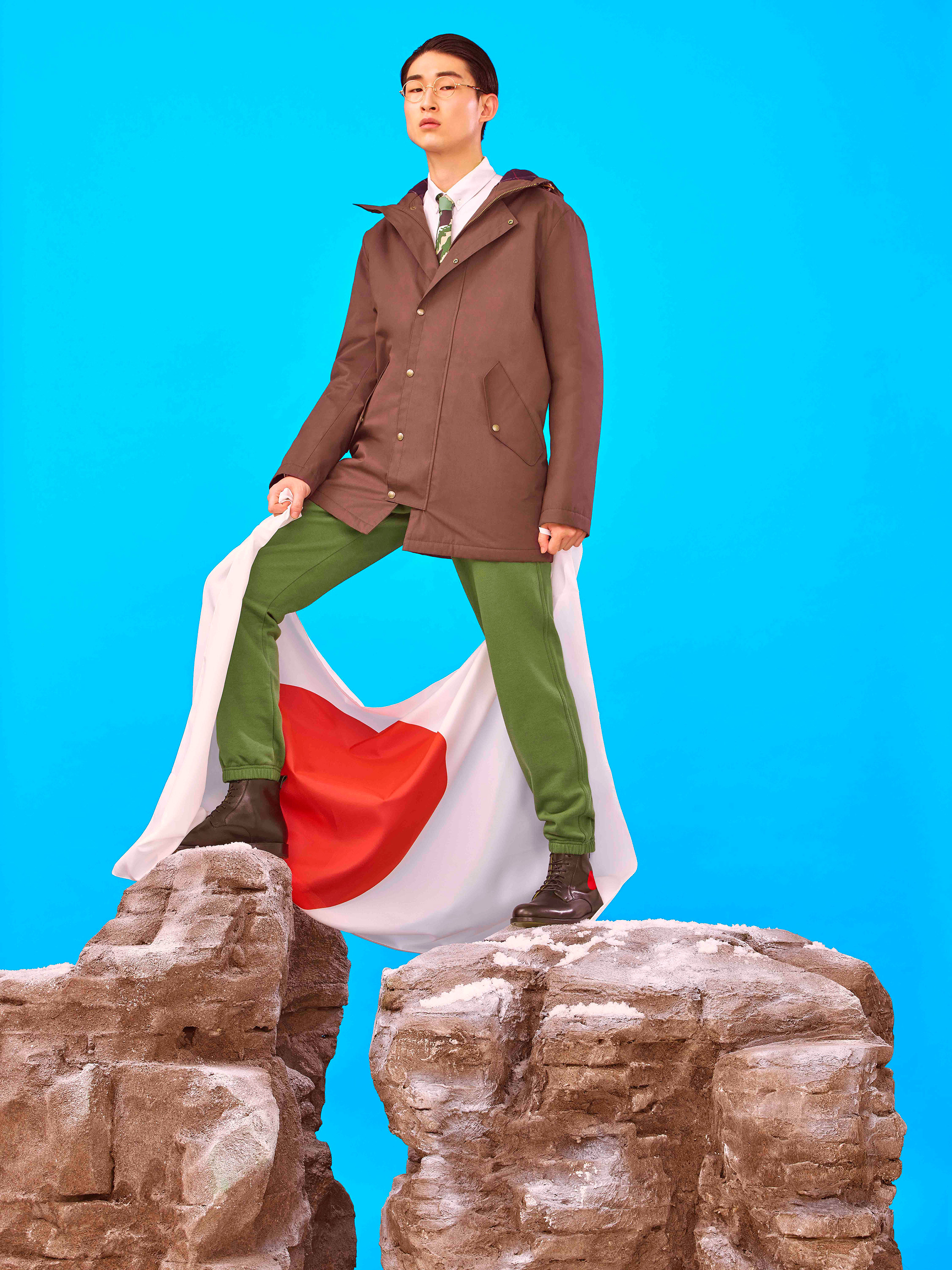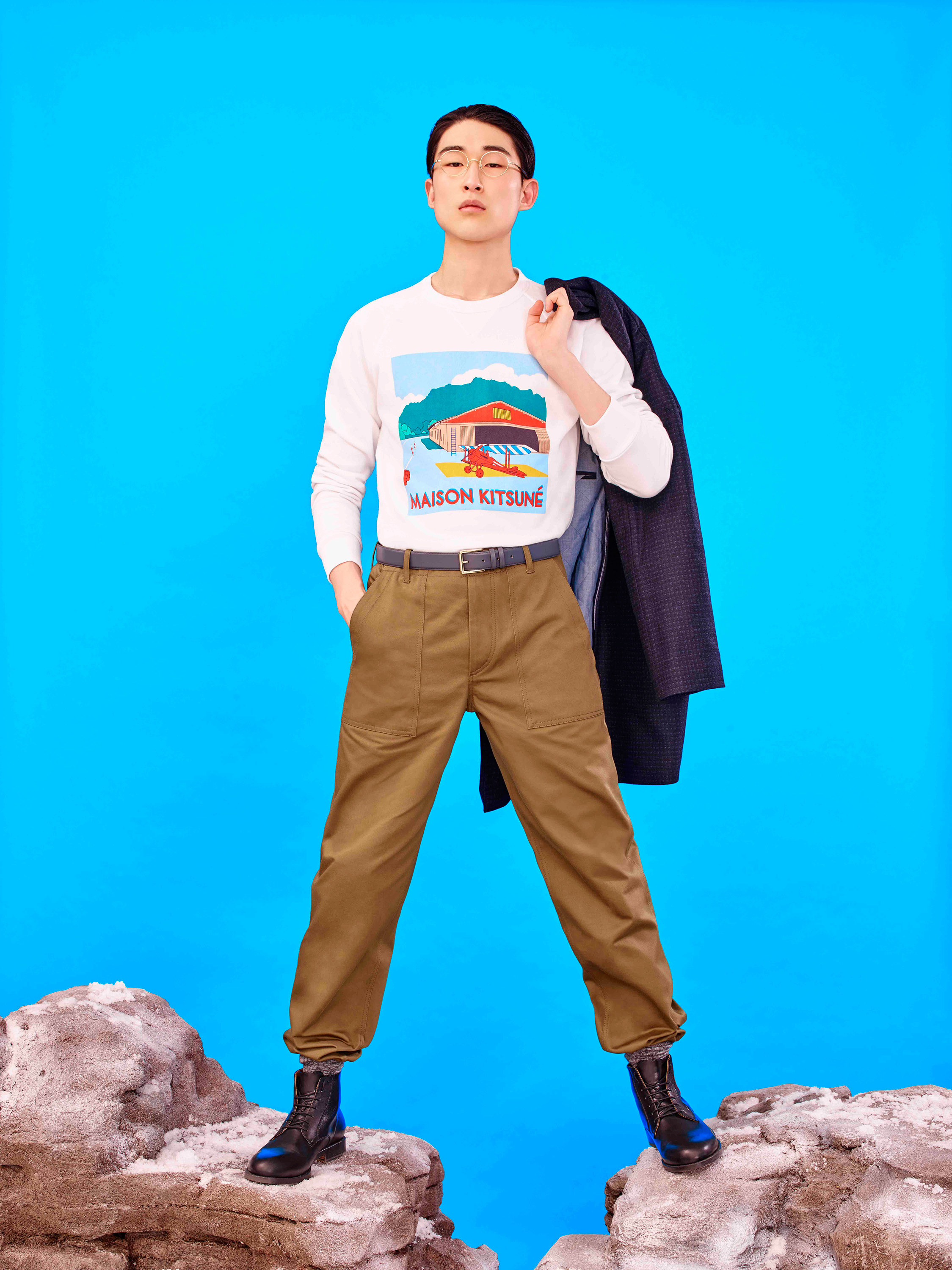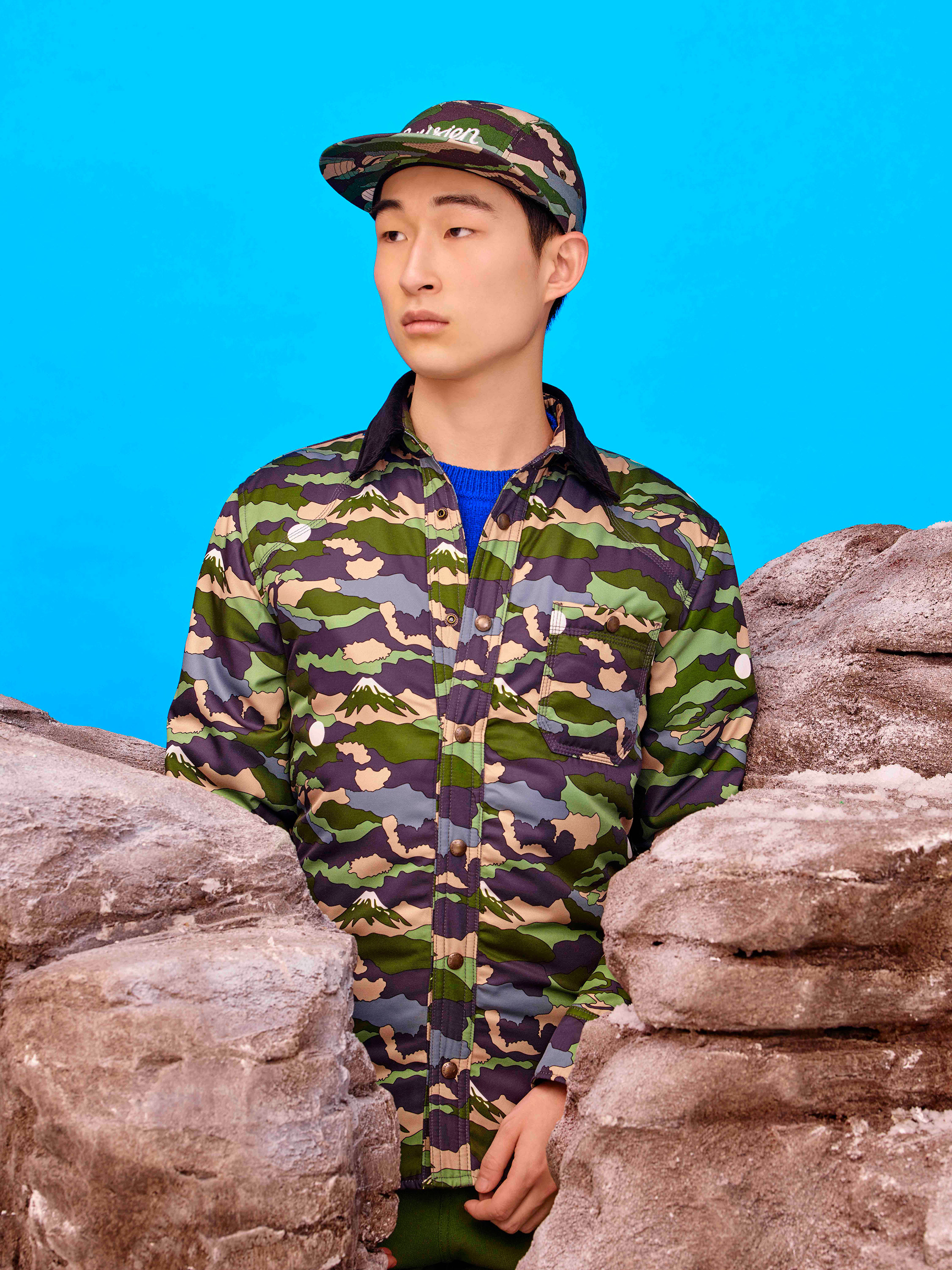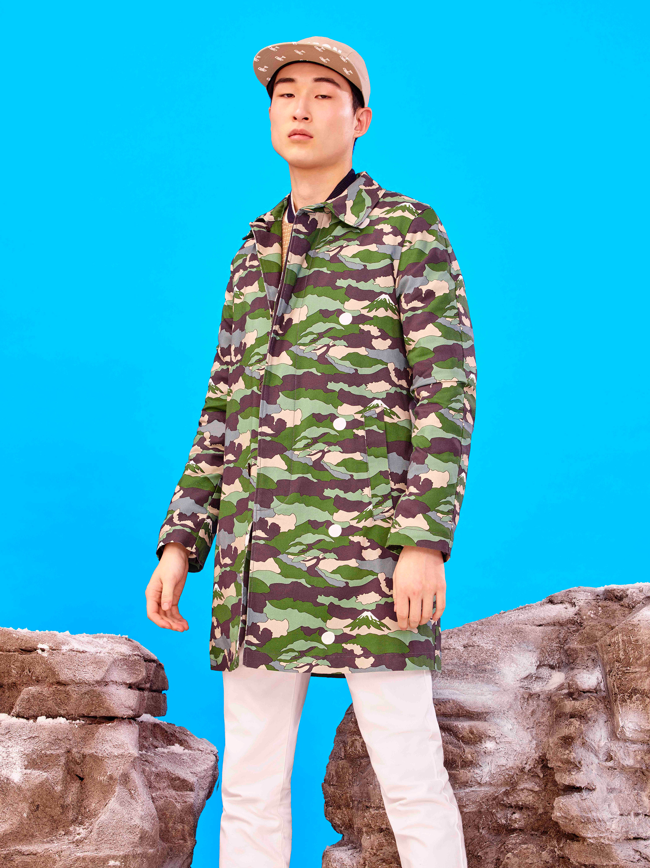 Maison Kitsuné designers Gildas Loaëc and Masaya Kuroki called on Japanimation for their fall 2016 “Love Rises” men’s collection, interpreting it in their own singular, irreverent way. Referencing Hayao Miyazaki’s animated movie “The Wind Rises,” they mixed militaria with kawai, emblazoning World War II fighter planes, images of Mount Fuji and a crimson rising sun across much of the collection via print, jacquard and embroidered motifs. A sky-blue sweater was criss-crossed with plane motifs, a camouflage jacket pierced by the snow-capped mountains. These were juxtaposed with simpler items like a classic marinière with an embroidered logo or a patchwork kimono jacket.