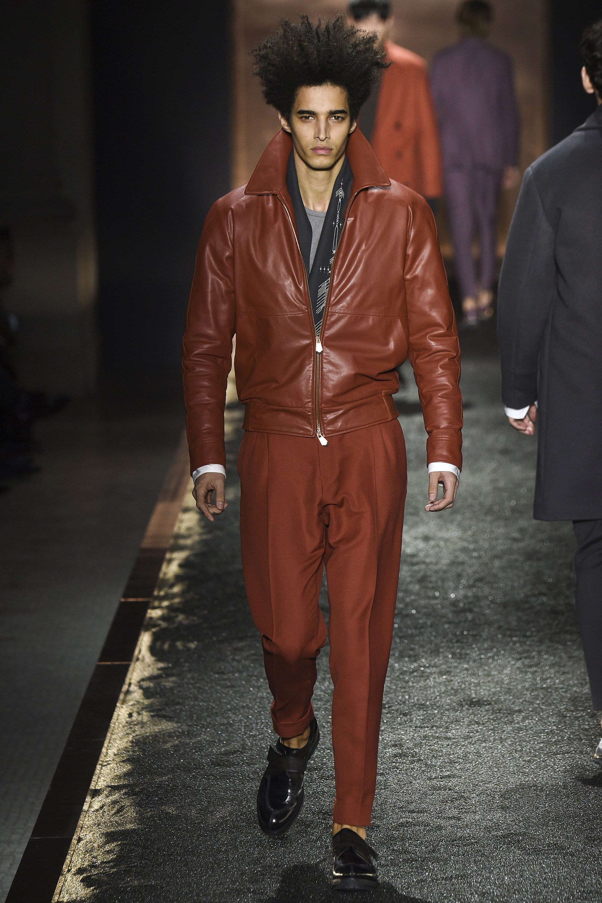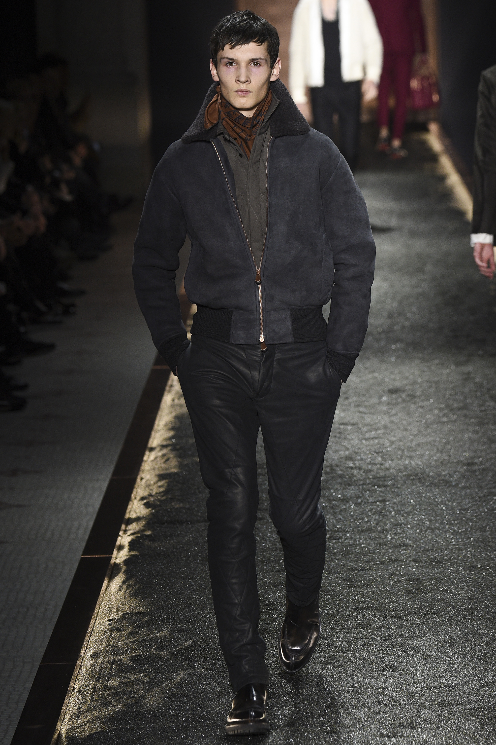 The colors were transiently desert-tinged garnets, but had plummy richness too: the seabird eggshell blues and raspberry that gently extrovert Berluti man has grown accustomed to. The shearlings were quintessential examples of themselves. This collection contained almost as many potential angles to elucidate excellence in menswear as there were grains of volcanic sand on the runway—but that would keep us here all night.