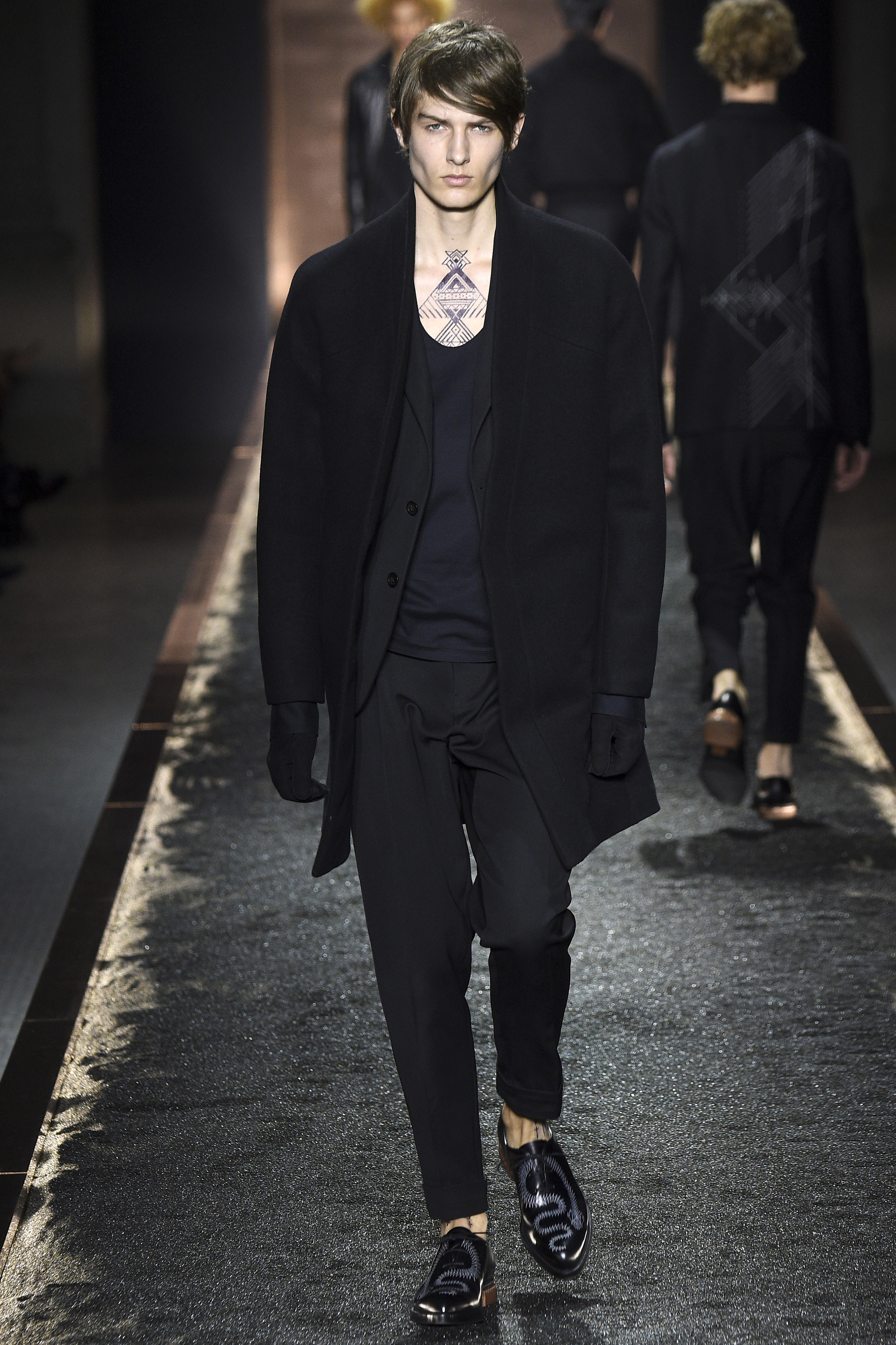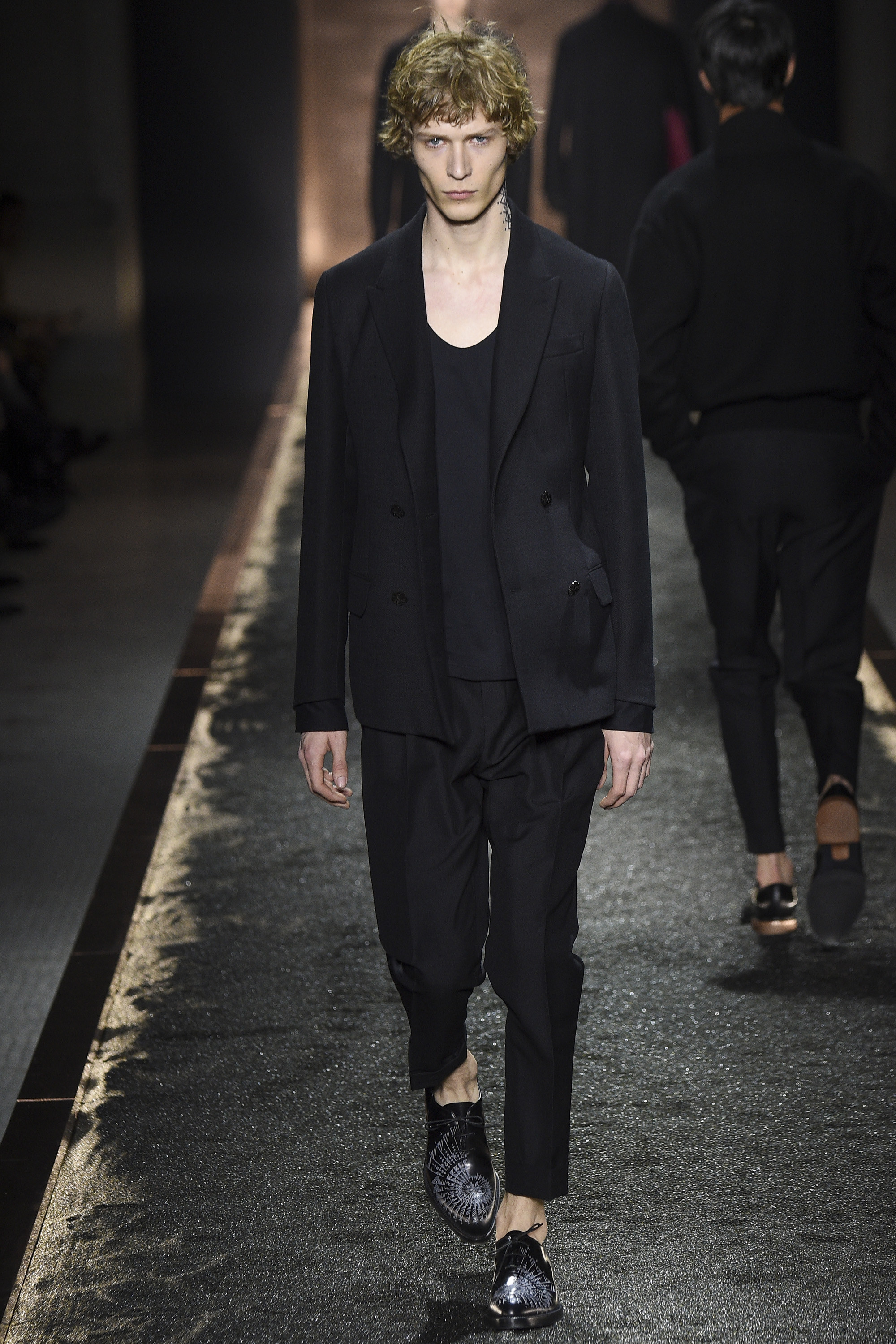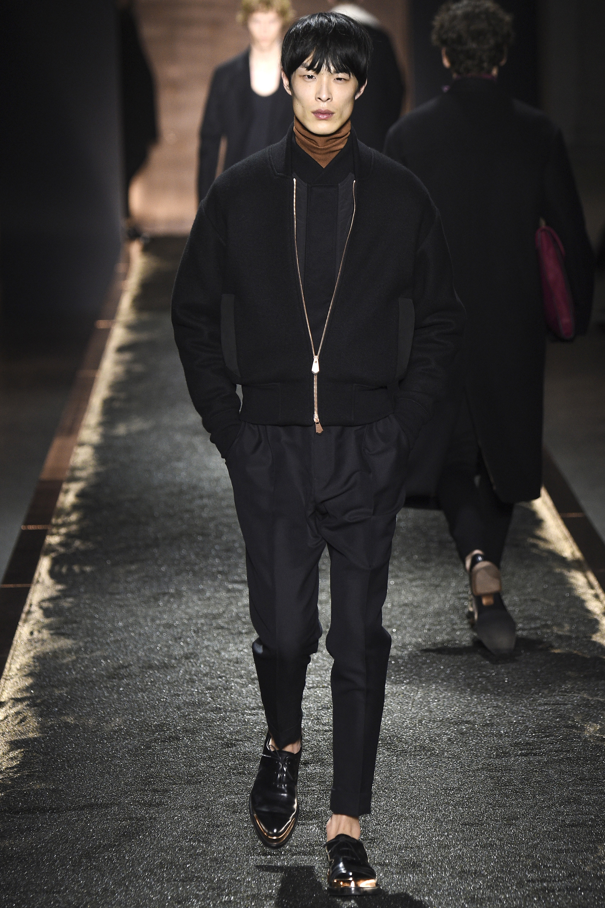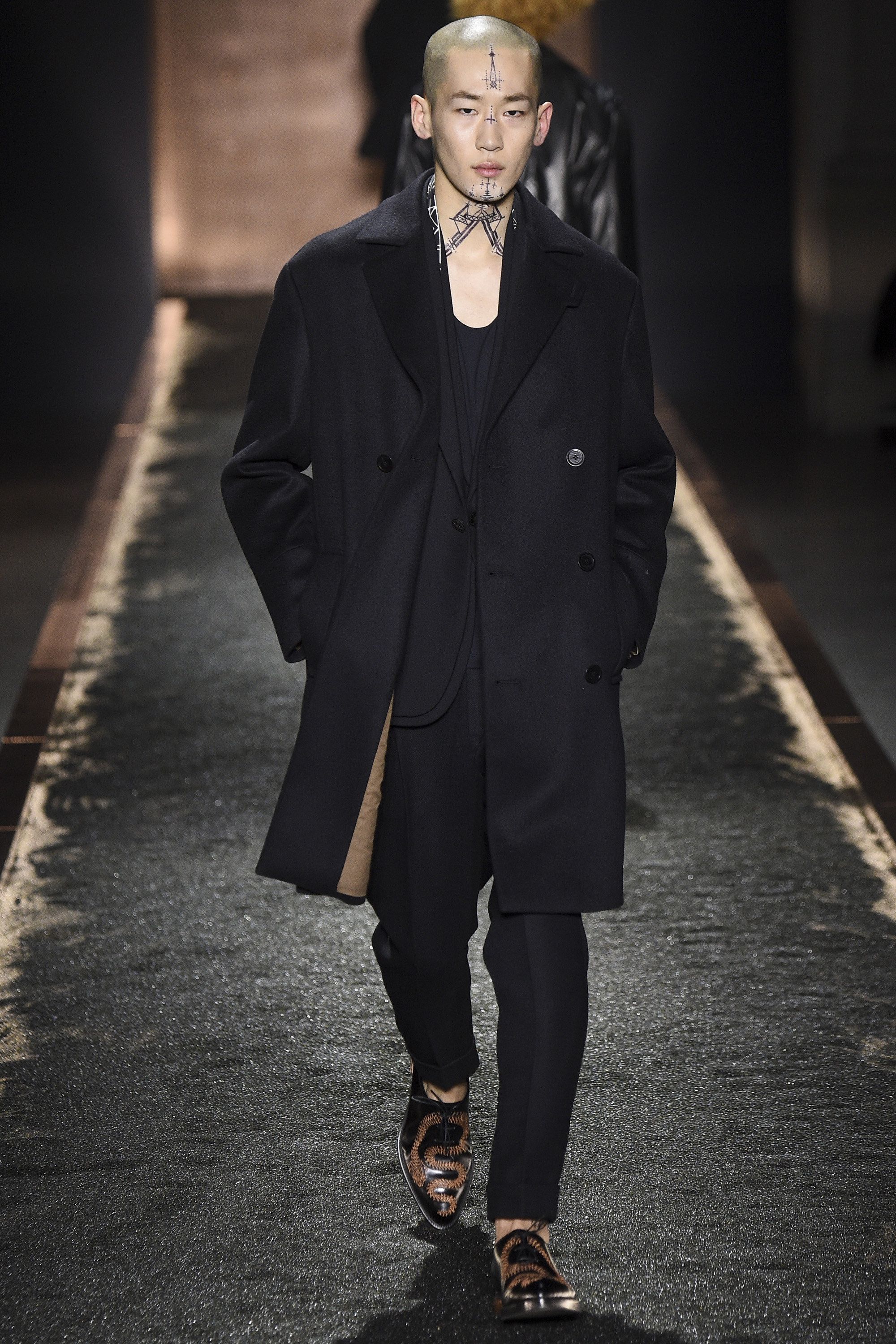What does it signify when you show your first five looks in darkness so inkily profound that all the audience can see is the barest underlit shadow of your brogue-trainers and bronze-capped, abstractly stitched formals? Answer: You are either atrociously, delusionally arrogant, or you are rather brilliant—and confident enough to know it. And perhaps you are the creative director of a brand rooted in shoes. Happily for the balance of critical karma, in this case the answer was the latter.