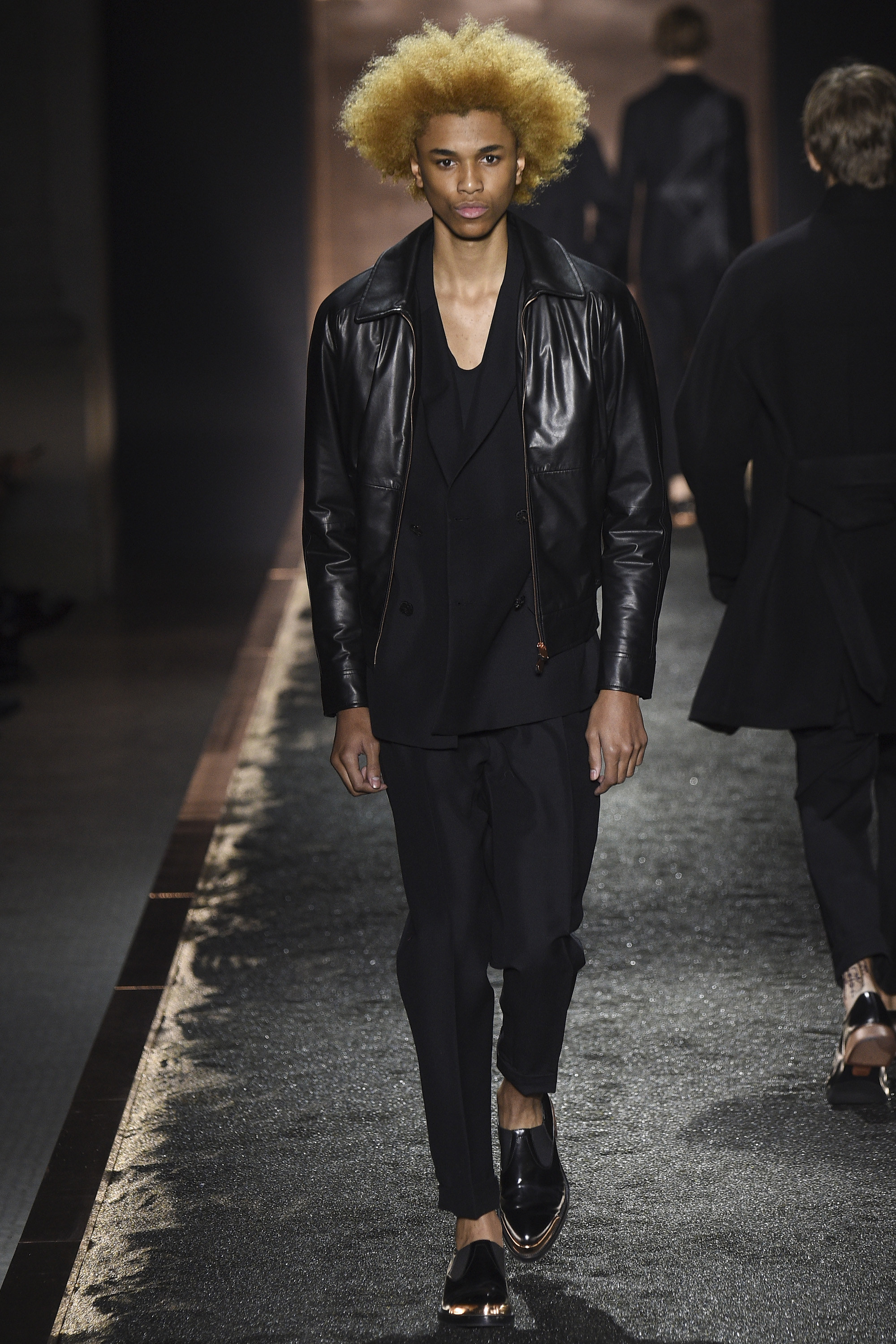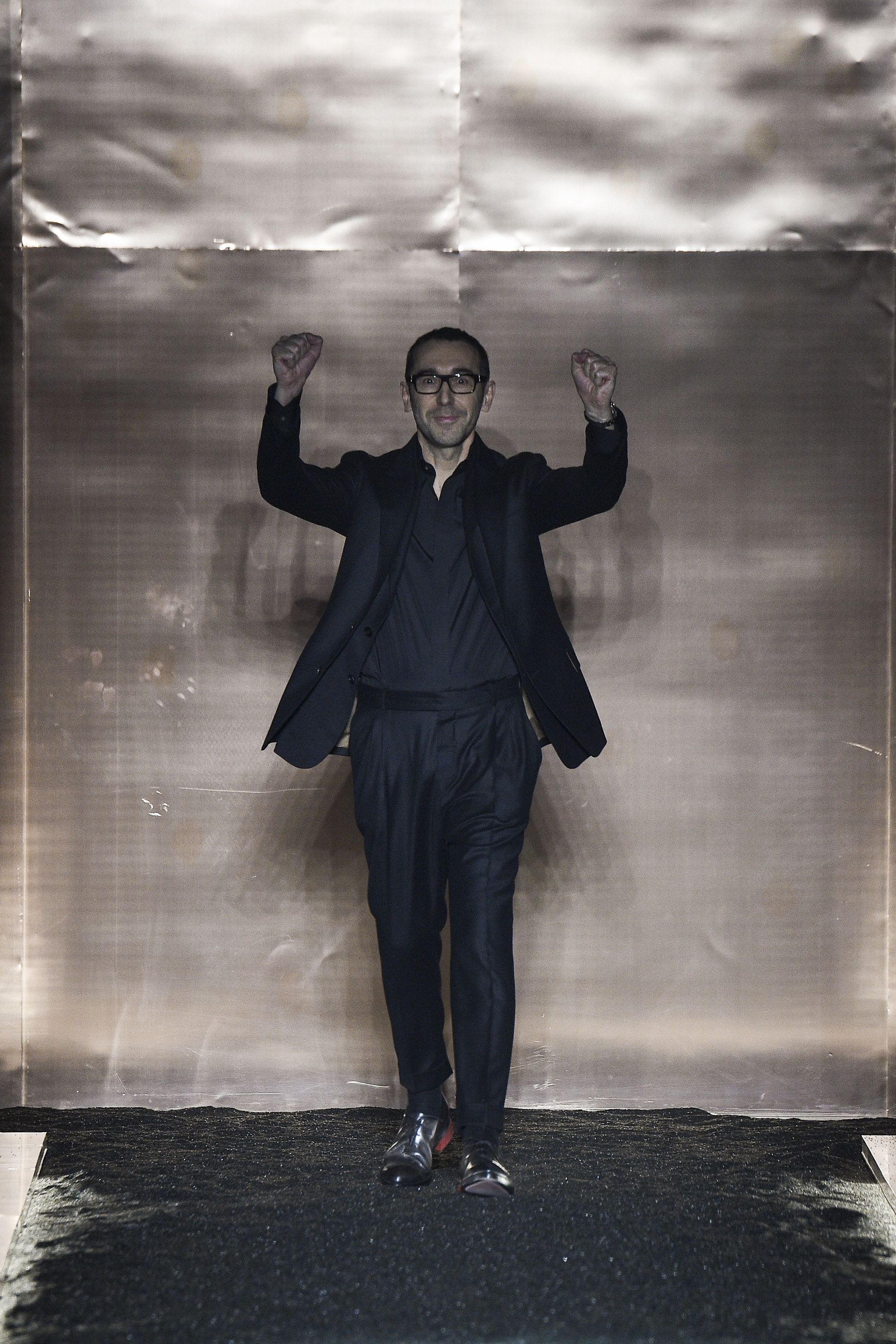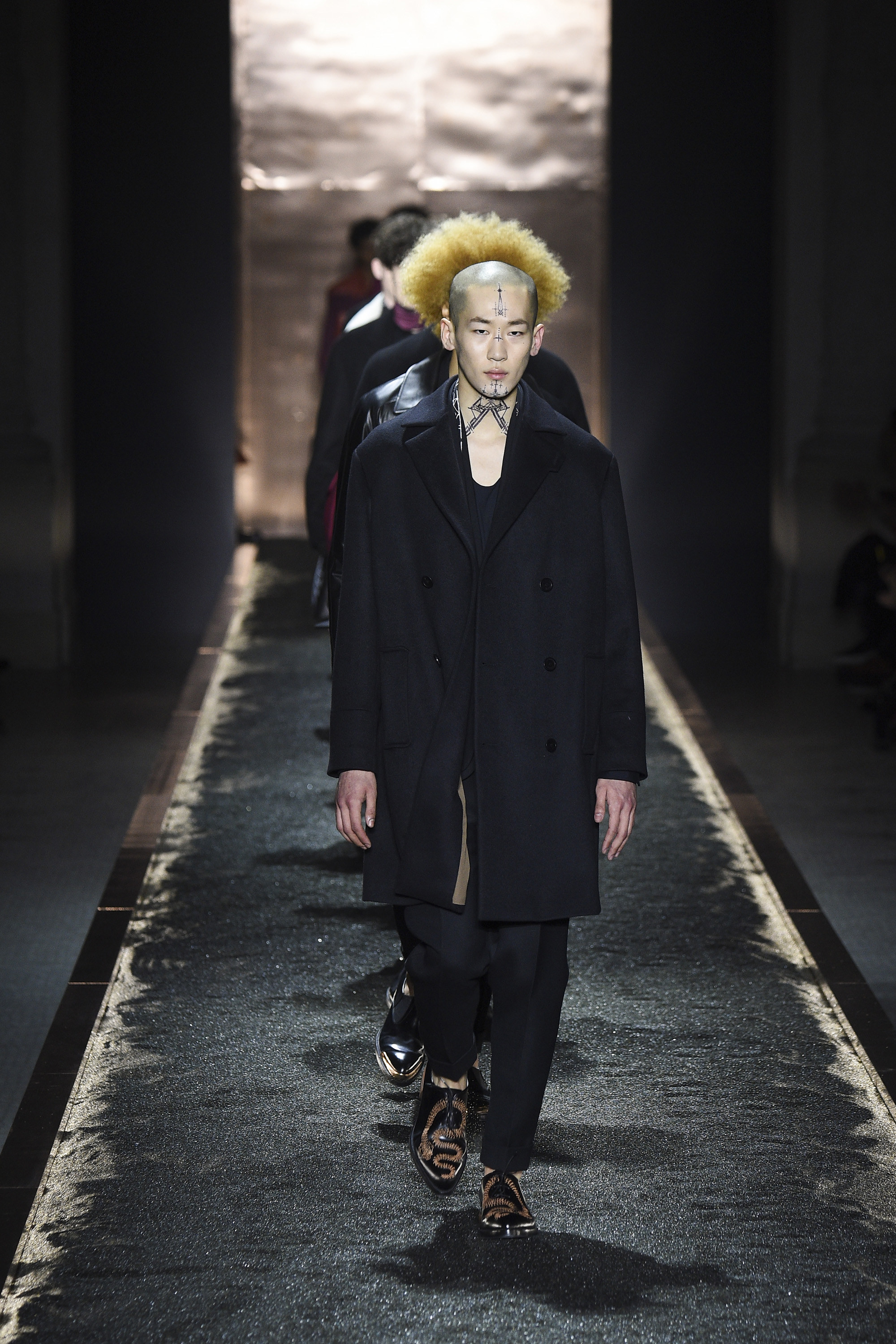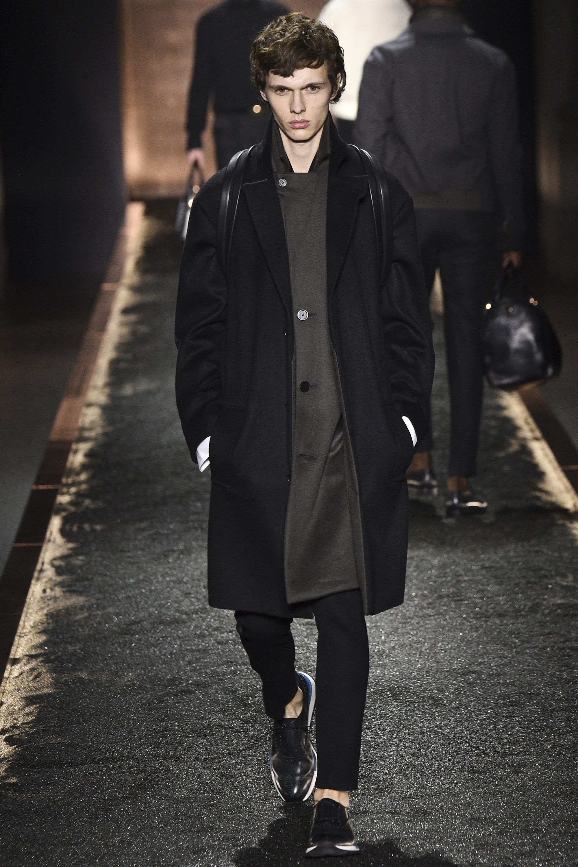 What does it signify when you show your first five looks in darkness so inkily profound that all the audience can see is the barest underlit shadow of your brogue-trainers and bronze-capped, abstractly stitched formals? Answer: You are either atrociously, delusionally arrogant, or you are rather brilliant—and confident enough to know it. And perhaps you are the creative director of a brand rooted in shoes. Happily for the balance of critical karma, in this case the answer was the latter.