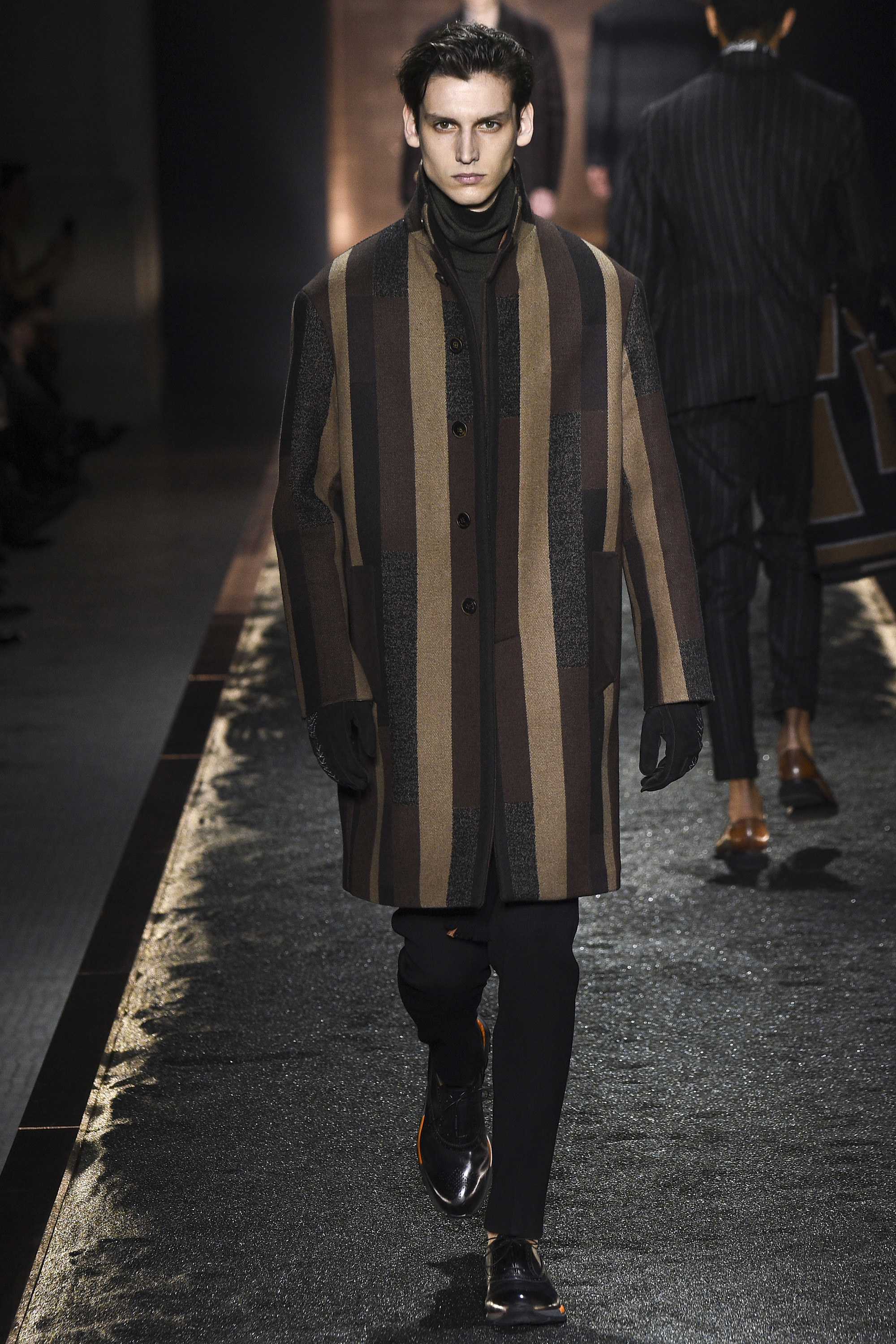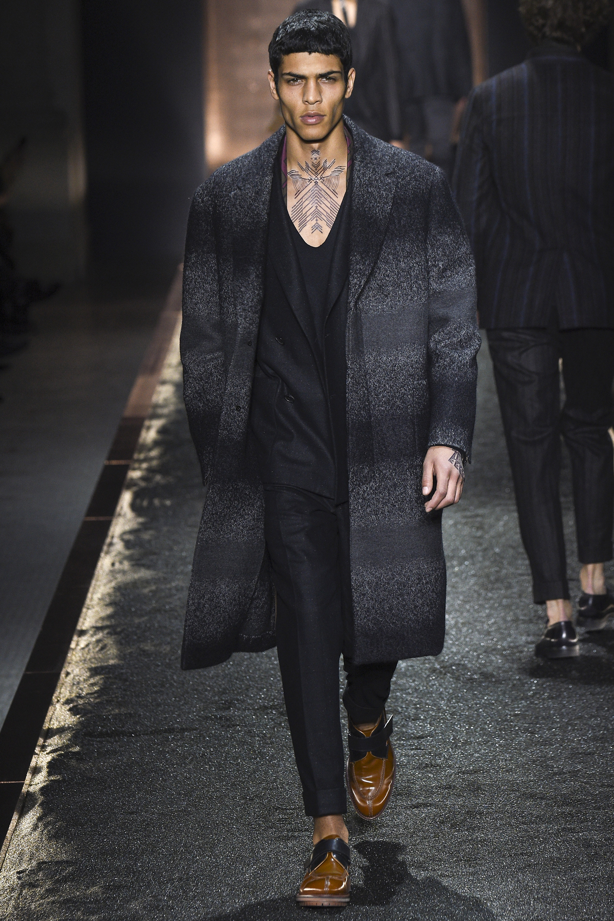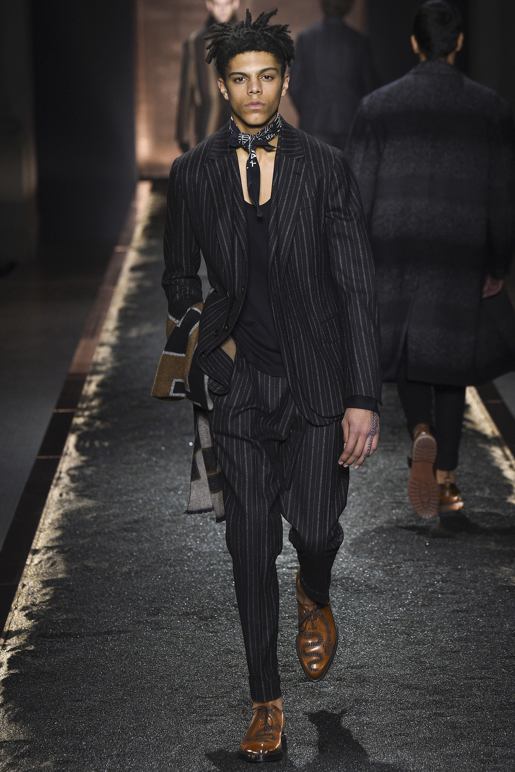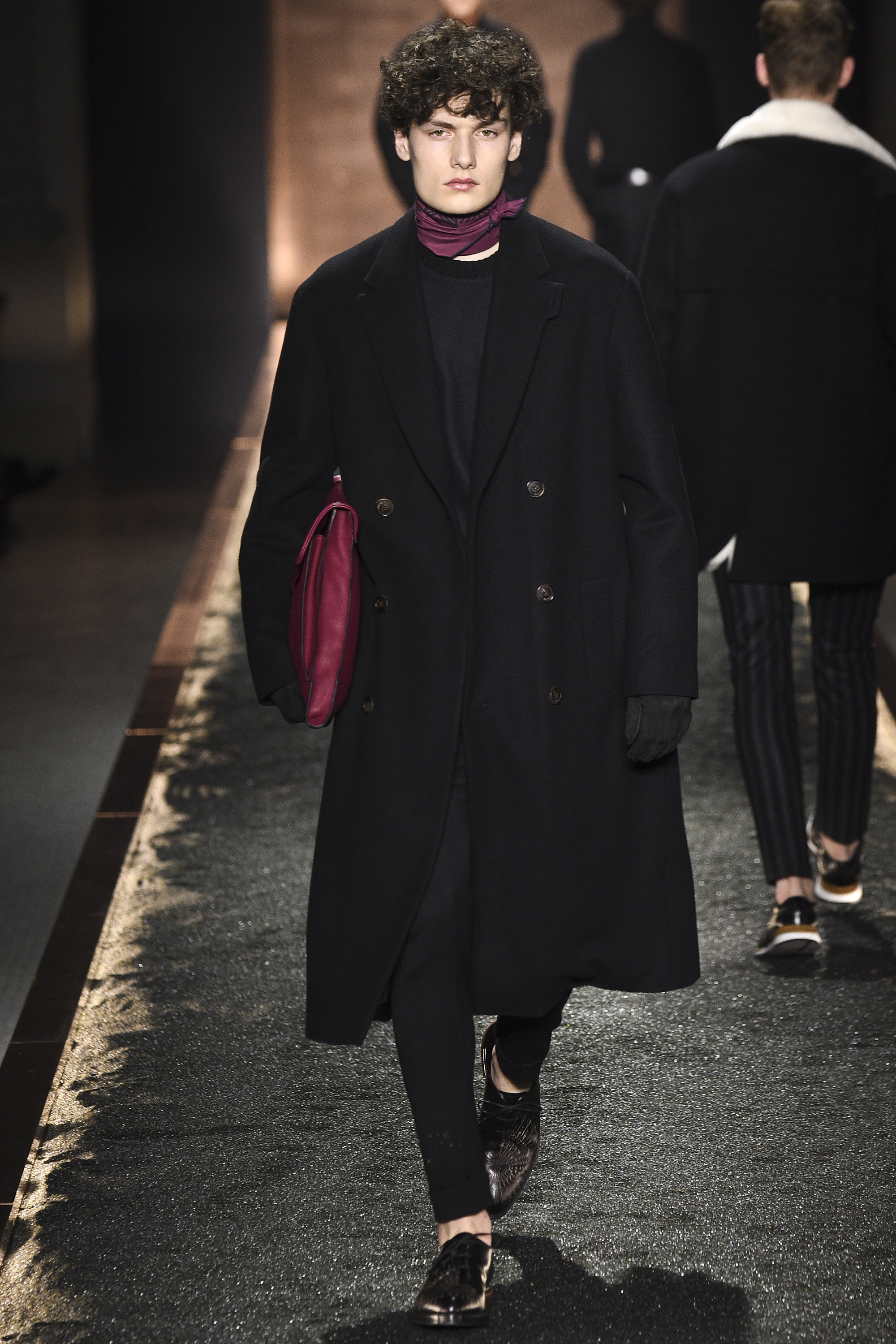 What does it signify when you show your first five looks in darkness so inkily profound that all the audience can see is the barest underlit shadow of your brogue-trainers and bronze-capped, abstractly stitched formals? Answer: You are either atrociously, delusionally arrogant, or you are rather brilliant—and confident enough to know it. And perhaps you are the creative director of a brand rooted in shoes. Happily for the balance of critical karma, in this case the answer was the latter.