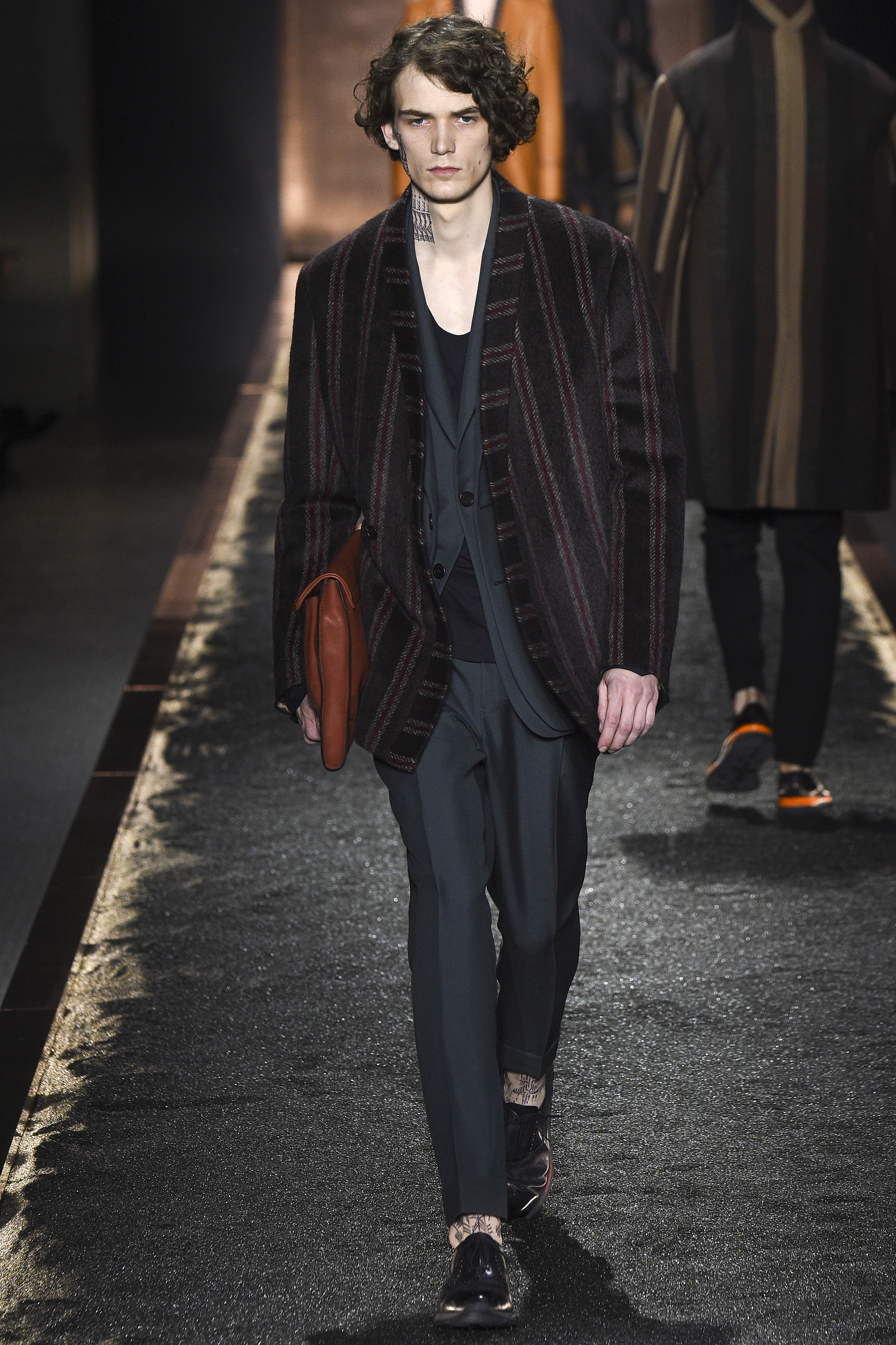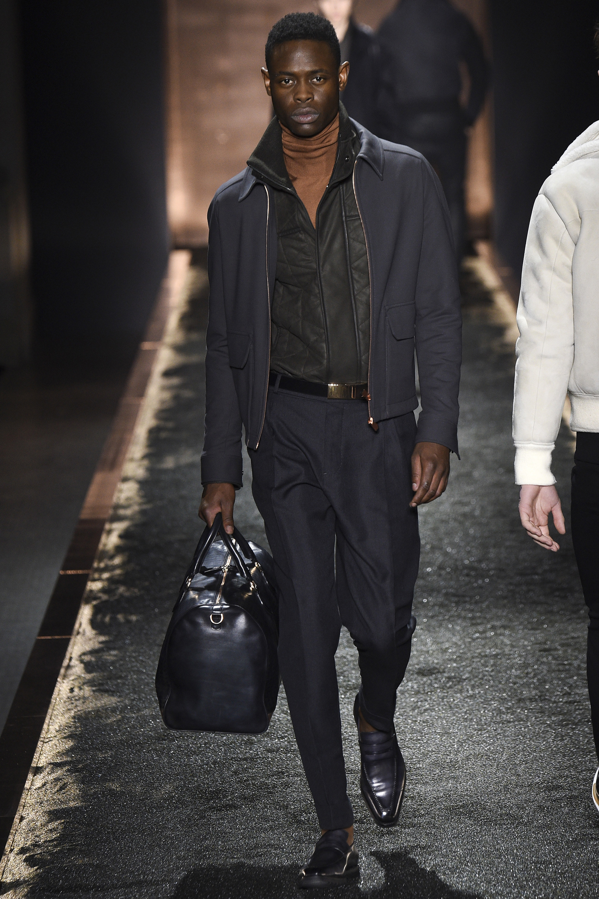 Super-notable addition two was consistent with Sartori himself who, despite working within a narrowish remit, makes ultra-luxe menswear with a formal heritage that is actually very inventive. Today’s innovation would have piqued the interest of Margiela, yet was functional as well as sartorially transgressive. A tailored jacket, featured above this review, had one set of sleeves, one back, but two fronts and two sets of lapels. This made it look a little as if the wearer had just gone on a shoplifting spree and was trying to wear his ill-gotten gains out of the store. But the idea of having a double front to a jacket—to provide both protection done up and silhouette undone—was quietly wonderful. If Sartori isn’t careful it will become like Gillette vs Schick: Next season some derivative devil will produce a three-fronted jacket, and he’ll feel obliged to respond with four.