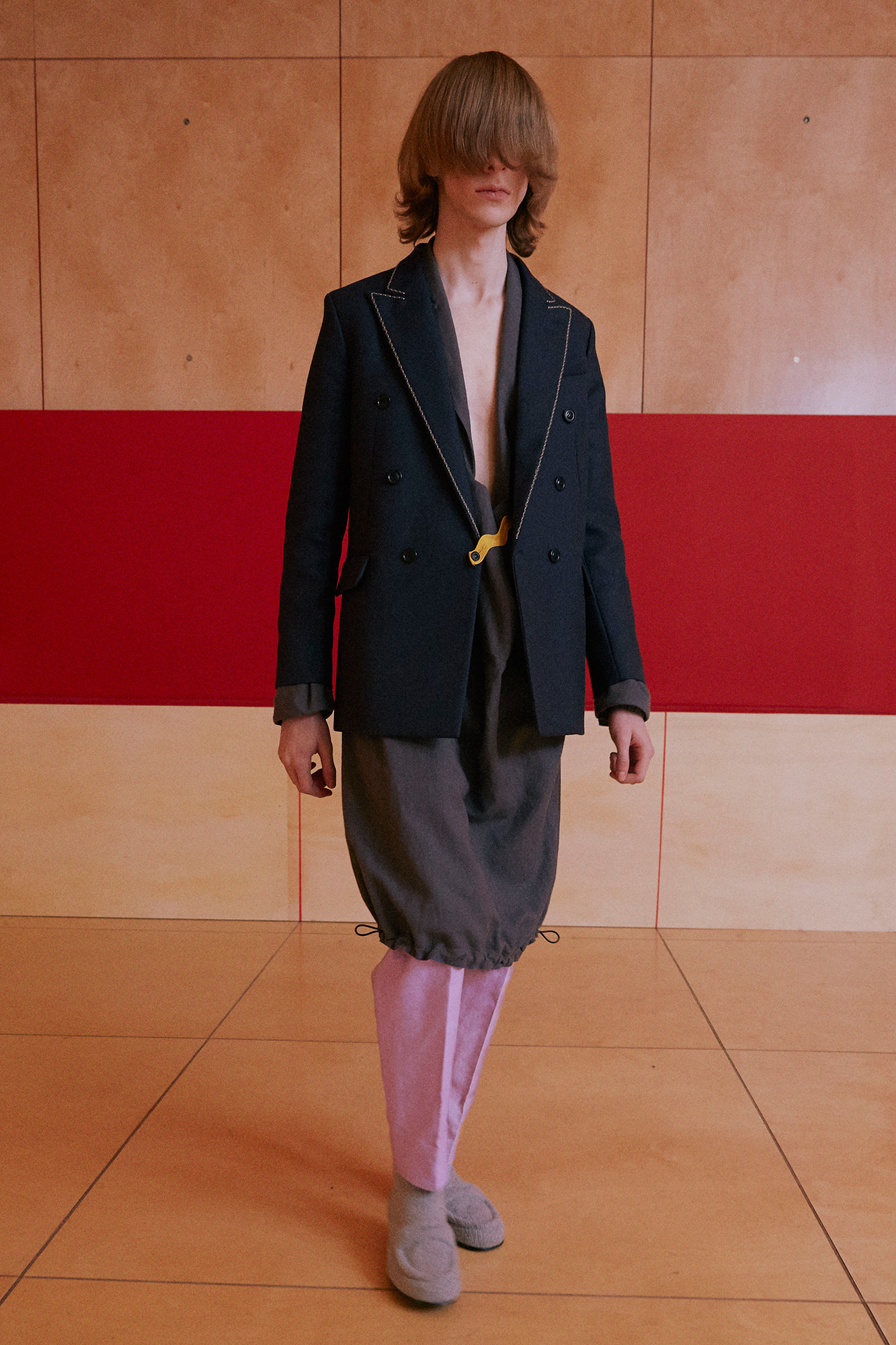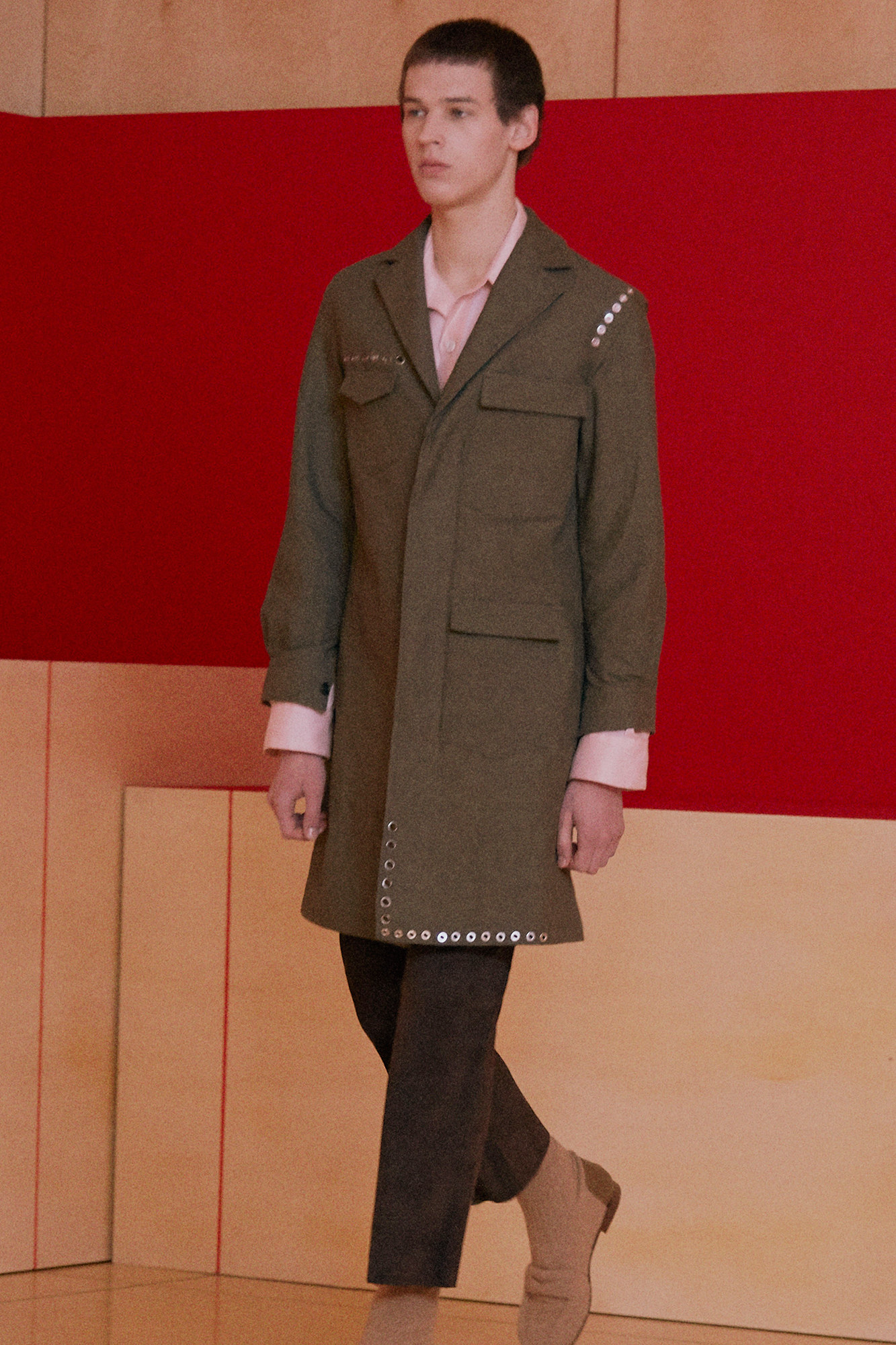 High-waisted, double-pleated tapered pants—quite formal—or patch-pocketed army pants were worn under reduced greatcoats, fitted micro peacoats, and maxi donkey jackets. A snap-front lavender suede shirt was layered beneath a padded gilet and above a long-skirted shirt in what looked like olive flannel or felt. A number of the shoes were most definitely felt—great fun, grafted loafer–sock hybrids. There was a bit of gray tailoring in nano-herringbone with distressed detail at its seams. Some of the color detail was lovely—if camouflage only at an extroverts’convention—like the teal leather pants that tanged against orange mohair socks.