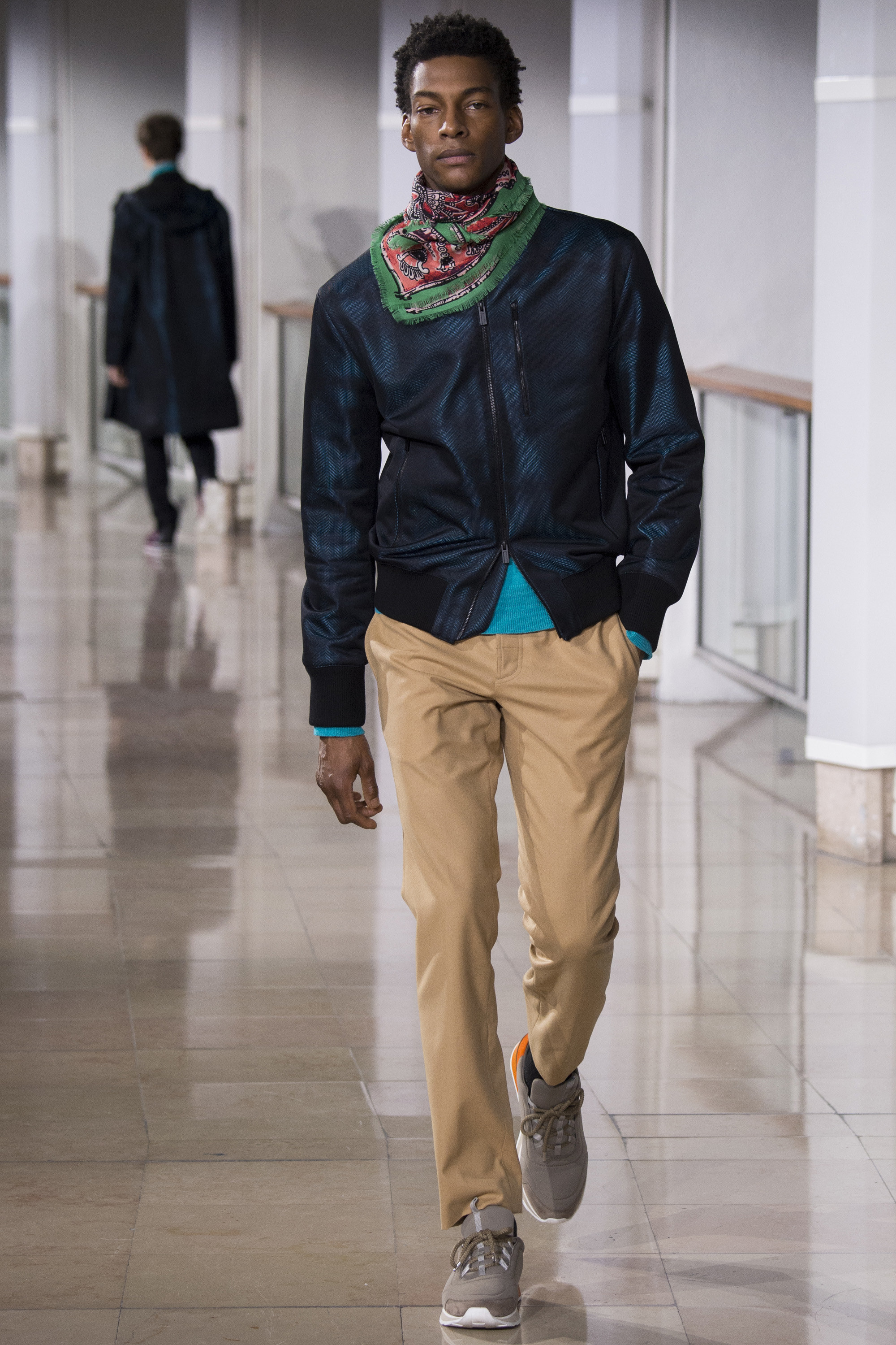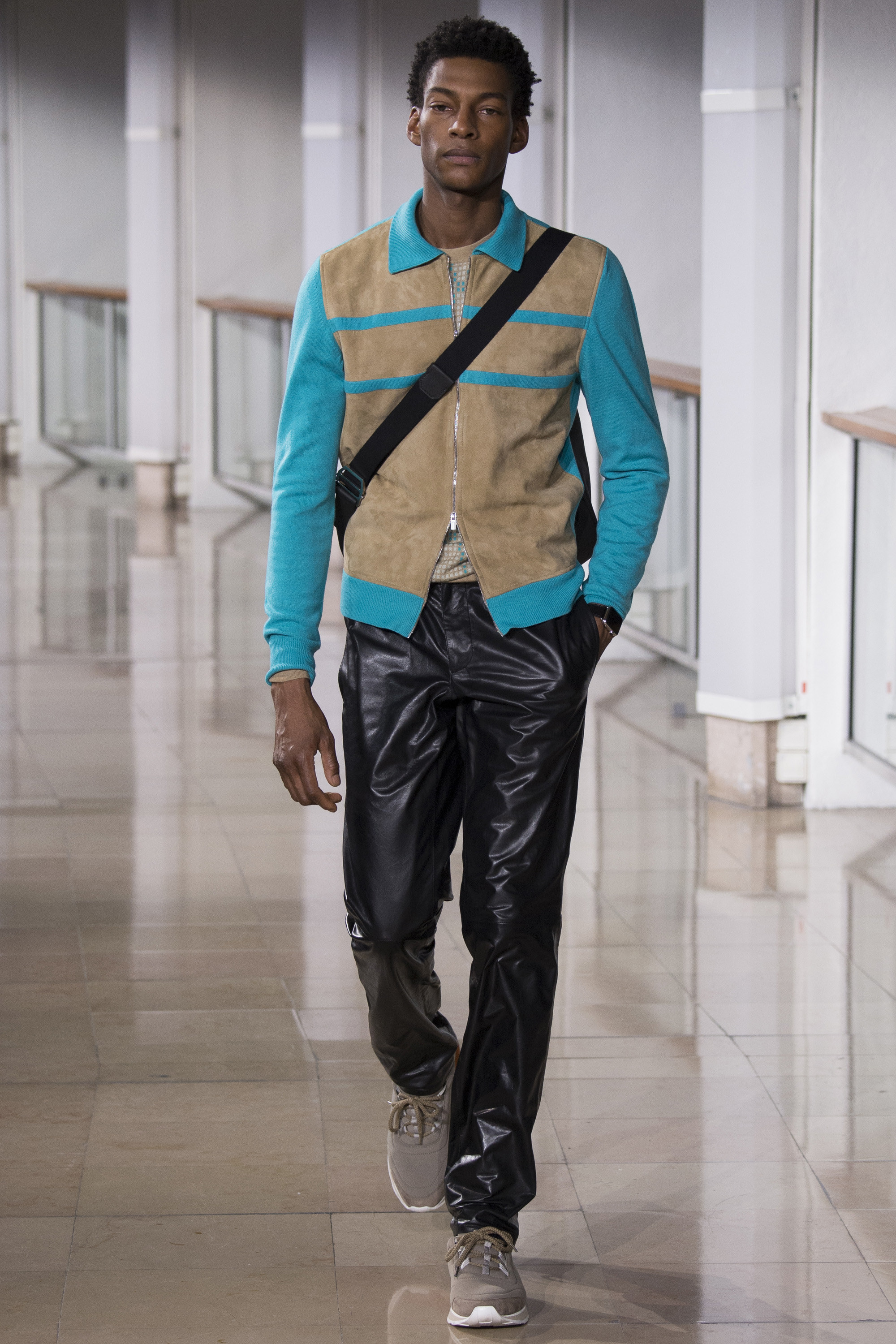 It made me think of how Hermès has bent our perception of luxury today. Modern luxury, chez Hermès, is a transmogrification of the everyday wardrobe into the ideal. What may entice you to buy? It’s especially evident in the menswear, where Nichanian is content to be quiet, even restrained. There are seldom big themes or statements on her runway: “Pure black” was one of her ideas, as in the aforementioned suiting that closed the show. Conversely, “color vibrations” was another, like the contrasts of shades on Hermès silk scarves (plenty of models wore those). Those opposing ideals, understandably, lead to a mixed bag. They felt like words affixed to justify something that actually needed no justification. This show was muddled up, which is pretty much what everyone’s closet looks like, too. Nichanian did skinny jeans, in khaki stretch gabardine; she did a crewneck sweater, in a lapis turquoise extra-fine cashmere; she cut a peacoat in teddy bear–soft baby lamb. She also appliquéd Bolide bags with a shark’s gaping craw. Incongruous, to say the least.