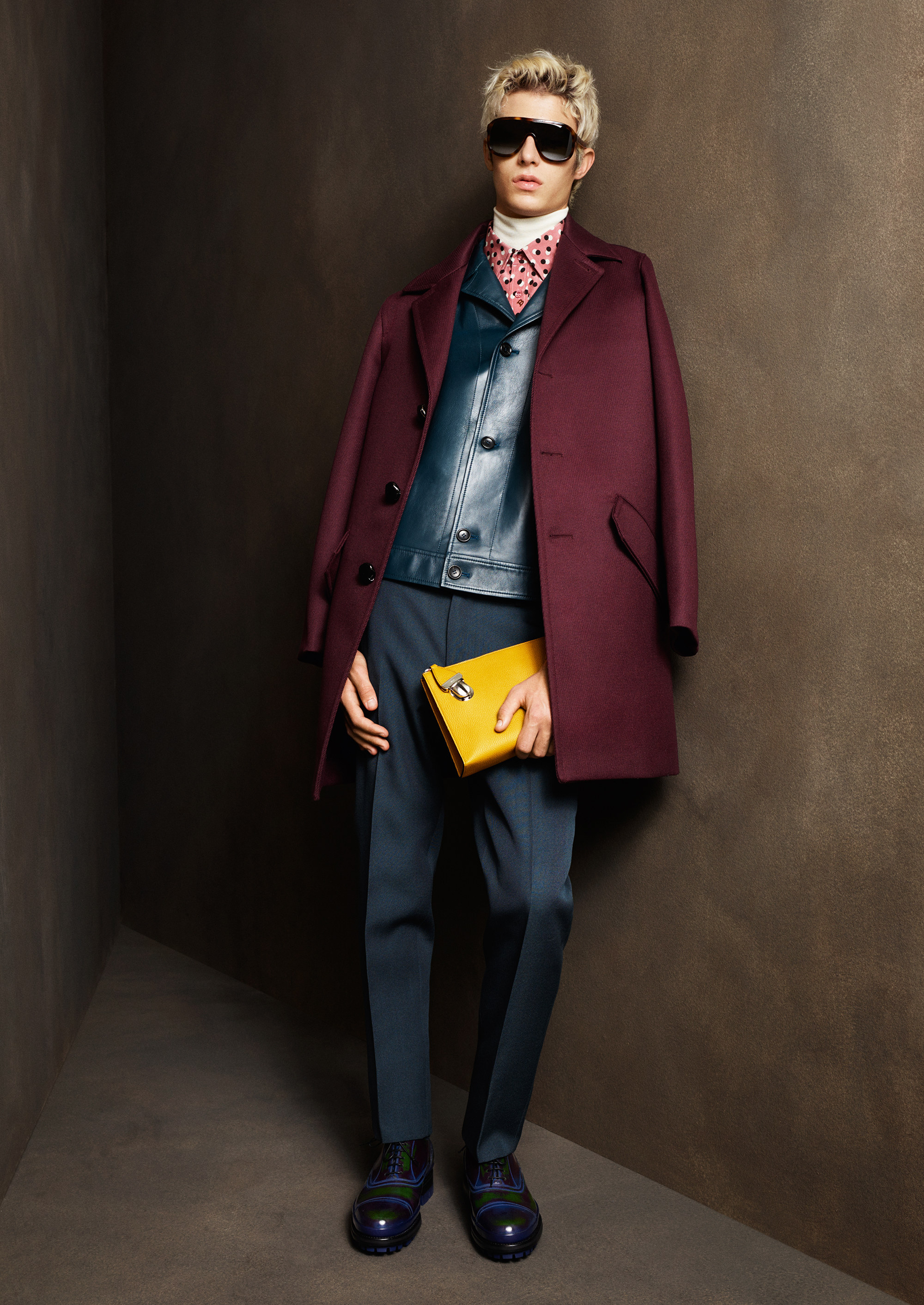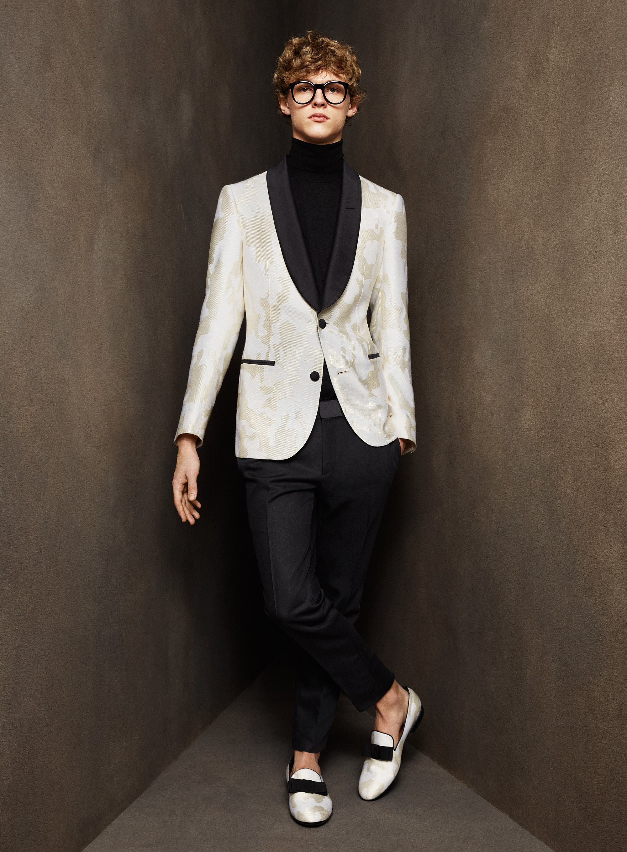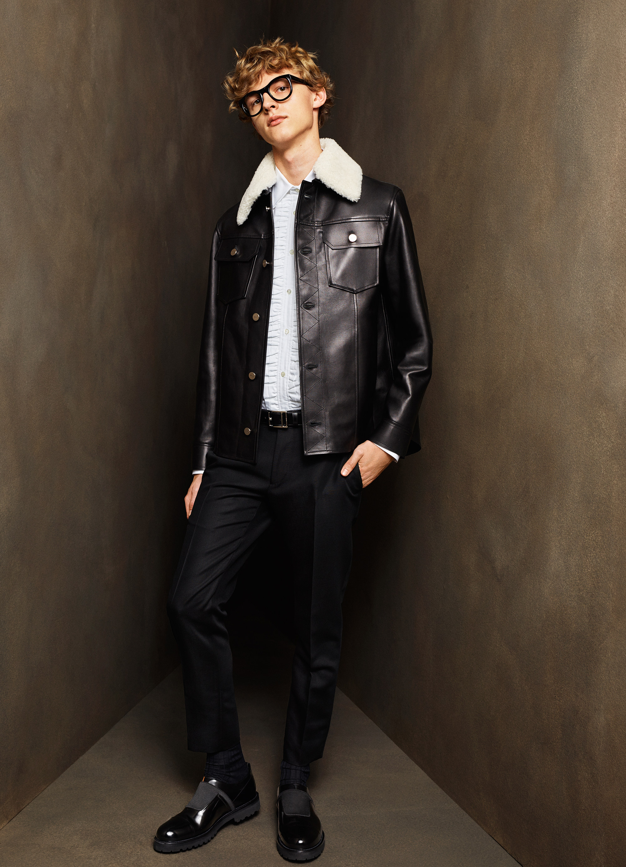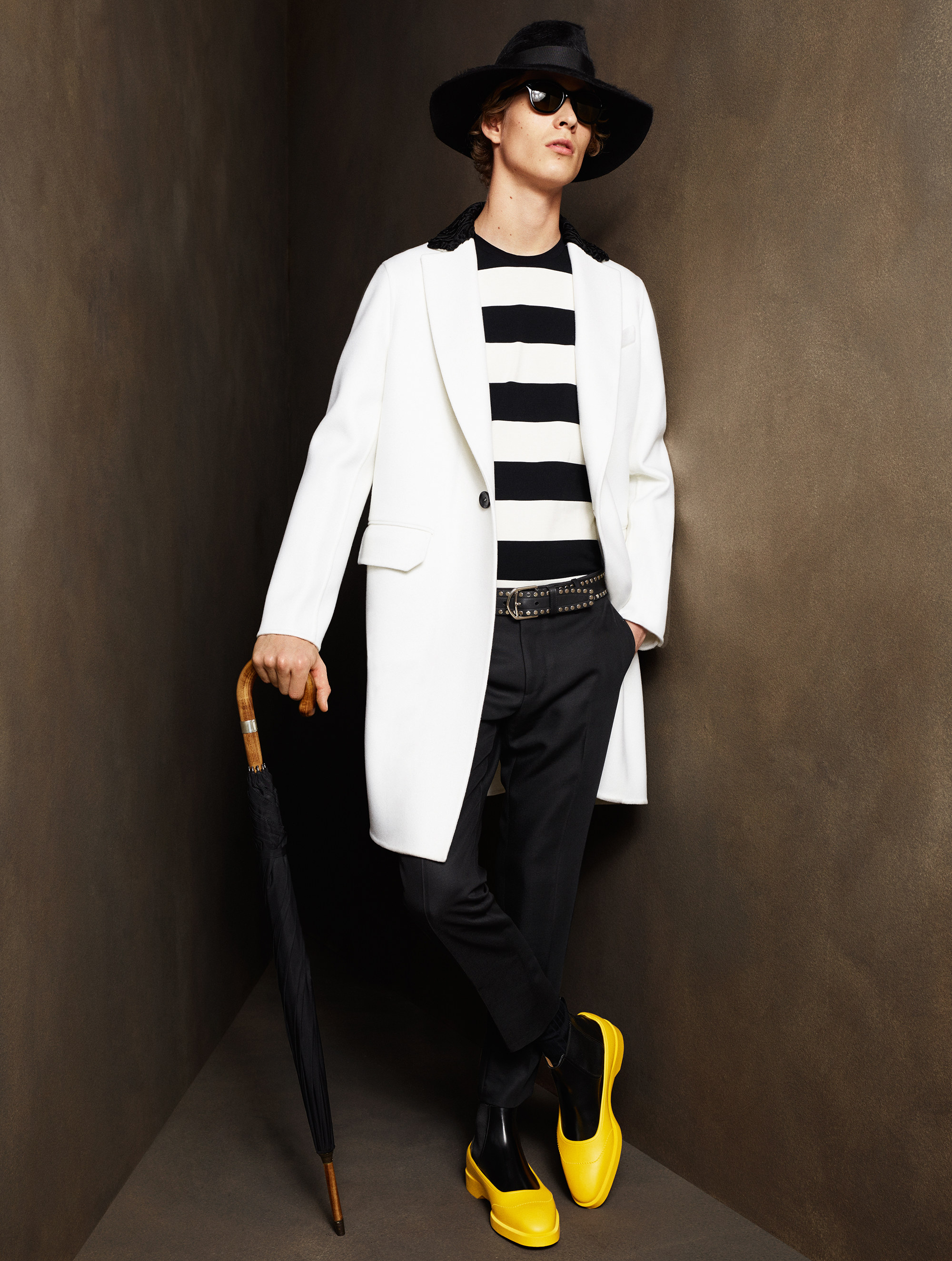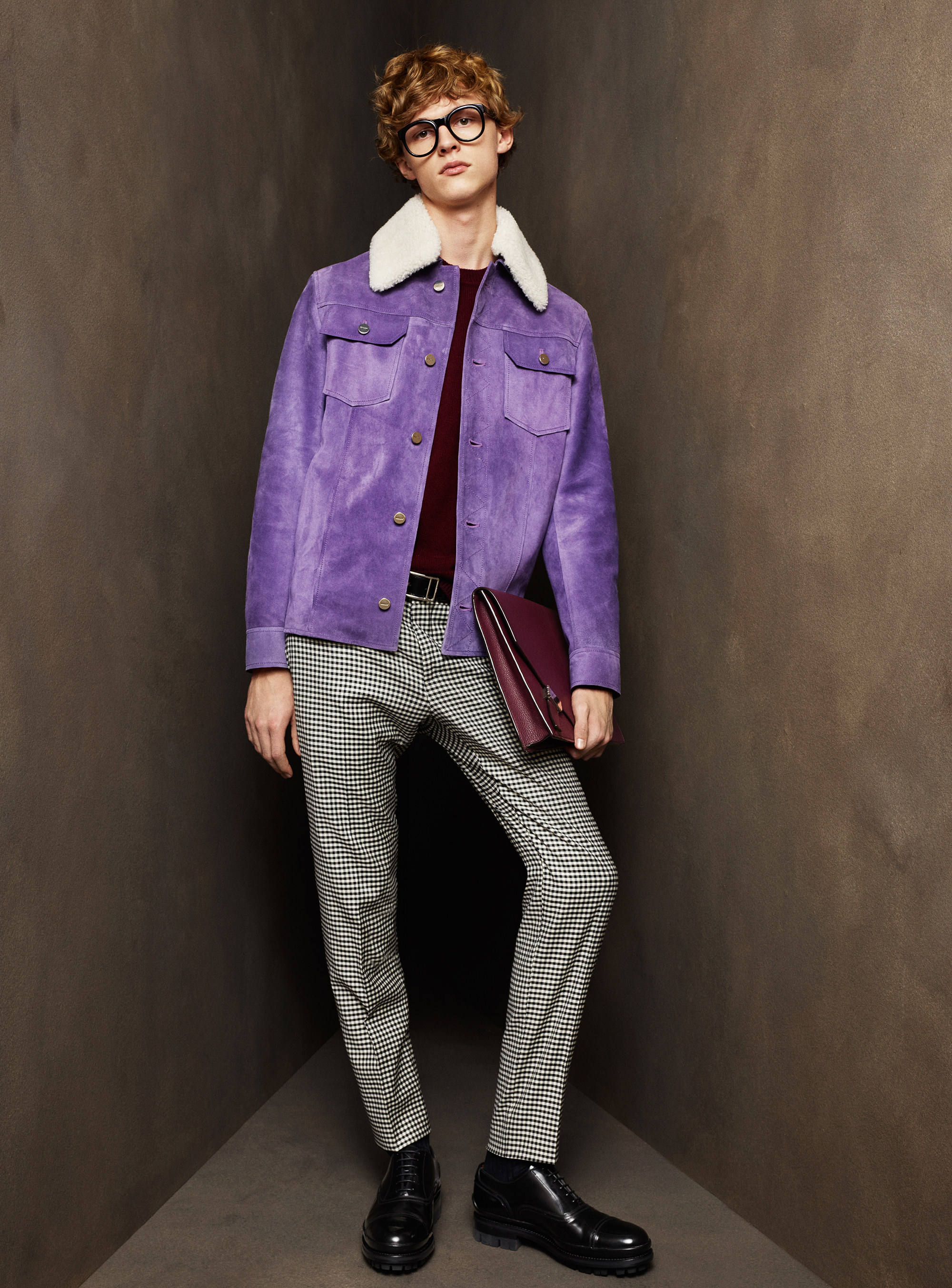 Yeah, baby. Pablo Coppola started getting his head into this collection when the present was particularly dark. He needed no further incentive to retreat into carefully crafted cultural nostalgia. It’s a loose reminiscence, a mixtape of past muses. “I was looking at that Peter Schlesinger book, Checkered Past, and I was imagining this gang of people, who right now you would consider all to be masters, but back in the day were up-and-coming, on the cusp, royals and dandies mixed with artists and rockers. There was this idea that you could mix anything,” said the designer. So, the striped rugger shirt under purple tux muttered of Hockney. The gingham double-breasted suit and astrakhan collar coats barked like Caine. The white camo shawl-collared jacquard evening jacket with matching slippers was nobody in particular, but held enough resonant touches to become a member of this generation’s up-and-comers’ signature. There was a crisp wool burgundy suit with angled pockets and an interesting pajama suit in knit blue. Especially good was the knitted bottle green coat-cum-robe and a double-breasted leather caban with crocodile arms.