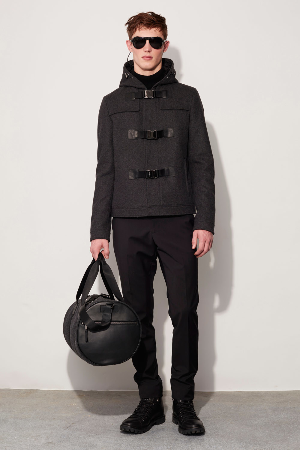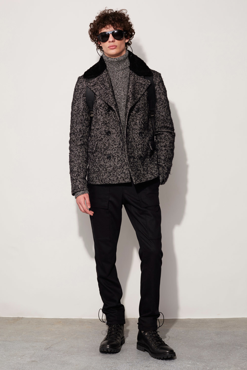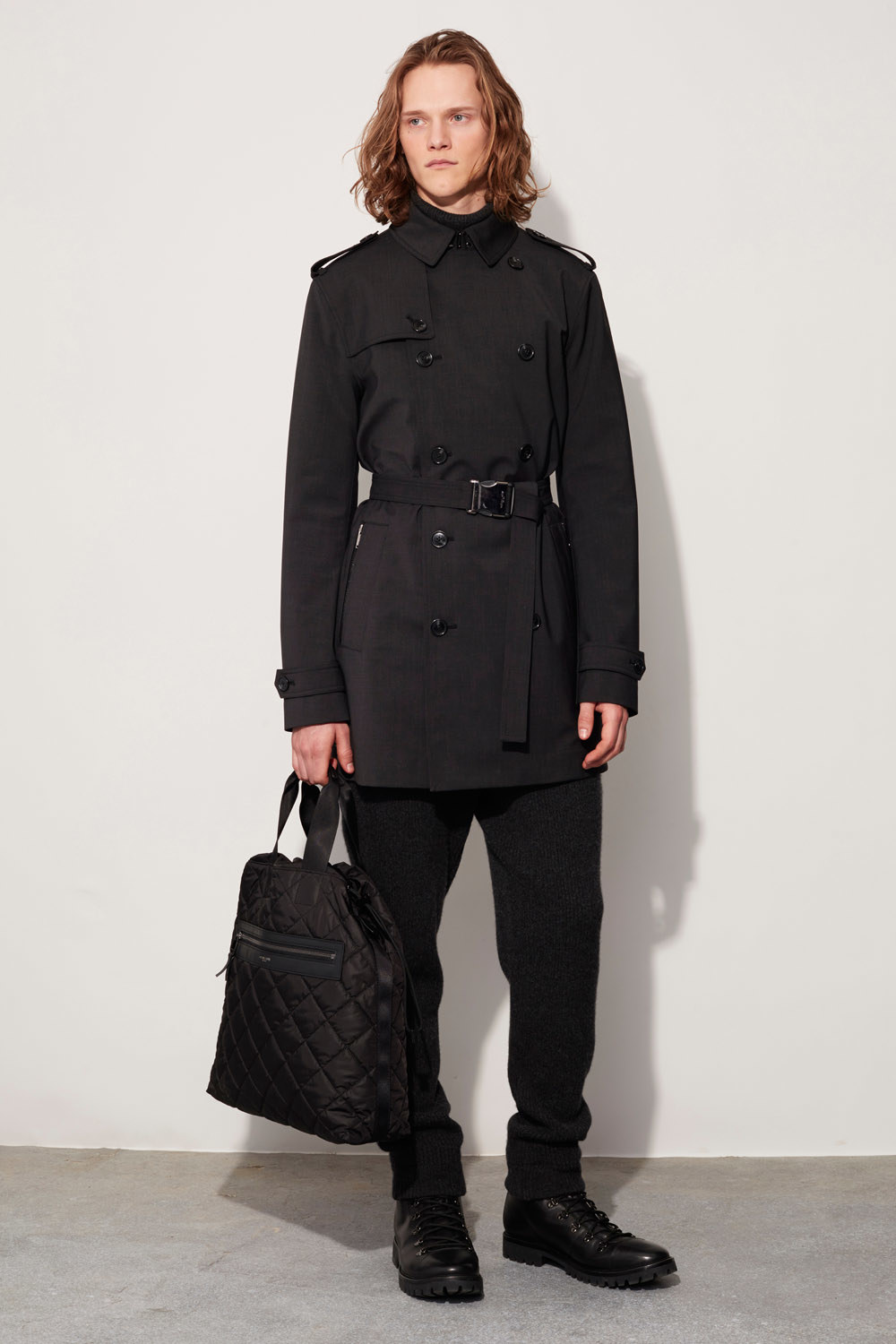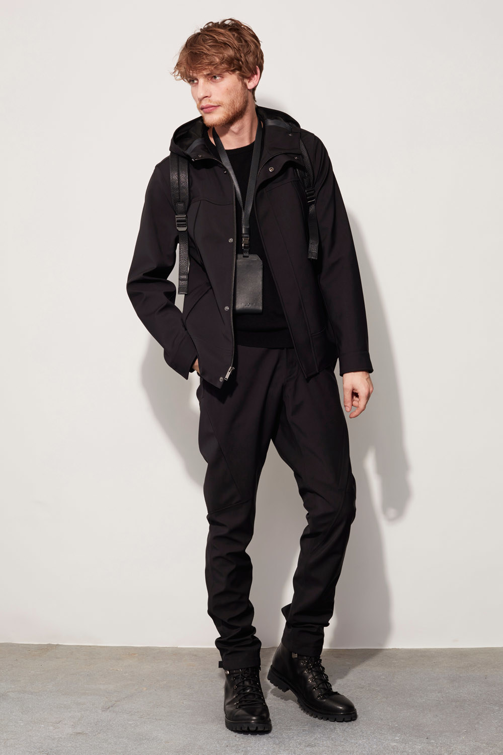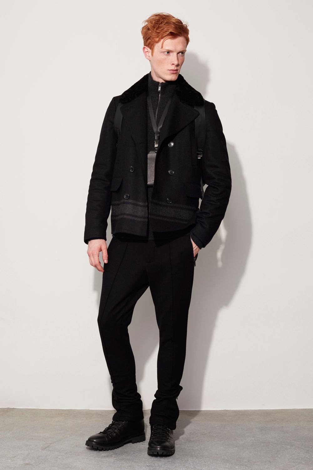 Today’s torrential rain, out of the ordinary as it is for early February, was appropriate for Michael Kors’s men’s presentation. The designer had performancewear on his mind for Fall. He touted a “membrane-backed wool” that he used for skinny trousers, unstructured suit jackets, and actual outerwear as windproof, cooling, and virtually waterproof, too. It could’ve been a boon to editors and buyers shuttling back and forth across the city for the third day of New York’s men’s collections.
