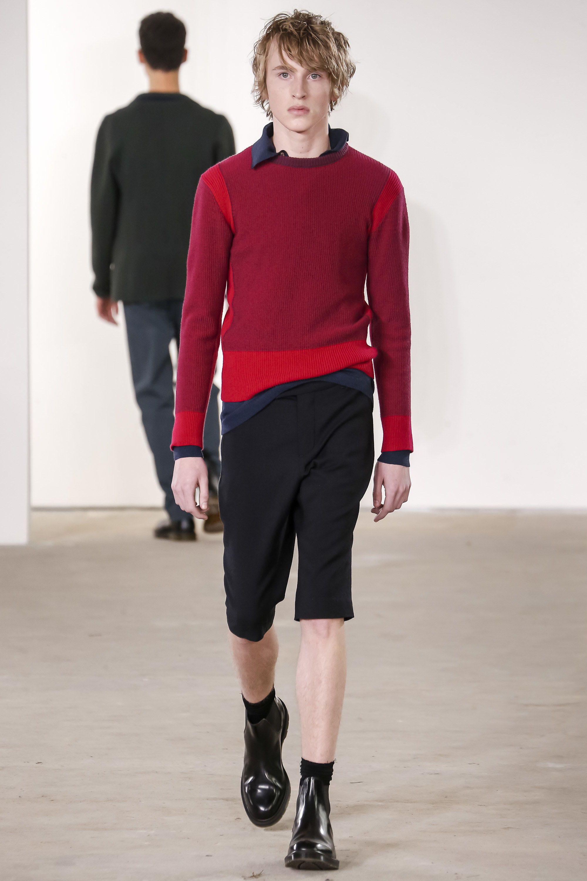 Elsewhere, the interest was in the make of the clothes and their fine details. In the women’s line, the engineered knit pleats were especially well wrought, and the knit faux shearlings had real punch, particularly in a coat featuring an asymmetric collar and contrast trim. The menswear had less pop, but the knit tailoring, trim knit polos, and dense waffle-knit sweaters will undoubtedly have a ton of hanger appeal. The palette was also noteworthy, giving the offering as a whole a poetic expressiveness it would otherwise have lacked. Speaking after the show, Alex noted that one of the animating ideas of the Orley brand is to subtract the machismo from masculine looks, and the palette was one area of this collection where you felt that that modus operandi—a smart one—had been rigorously applied. If the designers can extend that thinking to every aspect of their work, and extrapolate it with the inventiveness they brought to bear in their fantastic unraveled fisherman’s knits, then they’ll be telling a story people can’t wait to hear.