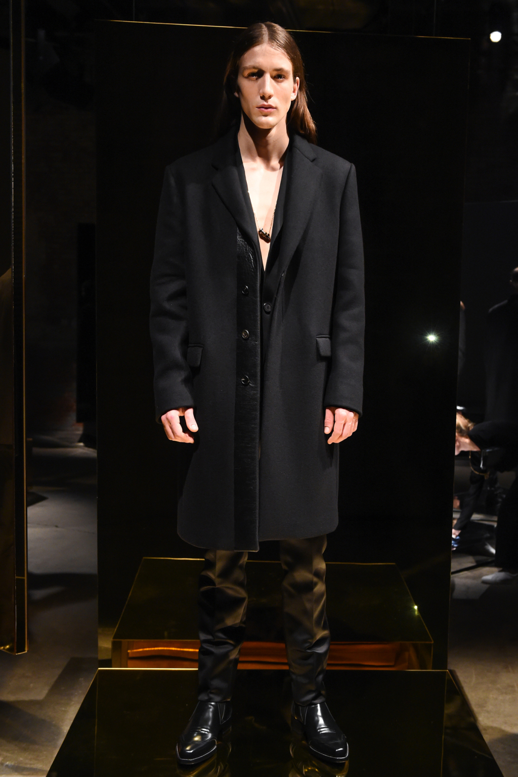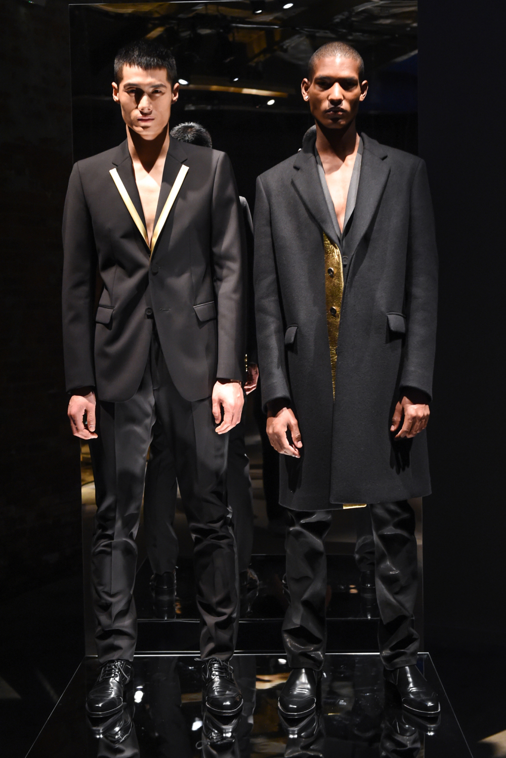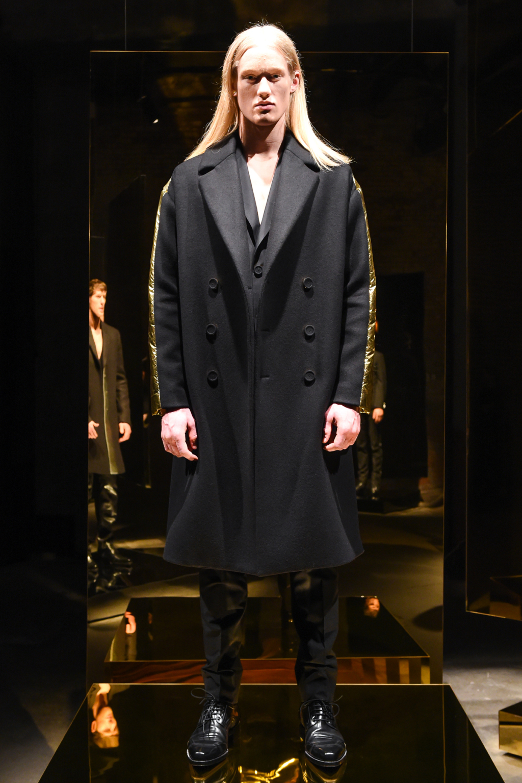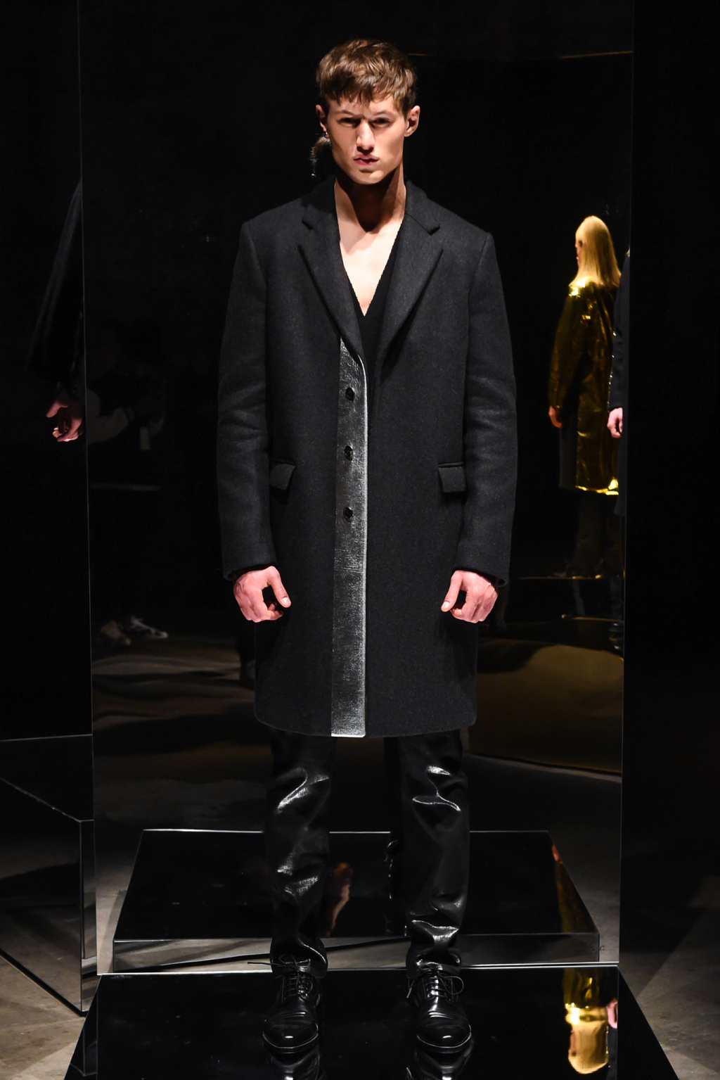 The mainly black offering was embellished with gold and silver panels on lapels, pockets and plackets that appeared on tuxedo blazers and sharply tailored topcoats.