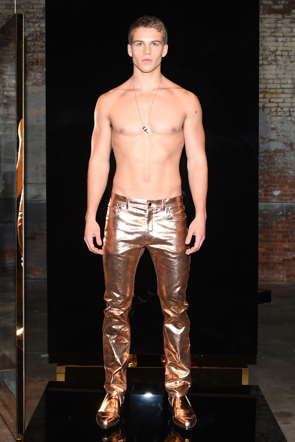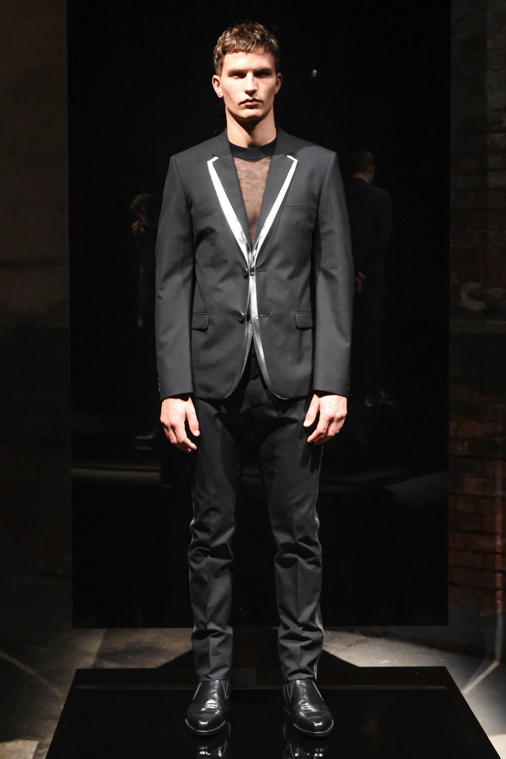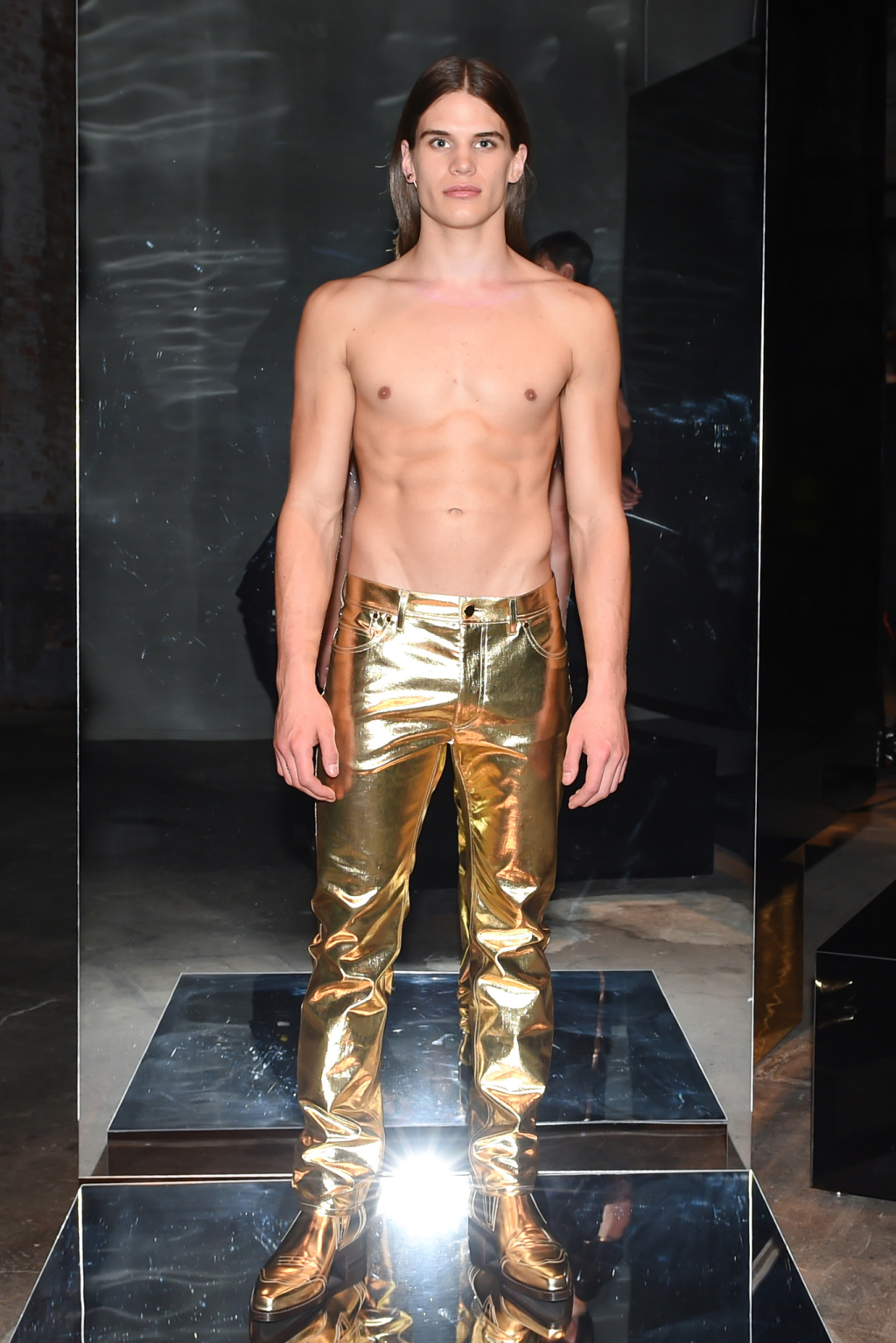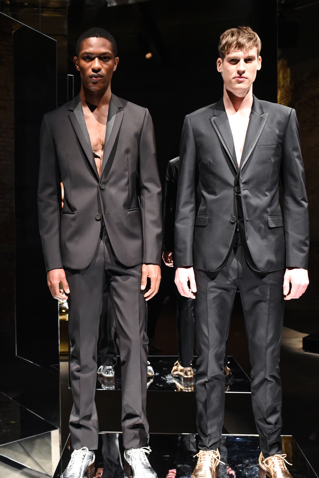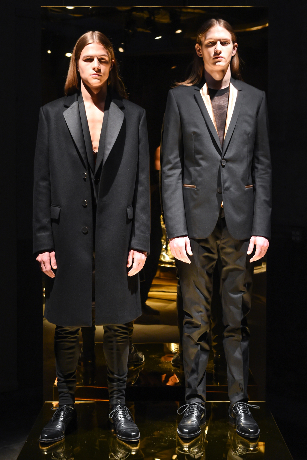 Although the collection was elegant, it was toned down by pairing the evening blazers with skintight long johns and the introduction of gold- and silver-coated denim.