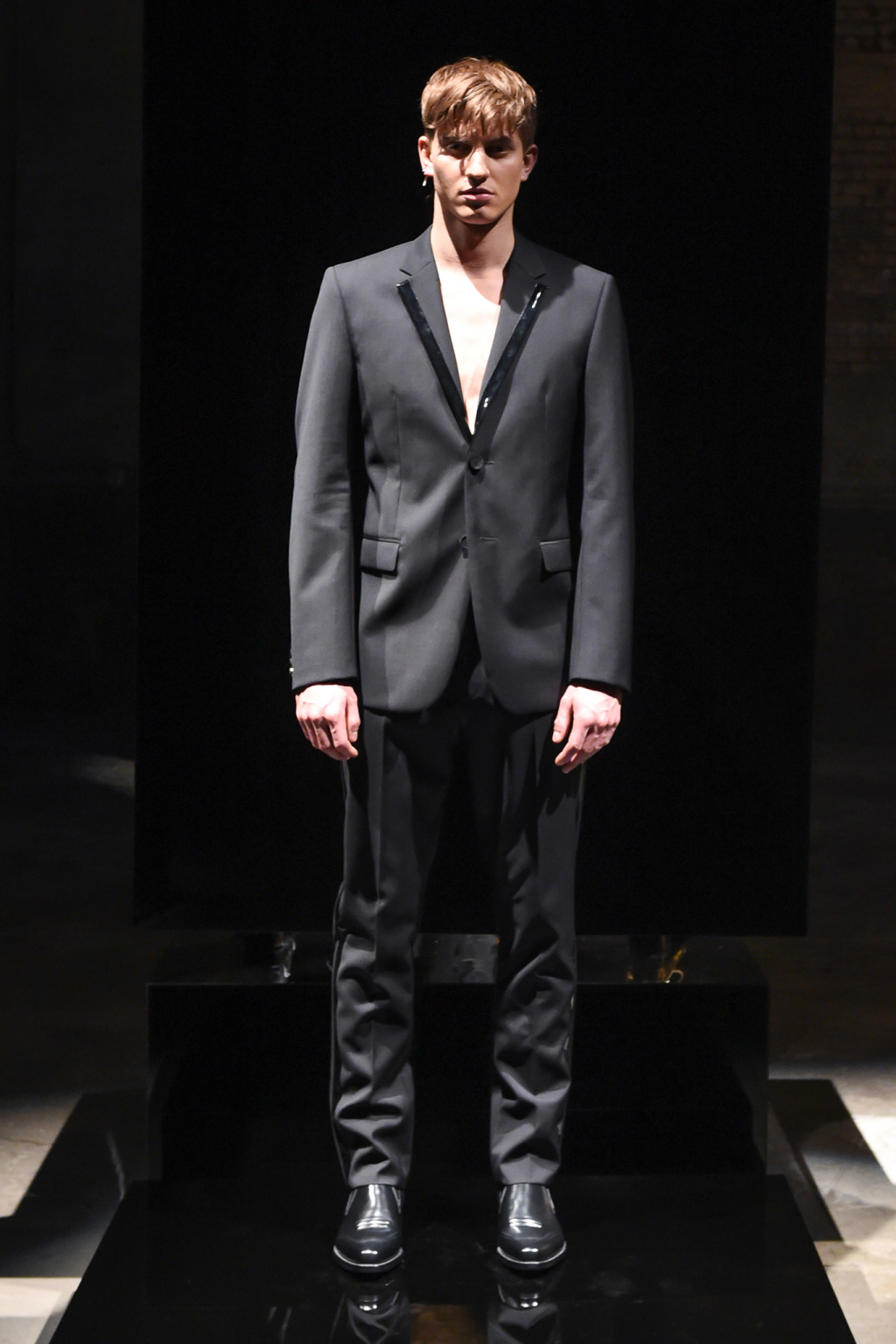 Although the collection was elegant, it was toned down by pairing the evening blazers with skintight long johns and the introduction of gold- and silver-coated denim.