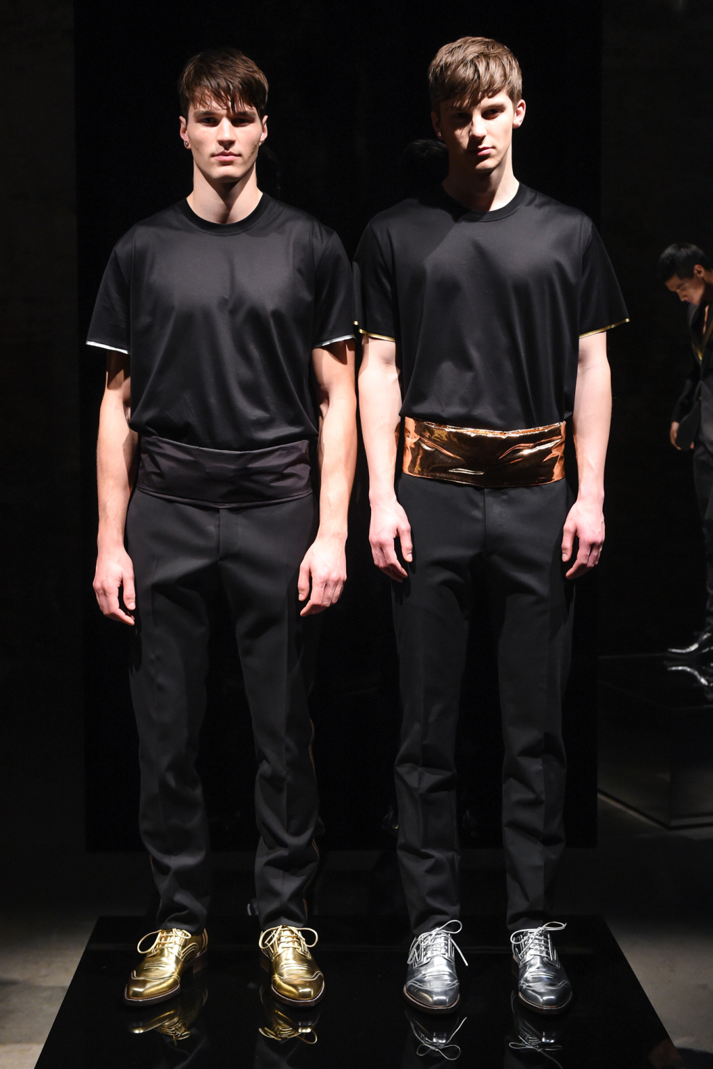 The mainly black offering was embellished with gold and silver panels on lapels, pockets and plackets that appeared on tuxedo blazers and sharply tailored topcoats.