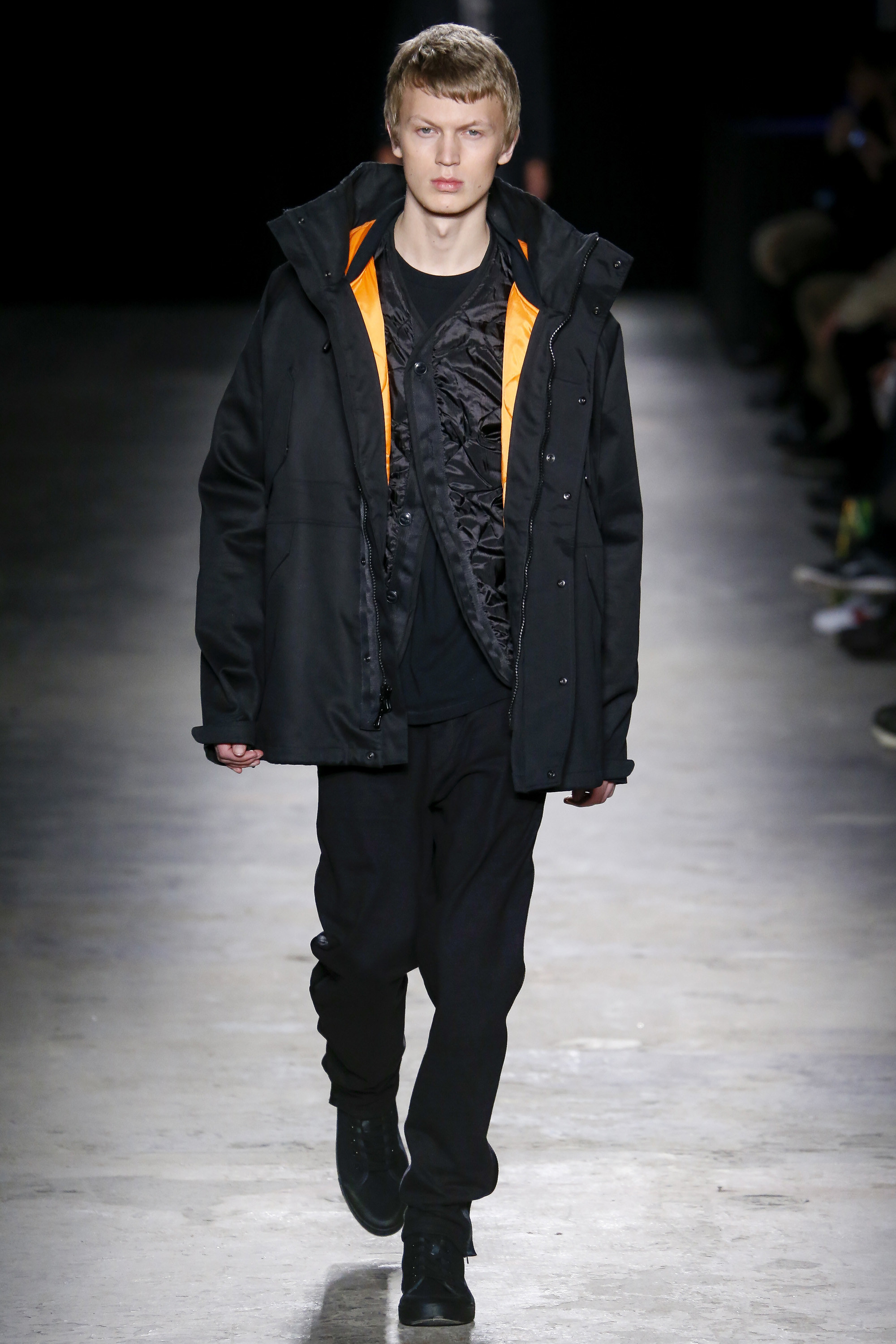 True to his word, there was nothing hard to understand about these clothes, at least on the men’s side (admittedly, it was a little taxing to dart one’s eyes back and forth between the women and the men, which is why there were two Vogue Runway reviewers present tonight). Put earnestly, the collection embodied a return to form for Wainwright and Neville, recalling as much the early days of Rag & Bone—the stuff that made them so big to begin with, like the aforementioned sartorial Britishisms—as the more recent Rag & Bone, with technical applications abundant. A black woolen hoodie was expertly cut and exceptionally strong, all refined street and confidence. Look 1 featured a parka that everyone in the room could have benefited from this past weekend (the technical) over a skinny-sliced wool suit (the tailoring). The guys were also smart to include some slogan play (which can actually go wrong fast, but it’s on trend). Their phrase, as seen blown out on sweatshirts: Rag & Bone Universal. Fitting. Combined with muted bombers (less Alpha Industries swag, more soft and layerable), some nice tapered jeans, and outerwear for everywhere, almost everything pleased (though some of the BMX nods and a certain shade of tangerine seen on a quilted jacket were less successful).