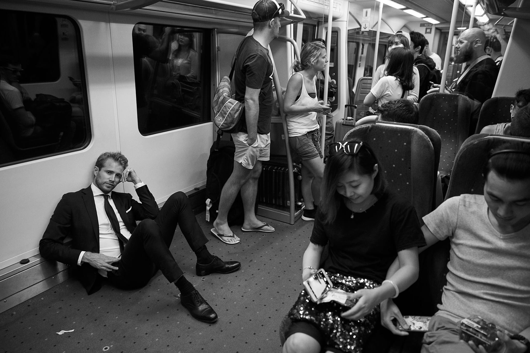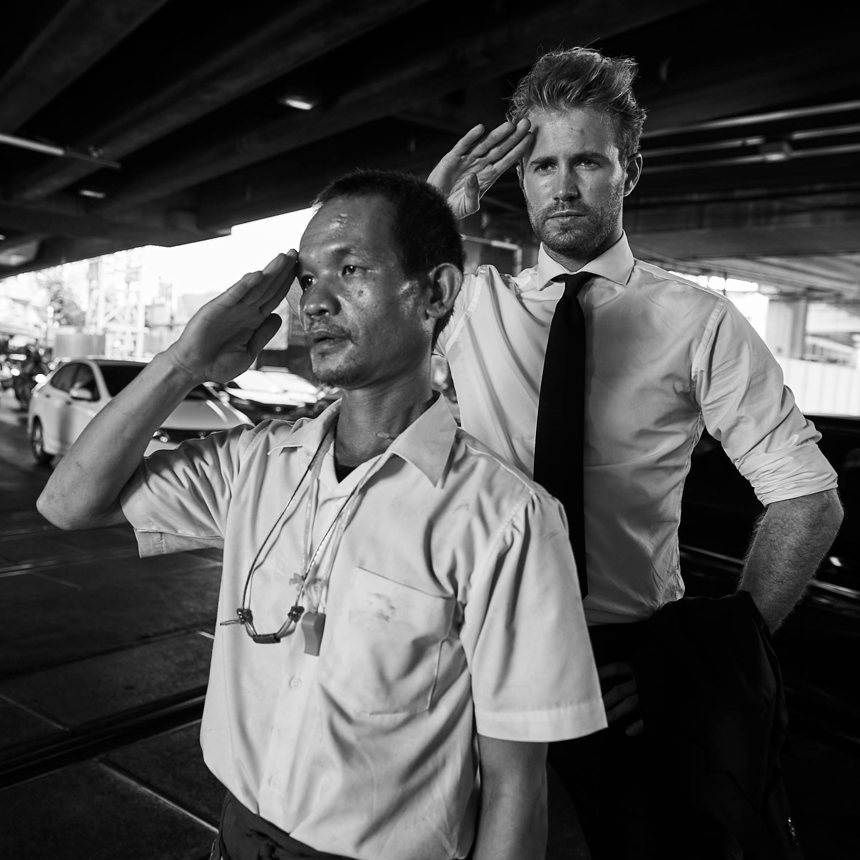 This pic was taken in Kuala Lumpur just after we stepped off the overnight bus from Singapore. Tom had been hoping for some rest and another flight, but instead he got an overnight Greyhound that passed through two border controls. Worse, each time Tom thought he was ok to nod off, the lights came on and we disembarked to face armed guards. But at least the bus was fast. So fast in fact that it dropped him in the middle of KL two hours early – all dressed up and nowhere to go. Today was the day of truly unexpected drivers. Our first taxi driver was a colourful character, full of great stories. He proudly held up his right hand showing three fingers. It seems our mate used to be a bit of a brawler, but is a refined character now. Next we ended up hitching a ride with two friendly policemen. It seems they took pity on a weary-looking Tom and chauffeured him around Kuala Lumpur trying to find him a bacon & egg muffin. Finally, just to make us late – Tom hitched a ride in a couriers side car. We say hitched a ride, but really he just did donuts around a major roundabout. It’s fair to say that we’re beginning to push Tom over the edge. Hitting three countries in 24 hours will do that to a man. From KL he took an unfairly short flight to Bangkok (where it was even hotter). Making the most of his time on the ground between the two Bangkok airports he commandeered a Tuk Tuk for the afternoon, zipping from temples to street side markets and a muay thai bout. He even charmed his way into driving the Tuk Tuk until Bangkok’s insane traffic forced the driver to take back the handlebars. What started off as an easy transit soon fell apart at the seams, with Bangkok’s legendary traffic halting Tom’s thrills on the Tuk Tuk as he was forced to walk back to a train station on foot, before queuing for one of the most packed trains he’s ever seen. Back at Bangkok airport he’s spent the last 25 minutes trying to blag his way into the lounge. Charm looks like it’s winning, but his sun-cracked face, bloodshot eyes and wayward hair are working against him. Tom: gradually losing his cool. Suit: uncrushed.Bangkok, Thailand. Behind the Scenes shots from: