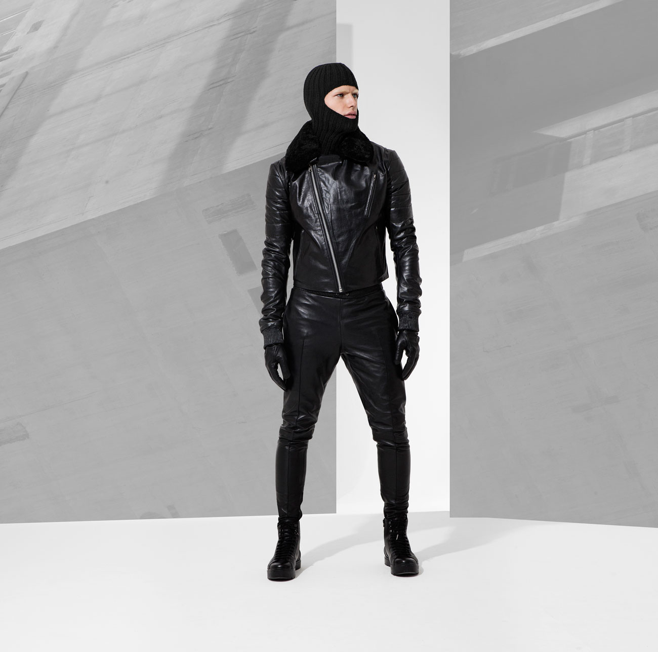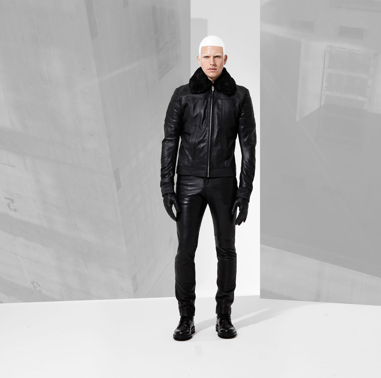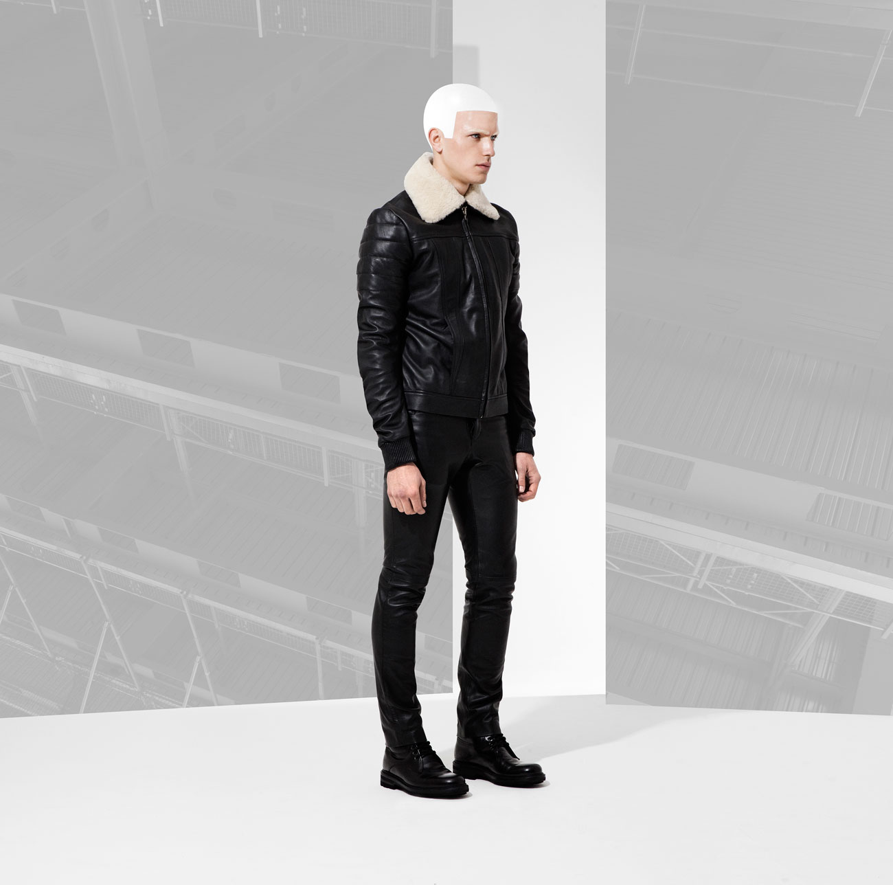 Fall/Winter 2016 menswear collection from British designer Domingo Rodriguez. He quoted “Our AW16 collection has a slight nod to Star wars, storm troopers and Han Solo. It’s regimented, more robust, a tougher play in our own custom tanned leathers in matt and shine glazed and buttersoft finishes. The feeling of protection in textures through padding, removable sheep skin collars and a stronger shoulder. Theres a luxe sensuality being toying with, in leather on leather tough looks.”