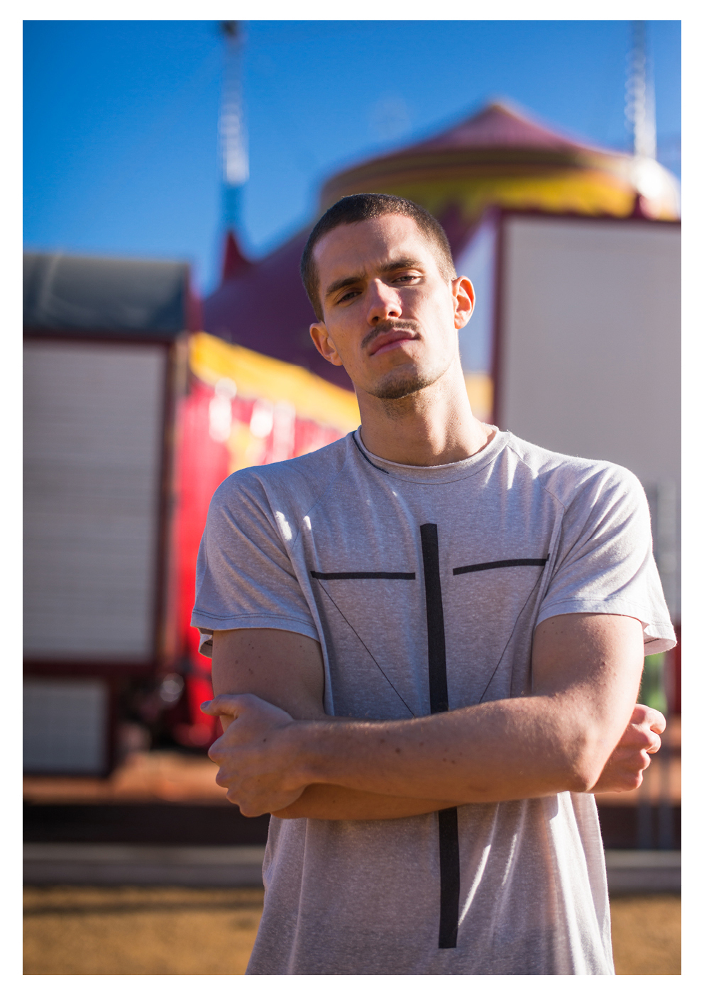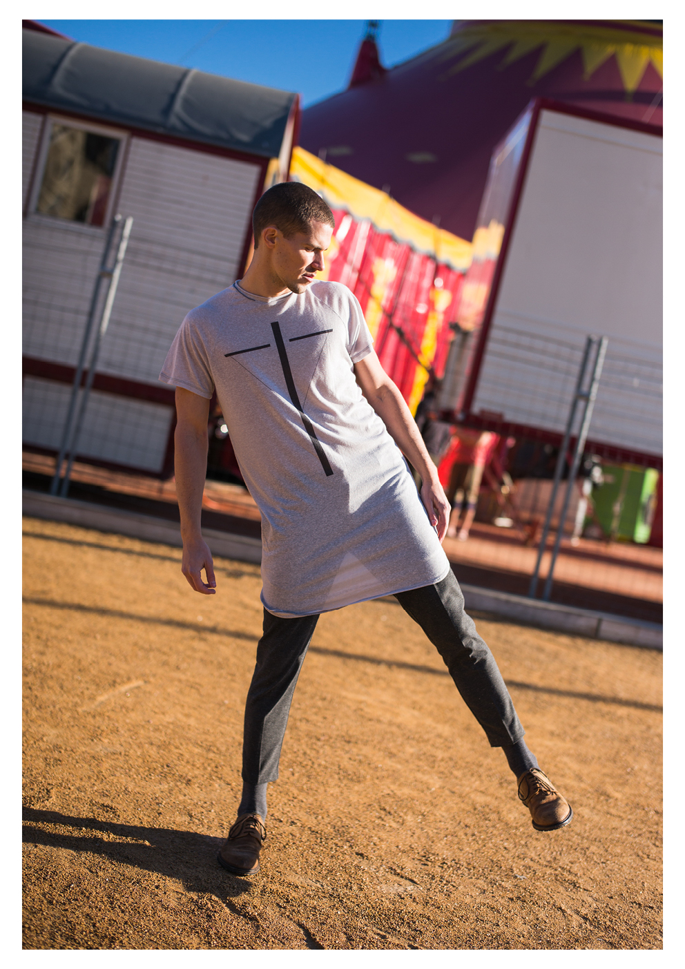 The collections’ photoshoot was shot in Geneva by photographer Jeremy Spierer with model Franck Vionnet, during the circus’ visit to town. The colourful set and the contrast between the urban landscapes made it the perfect background for this collection shoot.
