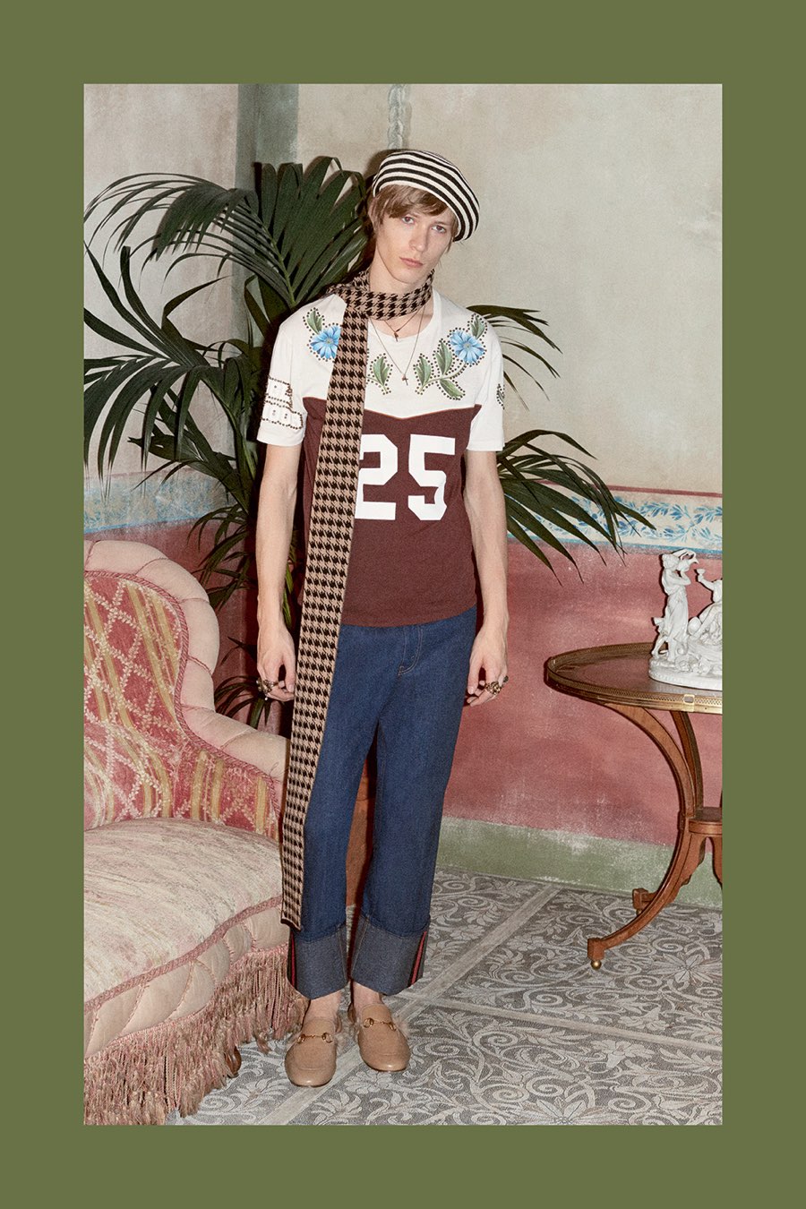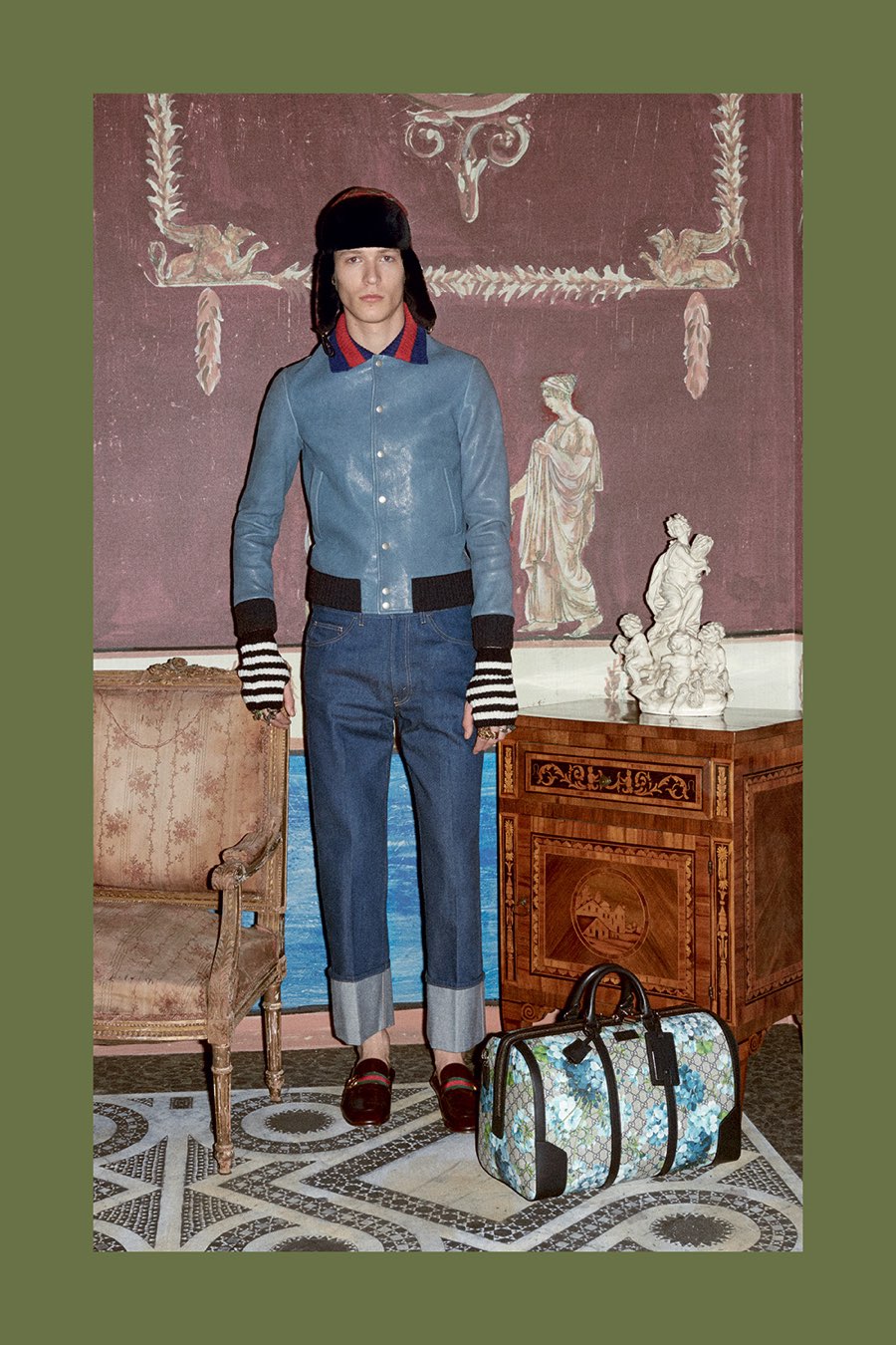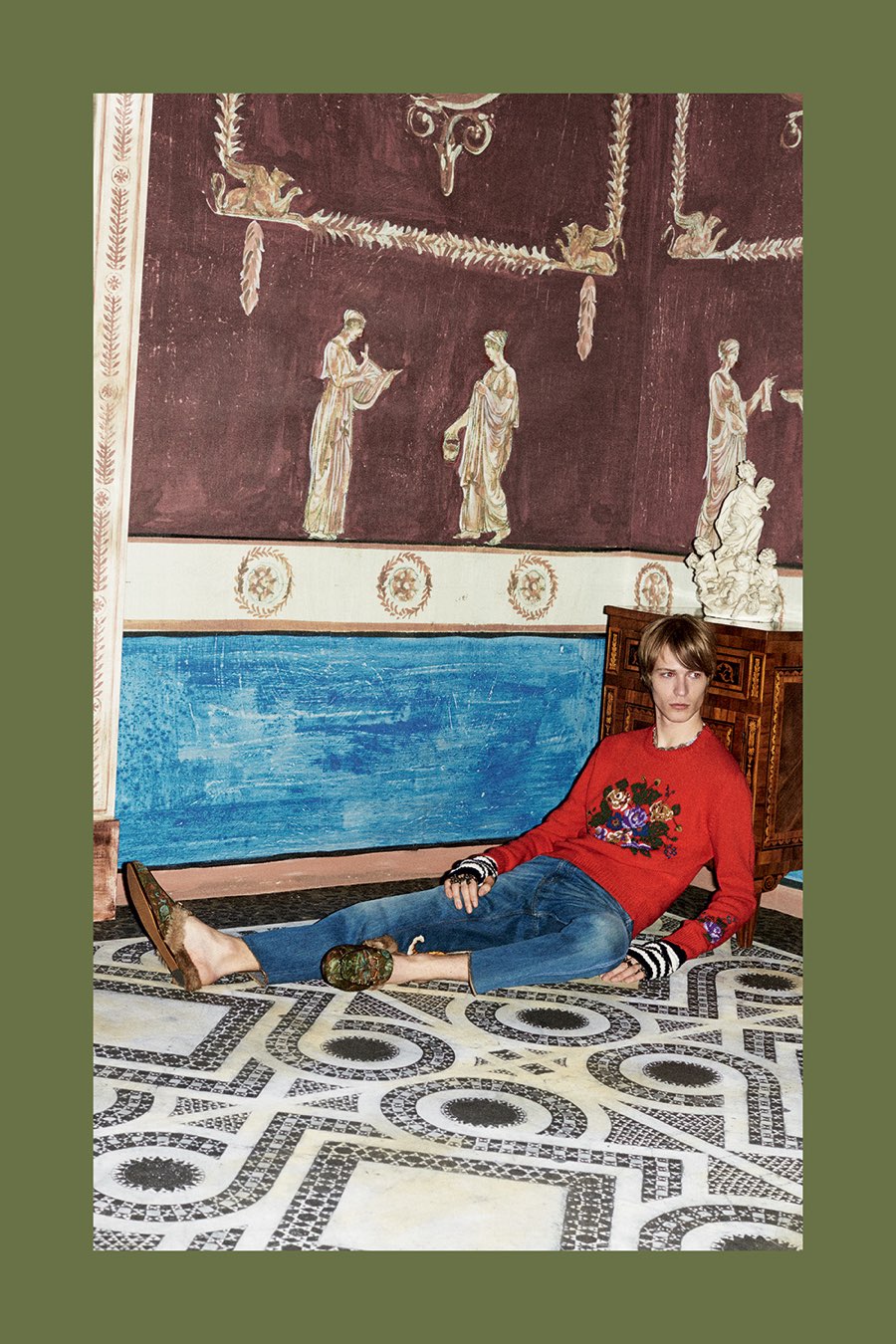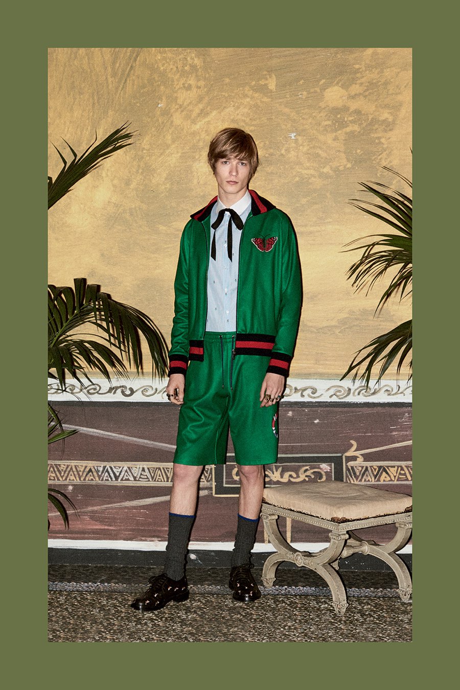 From the #GucciPreFall16 men’s collection by #AlessandroMichele, a sweatshirt with snake appliqué, accented by floral embroideries. Starring by Sven de Vries. Some itmes and garments are crafted in leather and printed with a tropical plant and bird motif. Photo by #AriMarcopoulos.