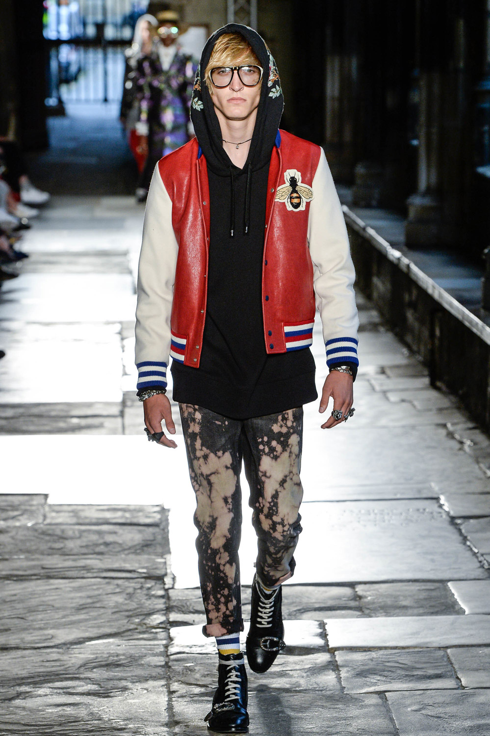Of course, it was all a very cleaned-up, immaculately made Italian version of the ramshackle scruffiness and don’t-care-what-anyone-thinks attitudes that actually characterize the British of whatever class. Along the way, he touched on some of the subversive styles British-born designers have contributed to the national archive of fashion, from echoes of Vivienne Westwood and her tartan bustier ball gown to the pretty-baby Victoriana of Edward Meadham of Meadham Kirchhoff. Still, in many ways, this was a continuation of everything people have come to love about Michele’s work since he took over such a relatively short time ago—from his animal-symbol embroideries to the glittery bombers, down to the embroidered bags and pearl-studded loafers. All in all, it was a moving snapshot of what luxury fashion has become since Michele came along to reset it: not one single identifying look, but almost a hundred, and within each one, something accessible, be it a hair ornament or a pair of jeans, to pull in the next generation of customers.