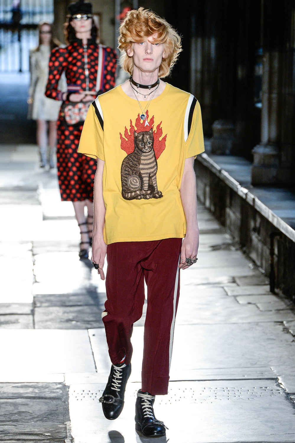 Queen Elizabeth II was crowned there, Princess Diana had her funeral there, and Kate Middleton and Prince William were married there. And now, Alessandro Michele has thrown a Gucci fashion show at Westminster Abbey. Cue predictable disapproval from British traditionalists—even though the Resort collection was shown in the Cloisters, not in the hallowed Chancel where British monarchs have been crowned for centuries. But this could not have been a more sincere compliment to English tradition, as filtered through the hyper-colored, hyper-eclectic sensibilities of an anglophile Italian. Asked why he chose London and the Abbey, the enthusiastic Michele threw his arms to the vaulted roof: “To dive in this gothic sea of inspiration!” he exclaimed. “The punk, the Victorian, the eccentric—with this inspiration, I can work all my life!”