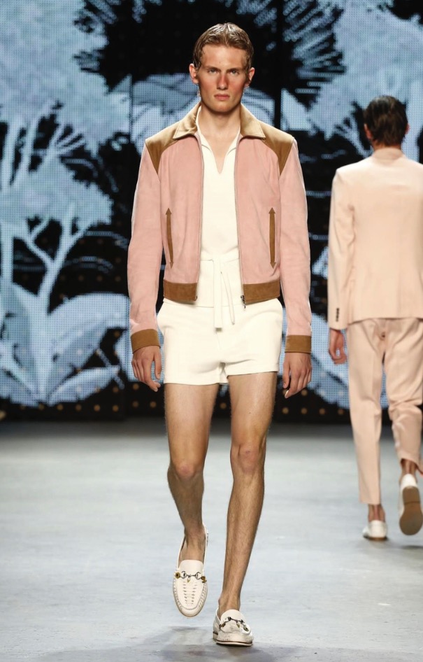 TOPMAN Design live in London Collections: MEN presenting its Spring/Summer 2017. Respecting the color palette assigned of a colorful rough designs and some vintage nautical graphics presented in jackets, pants, shirts and mini shorts set in 2017. Mini shorts focusing once again trying to be the stelar of this runway, TOPMAN presented the idea back in LCM 2016, but the costumer was not intrigued by it. Sweatshirts and bomber jackets still coming strong, they never go away, trousers with long jackets in black reigined again the catwalk, sutile 50ish design, remembering those costumes from Marlon Brandon and Elvis Presley. TOPMAN is giving to costumer new things new colors and trying to fit thos tiny shorts… one thing… pink color (in all shades) will be the cherry on top!