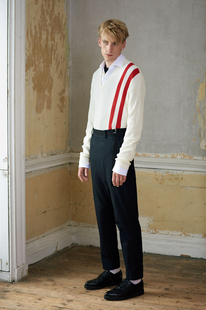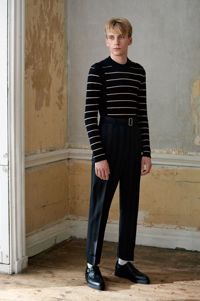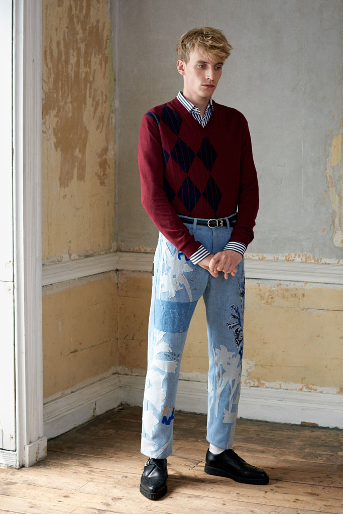 What unites those two eras is a dandy-ish, romantic sensibility, which Pringle’s men’s wear design director channeled into his roughed-up denim, lightweight knits, textured cotton sweatshirts and soft military jackets.