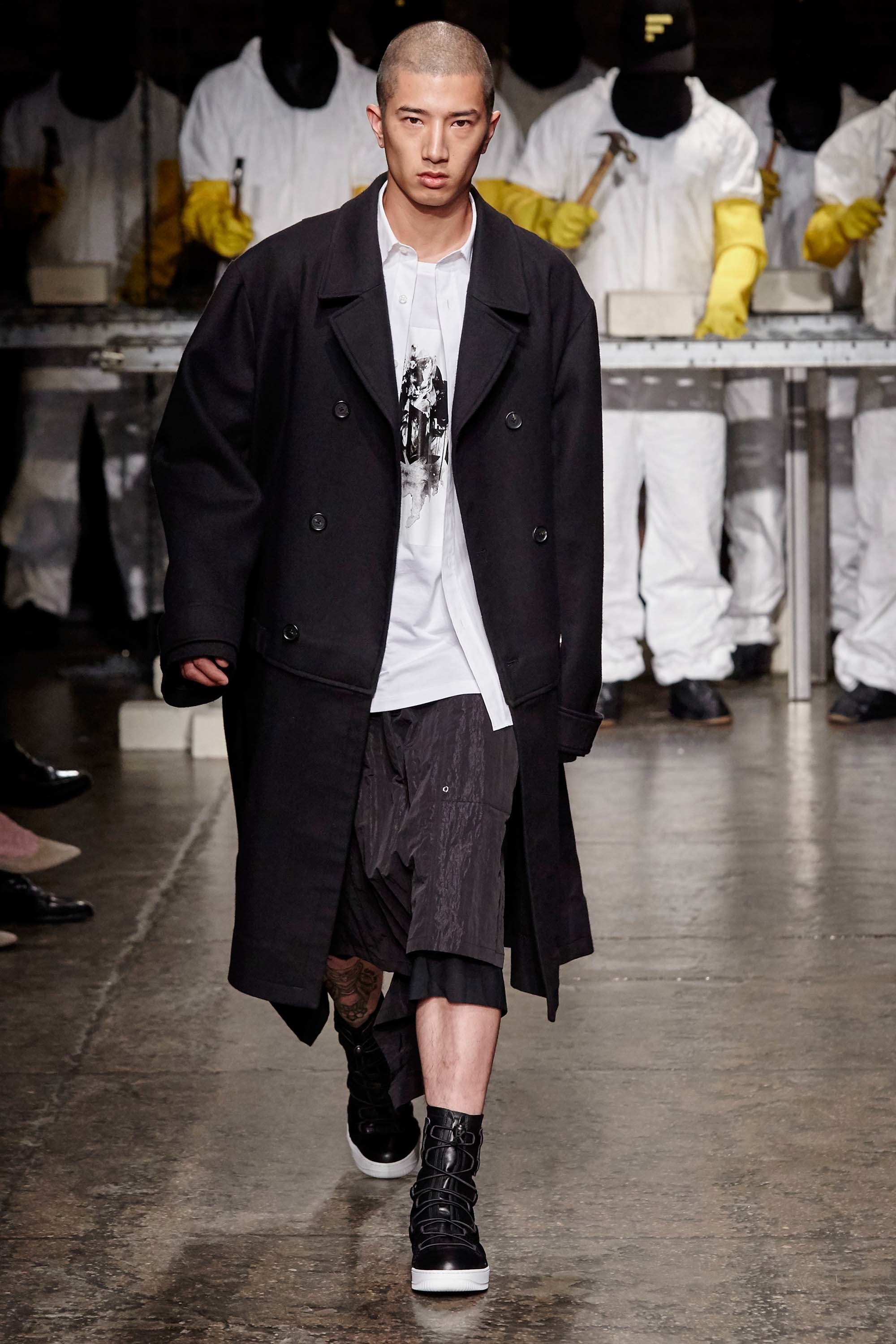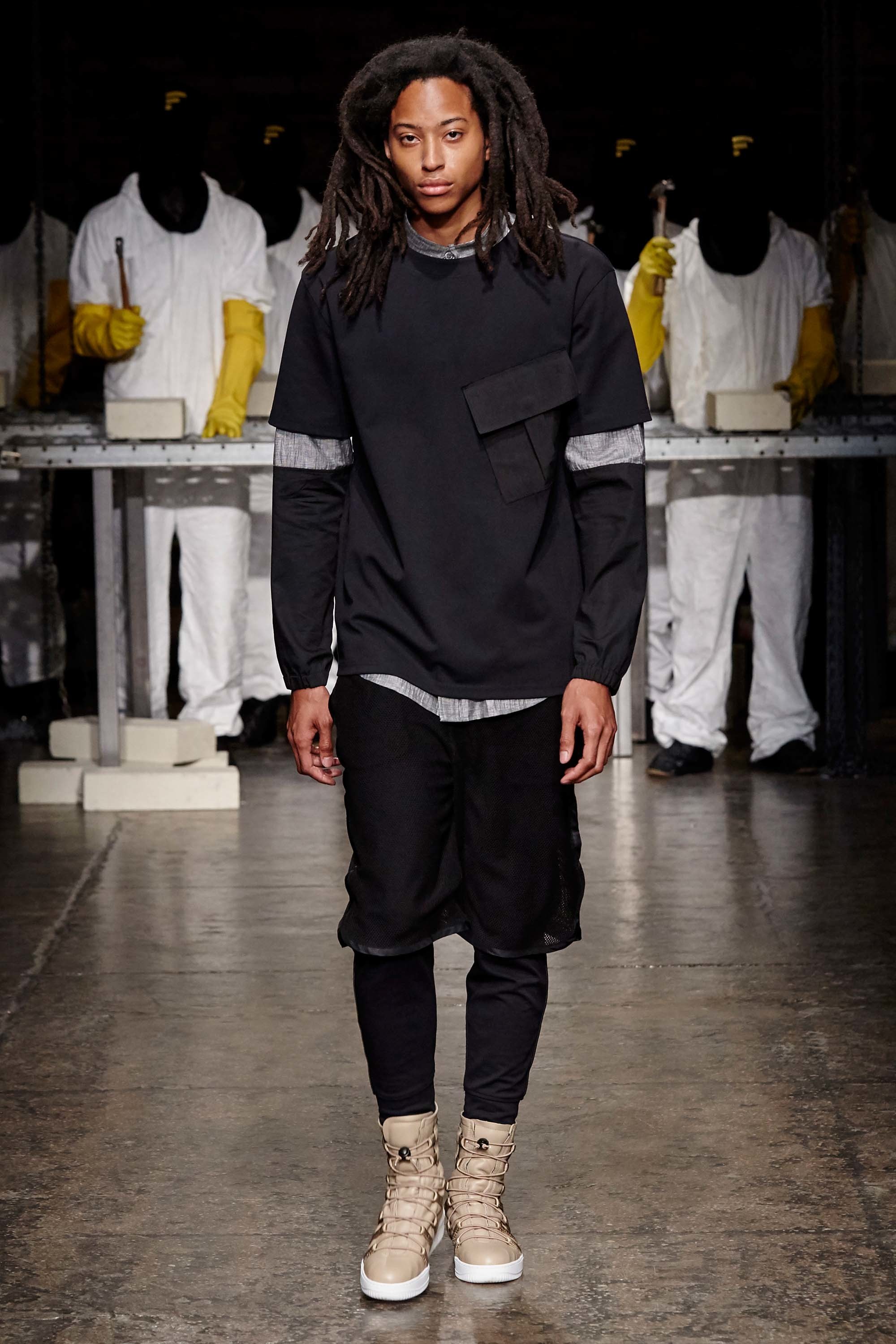 Actually, given the anti-authoritarian tone of the clothes on the Public School runway, not to mention the show’s backdrop of faceless factory workers hammering away pointlessly at cinder blocks, it’s altogether more likely that Chow and Osborne would be snubbing fashion shows for a trip to Athens or Madrid or any other town where the youth are more or less in open revolt against “the system.” And thanks to the state of the current U.S. presidential election, they may not have to travel very far. Suffice to say, the Public School boys have picked up on the queasy mood among the young—and though it’s certainly a worthy effort to read that attitude into clothes, it’s also a tricky thing indeed to convey it via the medium of commercial fashion. Even the most sincere effort runs a high risk of seeming glib.