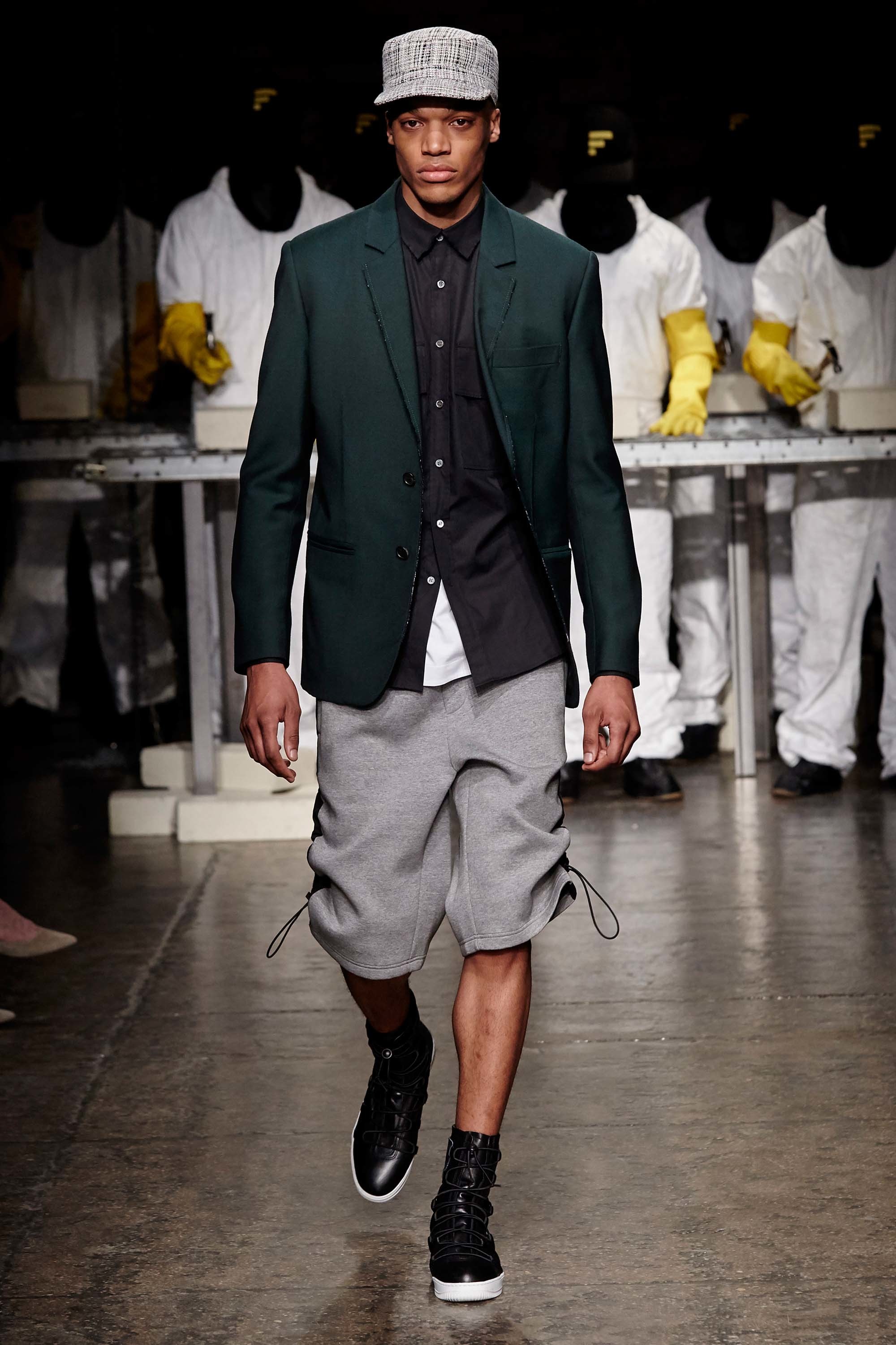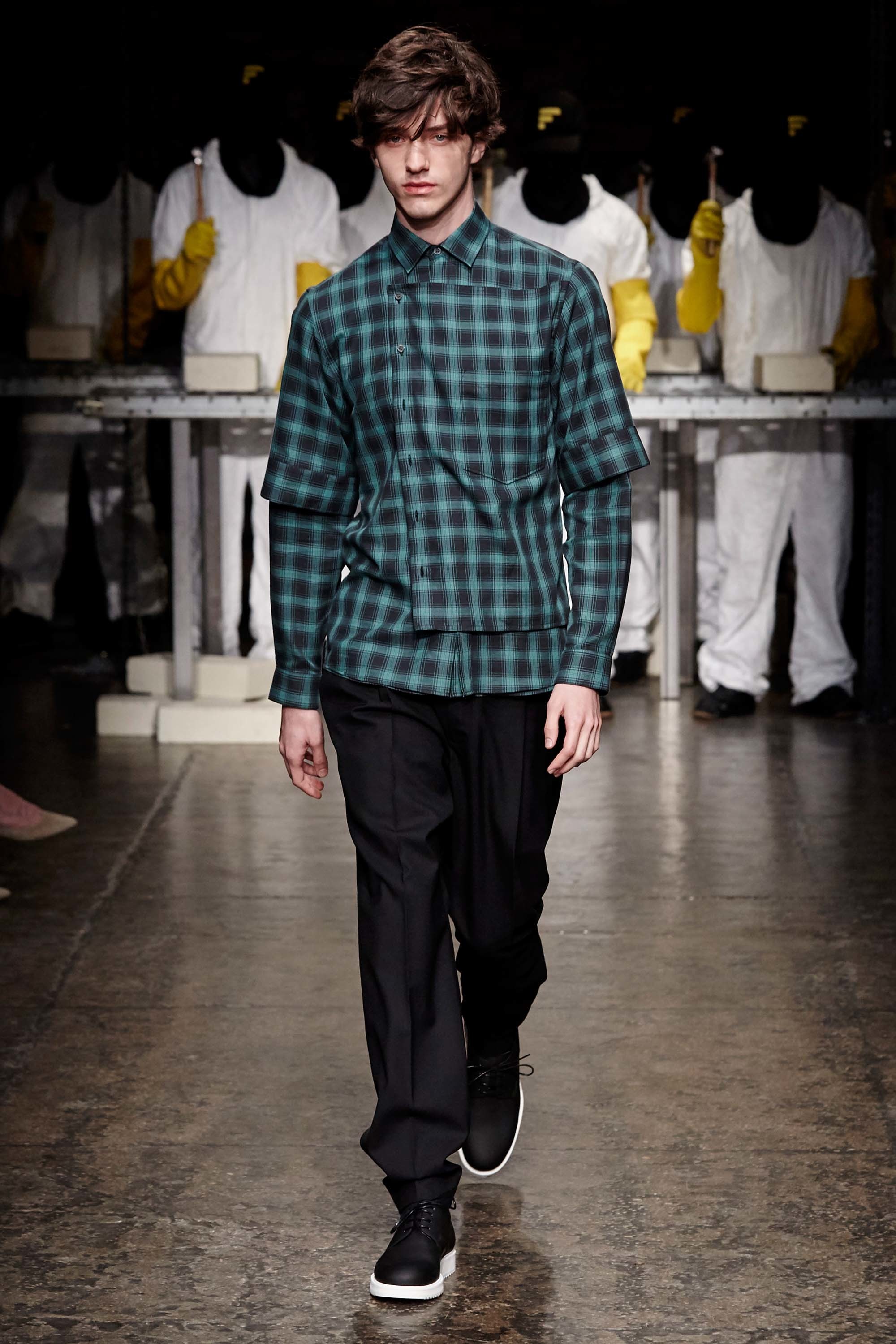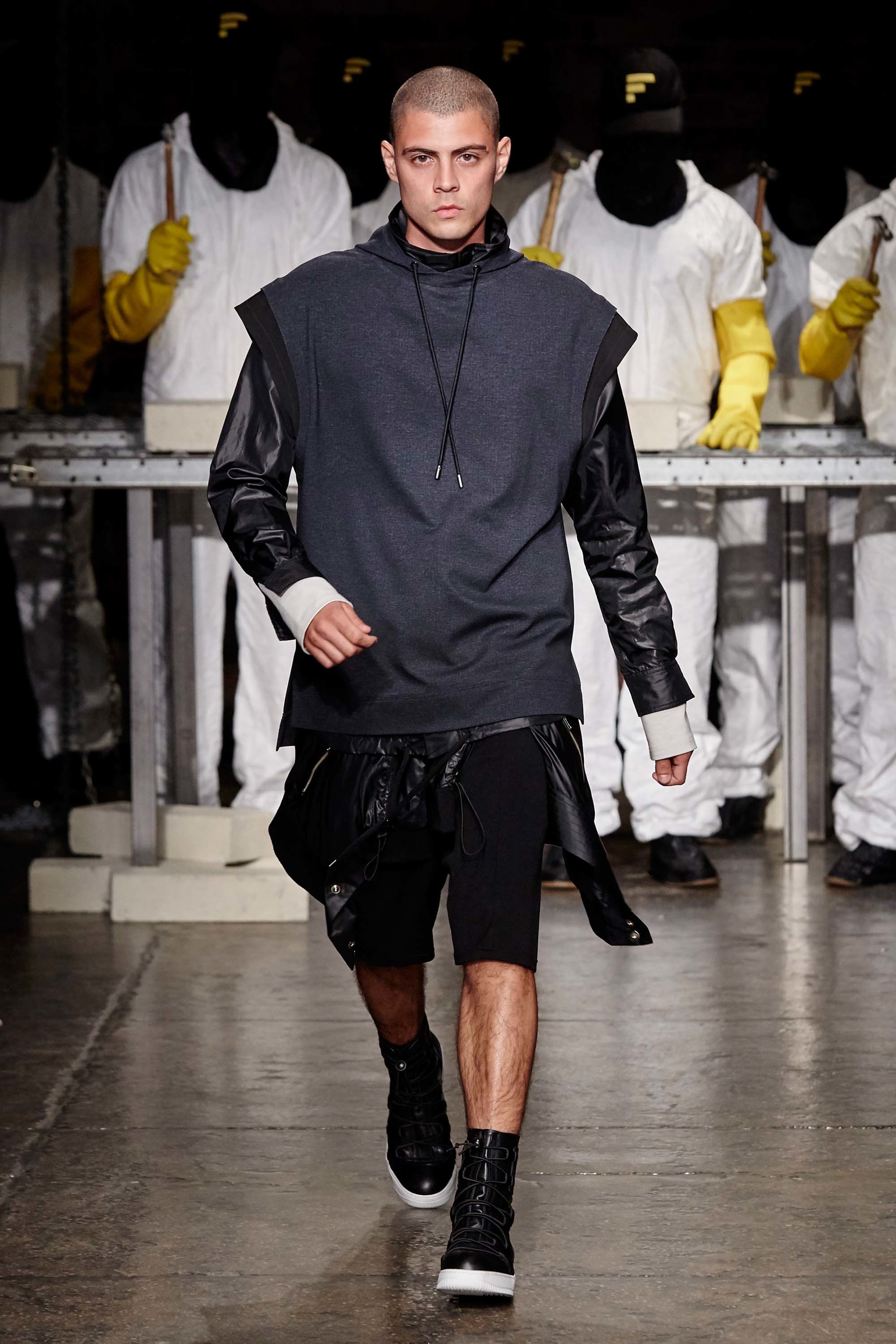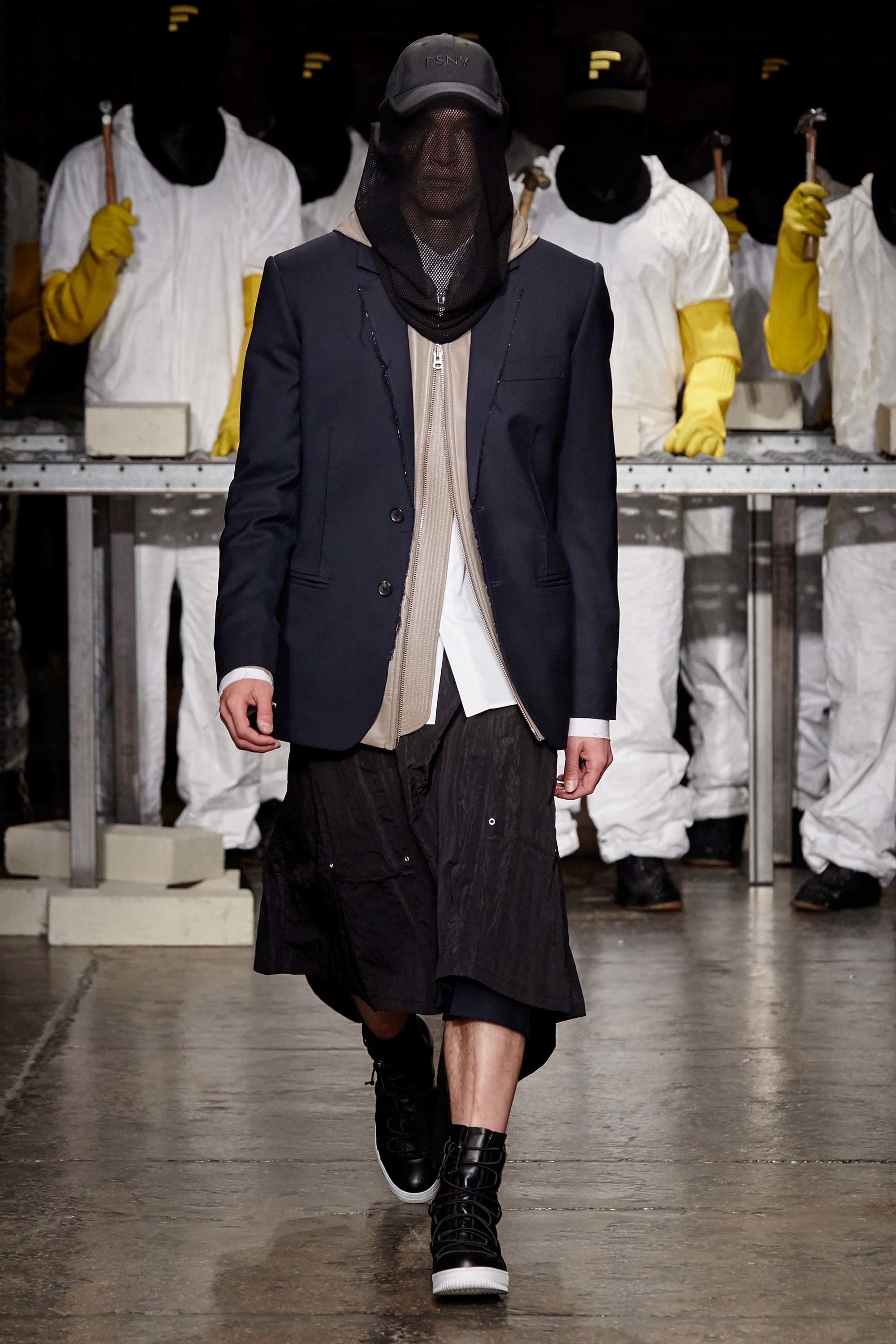 This collection didn’t quite meet the challenge. But it offered up some thoughtful propositions along the way. Chow and Osborne’s very good idea, here, was to conceive an urban guerrilla force uniform—one nonstandardized and scavenged together from whatever rough stuff was at hand. Both the men’s and women’s looks incorporated slashed garments, frayed tailoring, and parachute-nylon parkas and silk prints in eyeball-searing, caution-tape yellow. The print, the designers said after the show, was intended as a kind of flag. The ragtag quality of the looks got the scavenged effect across nicely; the call for collective action might have been clearer if the range comprising the ragtag army’s uniform had been, well, a little more uniform. One suspects that commercial considerations got in the way of that.
