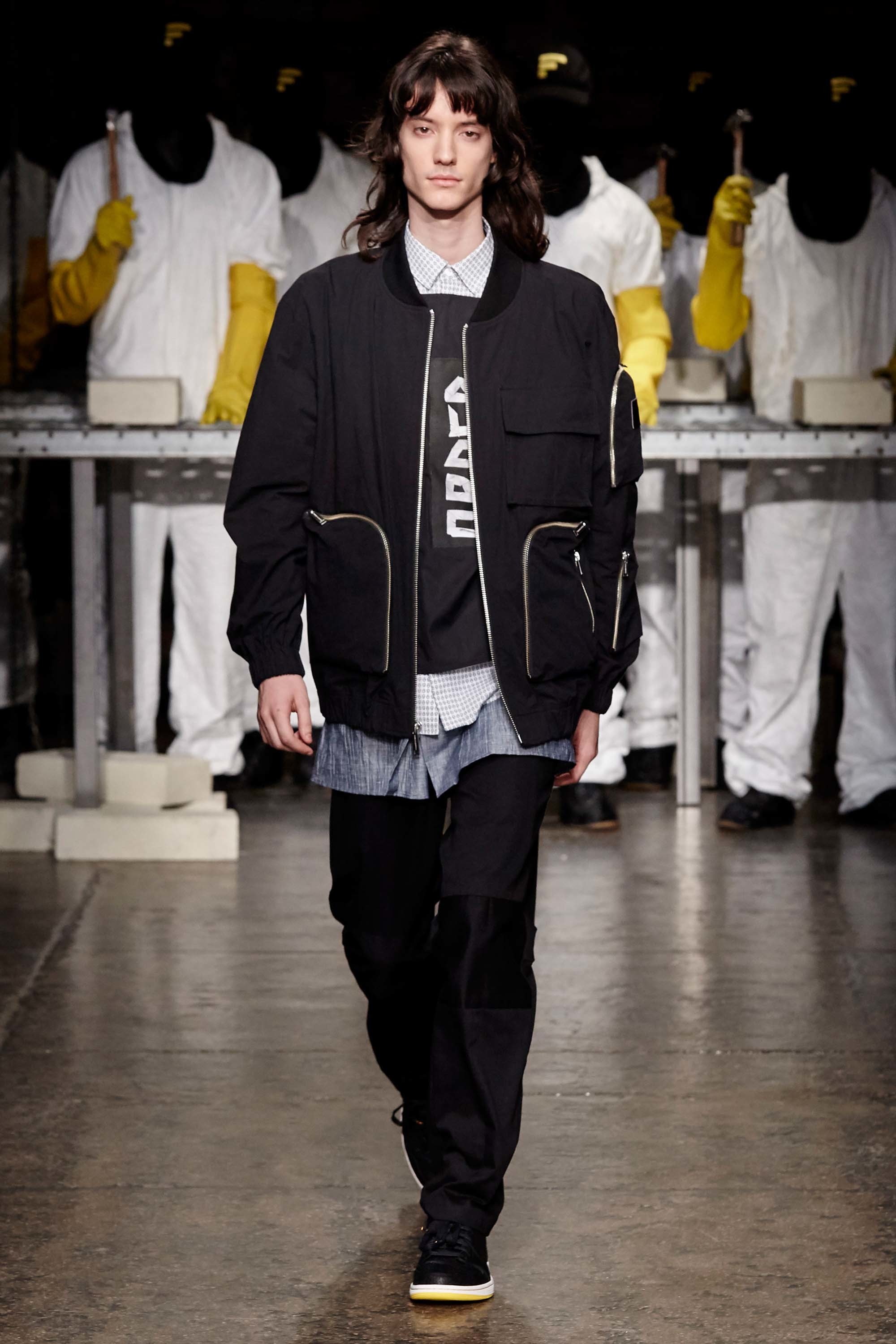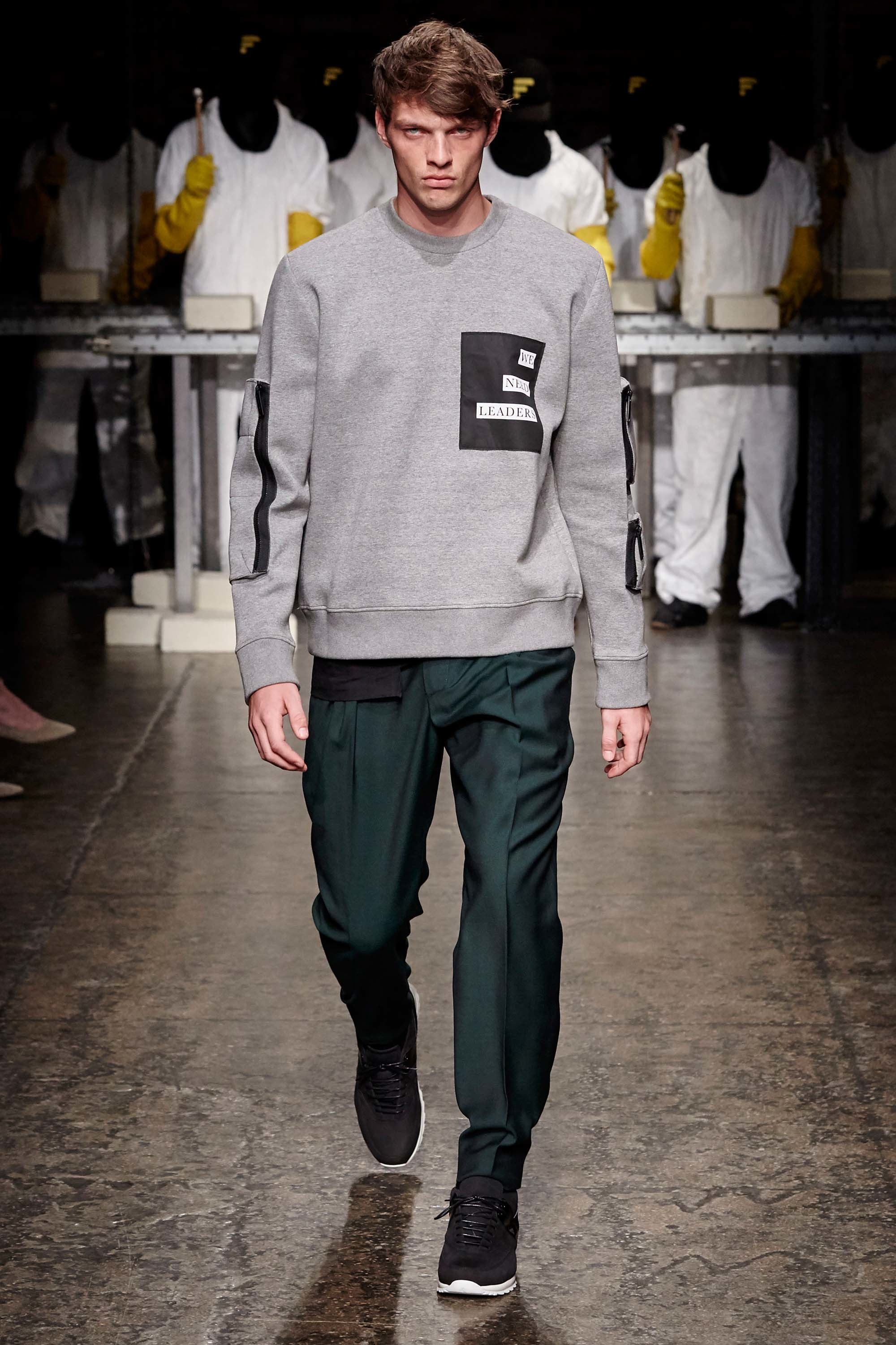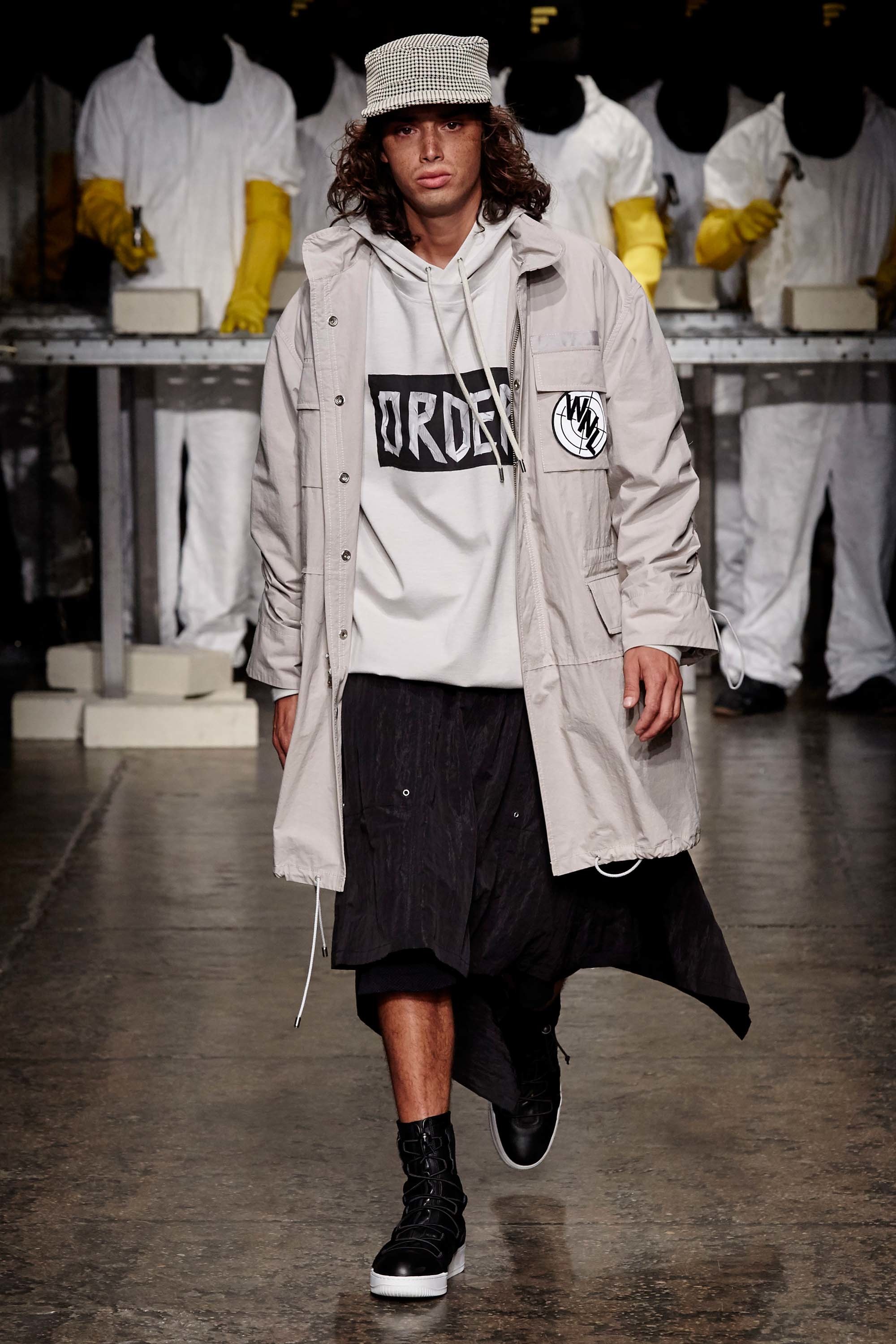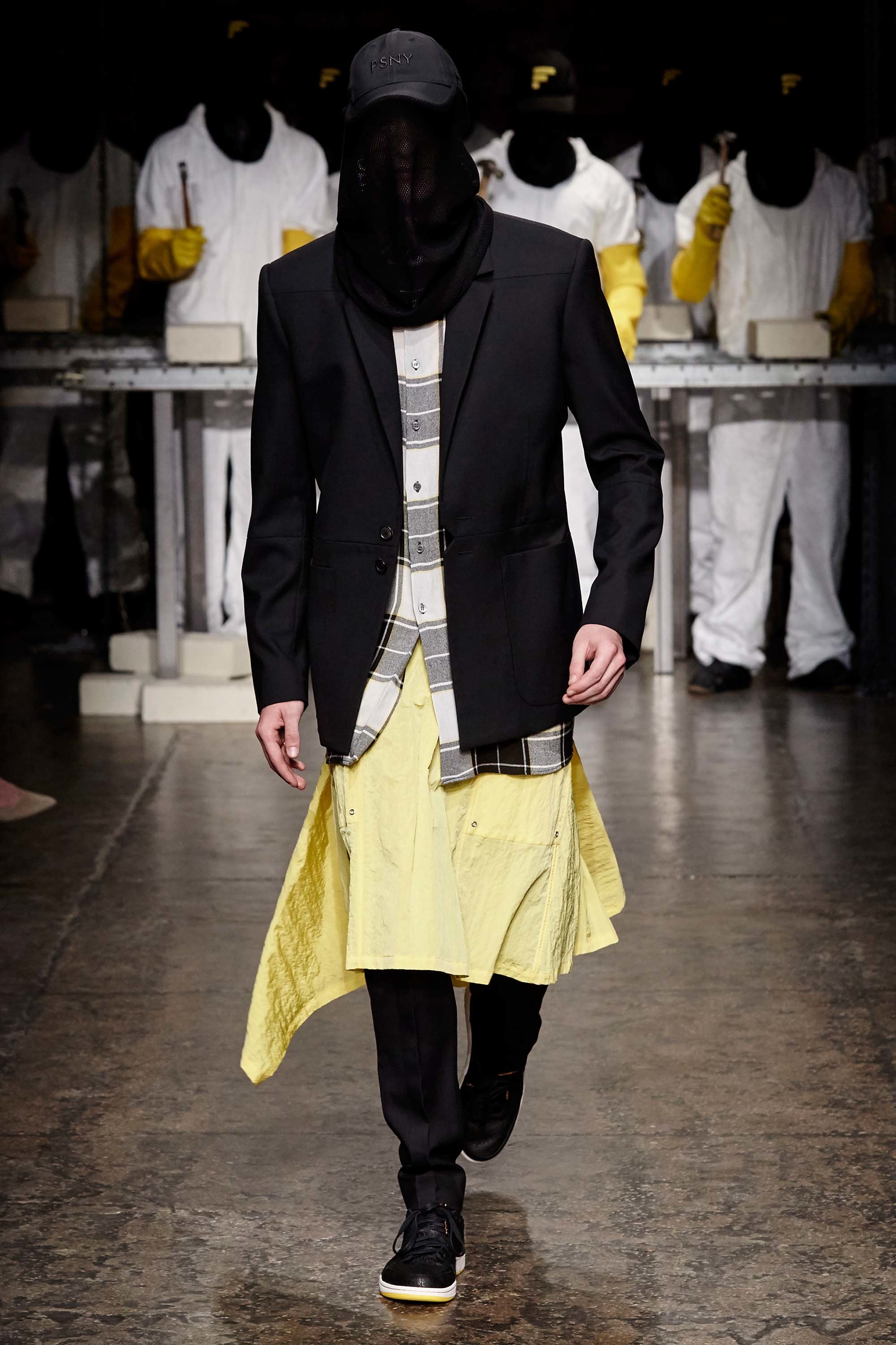 Aside from that (intentionally) gaudy yellow, the catchiest aspects of this collection were its graphic, black-and-white melted flower print—a surprisingly pretty material used in a few of the women’s looks—and the patches on the men’s garments with the letters WNL scrawled over them. The letters stood for “We Need Leaders”—sort of a strange rallying cry for a collection with anarchist pretensions (Mr. Robot himself was in the front row, by the way) but one that Chow and Osborne indeed intended as ironic. “No more false leaders,” Chow said after the show. “No more false gods,” echoed Osborne. Or, as a certain leader once put it: “We are the change we seek.” Aux barricades!