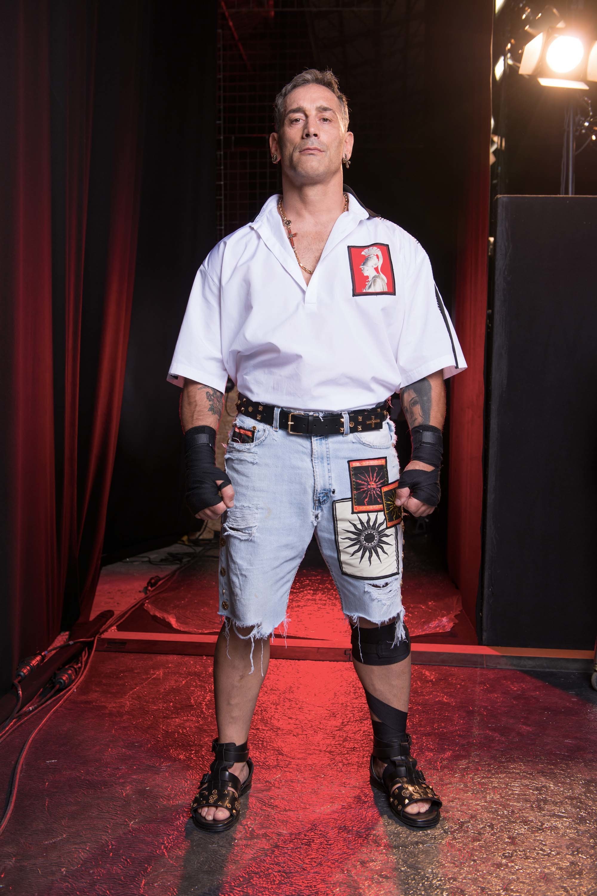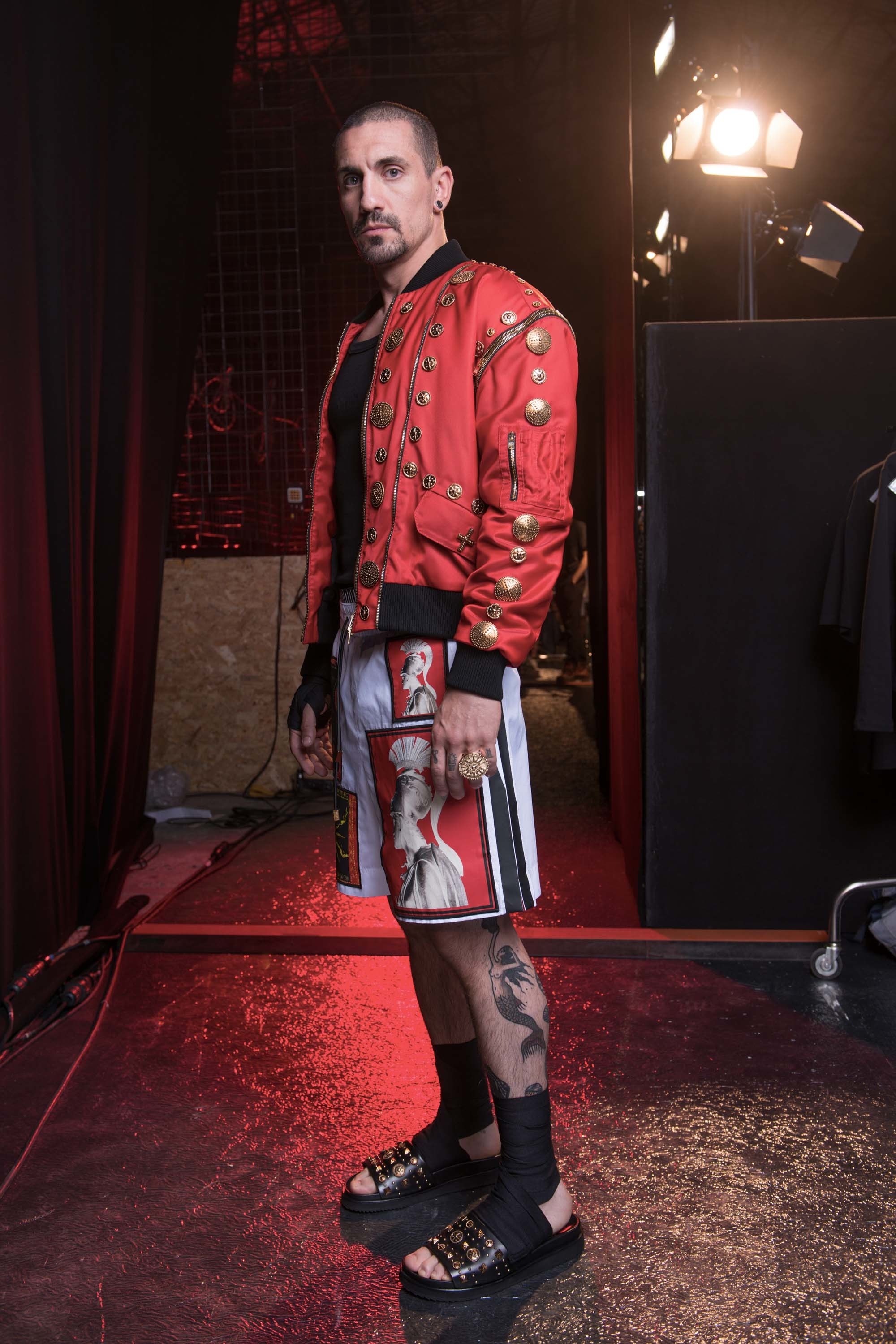 While the kind of men who will shell out big bucks for a bedazzled bit of womenswear are, even today, few and far between, there are guys who will be drawn to Puglisi’s unapologetic adornment. “Men so many times are more free,” reasons the designer. “A woman thinks, ‘Am I chic enough? I’m sexy too much?’ Whereas a man: If you like it, you wear it.” If you like Puglisi, you’ll be wearing bomber jackets encrusted with his signature gilt embroideries of starfish and shells, necklaces dripping with heavy coral, T-shirts stamped with images of Roman gods or Centurion helmets, and gladiator sandals studded with medallions, wrapping high up the leg under shorts printed with hothouse blooms or shredded denims.