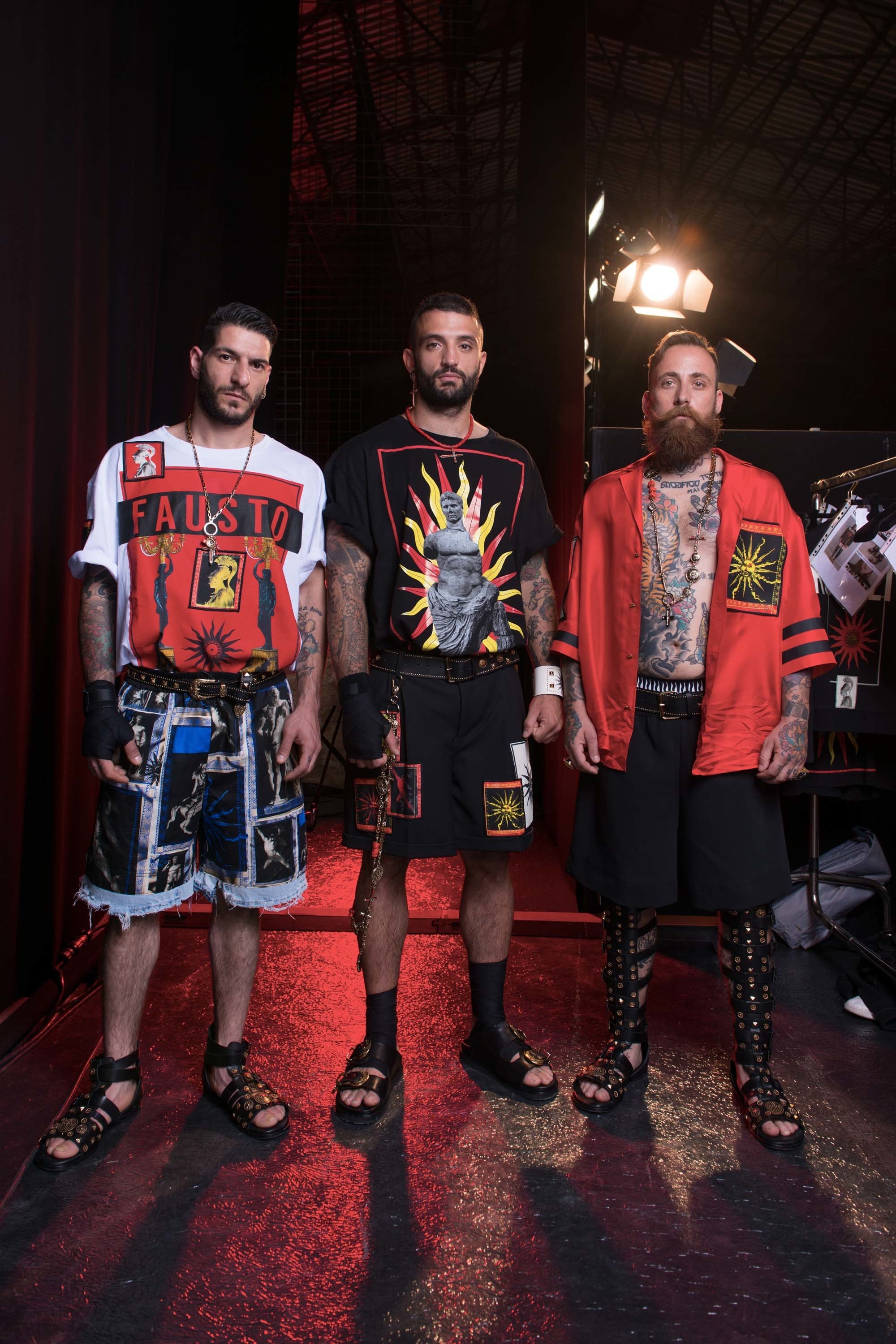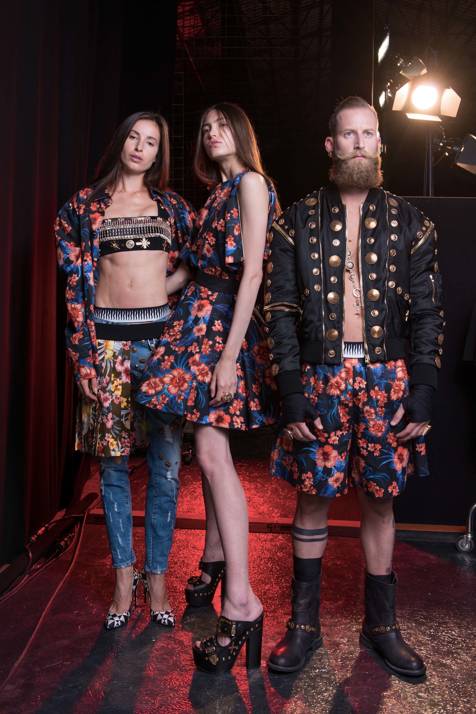 Incongruously, Puglisi chose to show in a disused train station. Perhaps that’s because he decided to provide the ornament—a phalanx of bodies, male and female, like a Roman frieze, raised on a plinth and dressed in his latest offerings. That is, his Resort collection for her, and his menswear debut for Spring 2017. They sat perfectly together, in the specific world of excess that Puglisi occupies, like a Michelangelo mural via Las Vegas, or those early-’90s multi-model Gianni Versace campaigns shot by Richard Avedon. The women wore the short, razzle-dazzle dresses in multihued florals with jutting skater skirts or layers of embellished pleats that Puglisi has claimed as his own (bar a tussle with that aforementioned Versace legacy). The men all seemed like embodiments of southern Italian machismo—more than a few were bearded, bearing a striking resemblance to Puglisi himself.