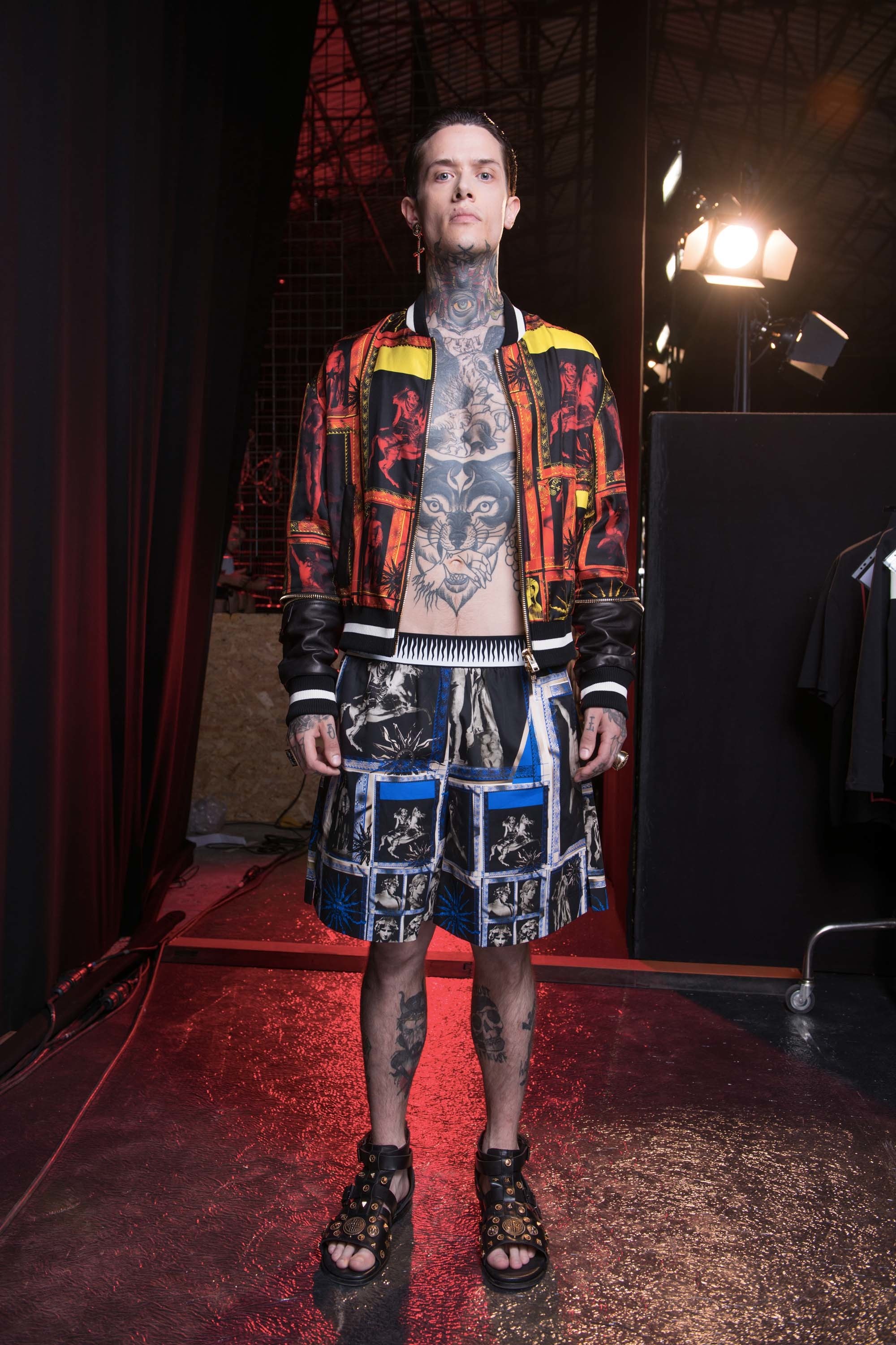 While the kind of men who will shell out big bucks for a bedazzled bit of womenswear are, even today, few and far between, there are guys who will be drawn to Puglisi’s unapologetic adornment. “Men so many times are more free,” reasons the designer. “A woman thinks, ‘Am I chic enough? I’m sexy too much?’ Whereas a man: If you like it, you wear it.” If you like Puglisi, you’ll be wearing bomber jackets encrusted with his signature gilt embroideries of starfish and shells, necklaces dripping with heavy coral, T-shirts stamped with images of Roman gods or Centurion helmets, and gladiator sandals studded with medallions, wrapping high up the leg under shorts printed with hothouse blooms or shredded denims.