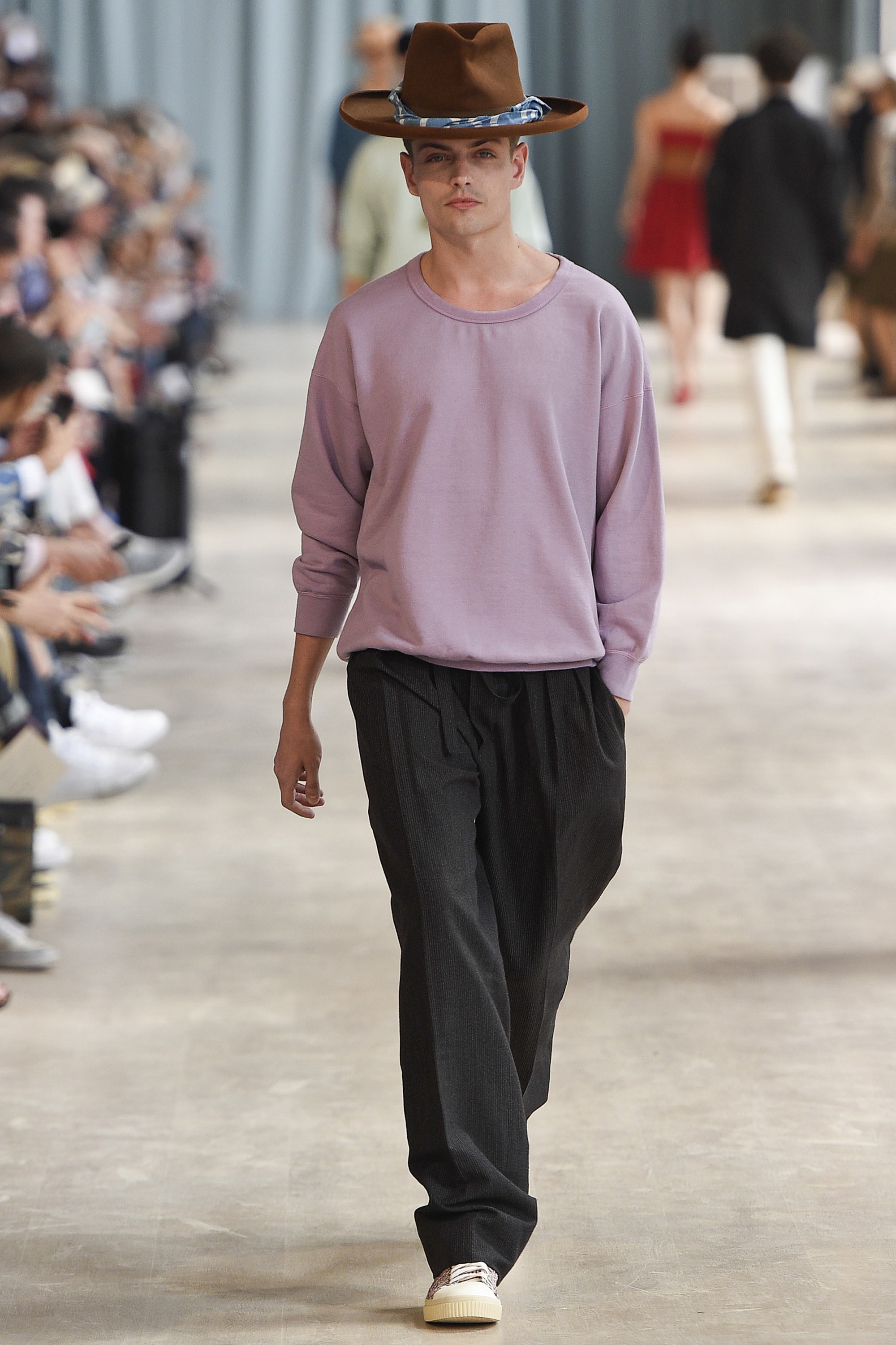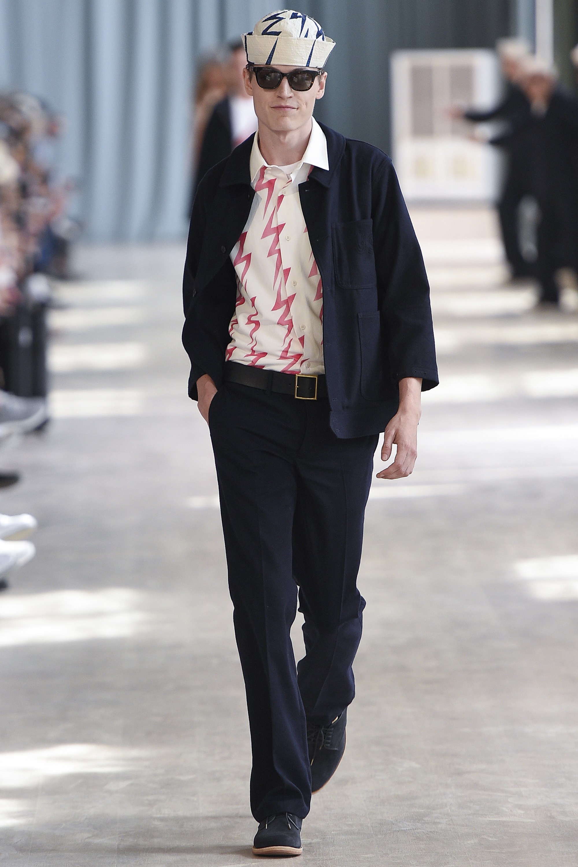 Will men want to dress like film characters? I’m mostly guessing not, but ditch the Stetsons and the straw boaters, and those allegorical outfits disintegrate rapidly into wearable, workaday pieces in innovative fabrics. I don’t need to assert their appeal to the ordinary man with money to spend; Visvim already sells well, all across the world. As a runway image, though, these clothes read quietly; generally Nakamura shows via appointment, to enable explanation of his clothes intricacies. Today he put on a show, but the clothes didn’t feel like the stars. Sailors doing a Shirley Temple routine are pretty much guaranteed to upstage anything, though.