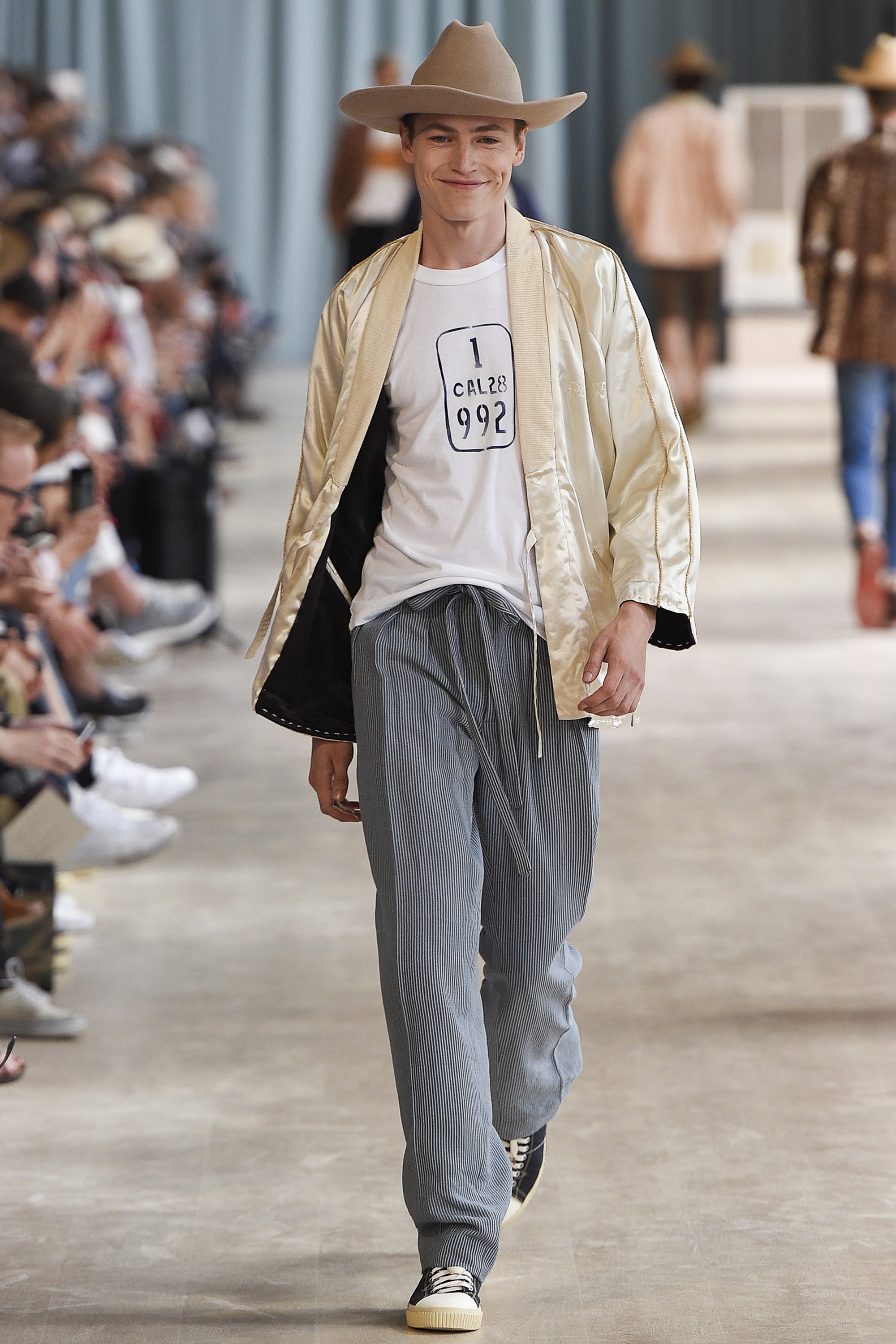 What about the clothes? They continued in the Visvim mold, of workwear, denims, and ten-gallon hats, but fused with the off-kilter, frequently overtly Japanese, like the cotton tie-front jackets cut wide and easy like a kimono. The American archetypes in dress, along with the all-singing, all-dancing backdrop, gave you the impression of stock characters let loose off the MGM lot: the cowboy, the laborer, the coach in a sweatshirt with cap and whistle, the rebel without a cause but with a lot of clothes. There was a focus on denim, the most American of fabrics, and a crop of seersucker tailcoats that looked like something out of American Gothic. There was also a peppering of retro-tinged, war bride–inspired pieces from the Visvim womenswear line, WMV, that crossed paths with the menswear throughout the show. Boy meets girl? The oldest script on the film lot.
