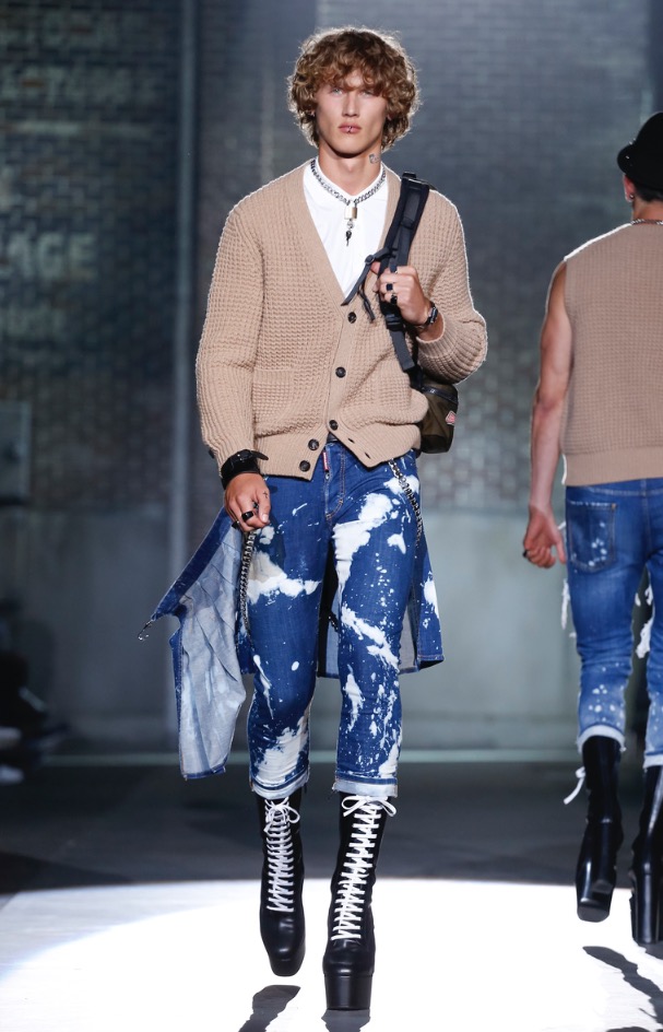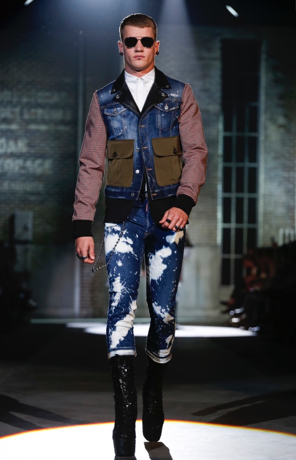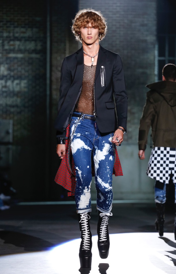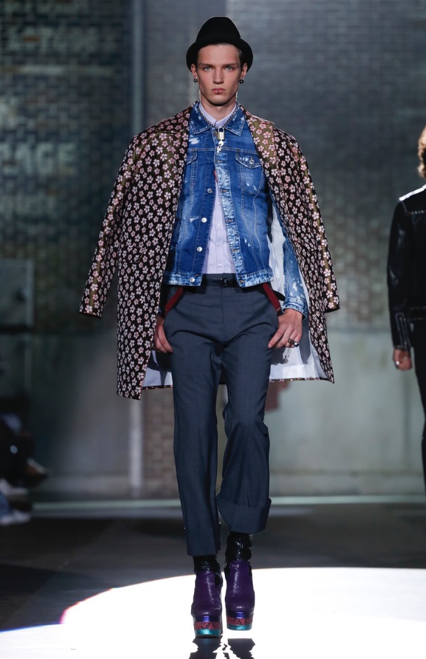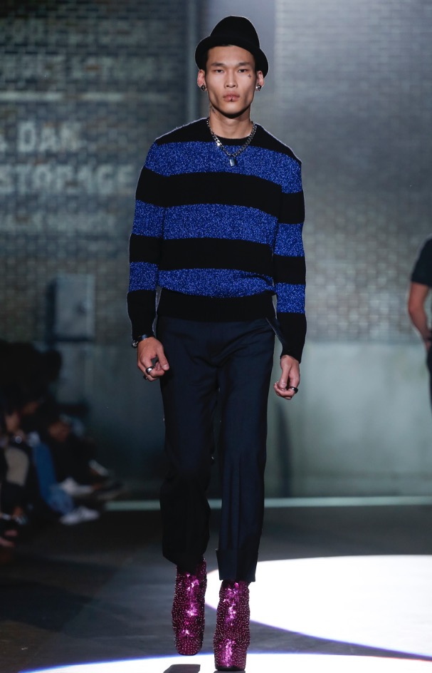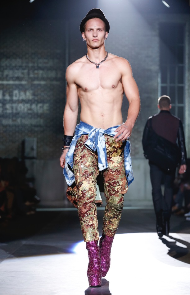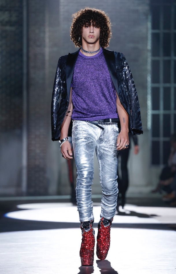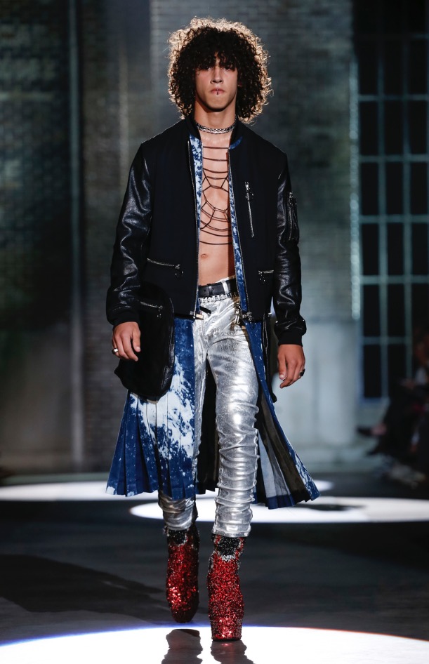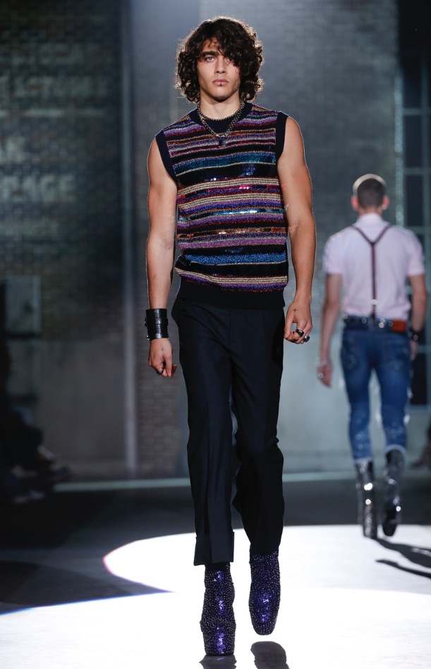 Let’s start at the bottom. Those platforms represented 6 inches of lift and came in silver paneled black calfskin or spangled with star paillettes. They were giddy and Ziggy and got the audience giggly. Dean and Dan Caten said backstage that the footwear had defined their casting for this show. “We really have to hand it to them. The first thing we did at the casting was to make them try the shoes. And if they could walk in them, then we dressed them, then they got the show.”