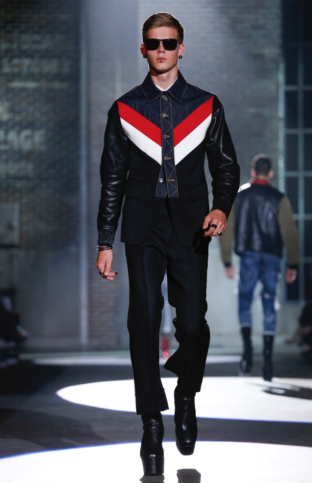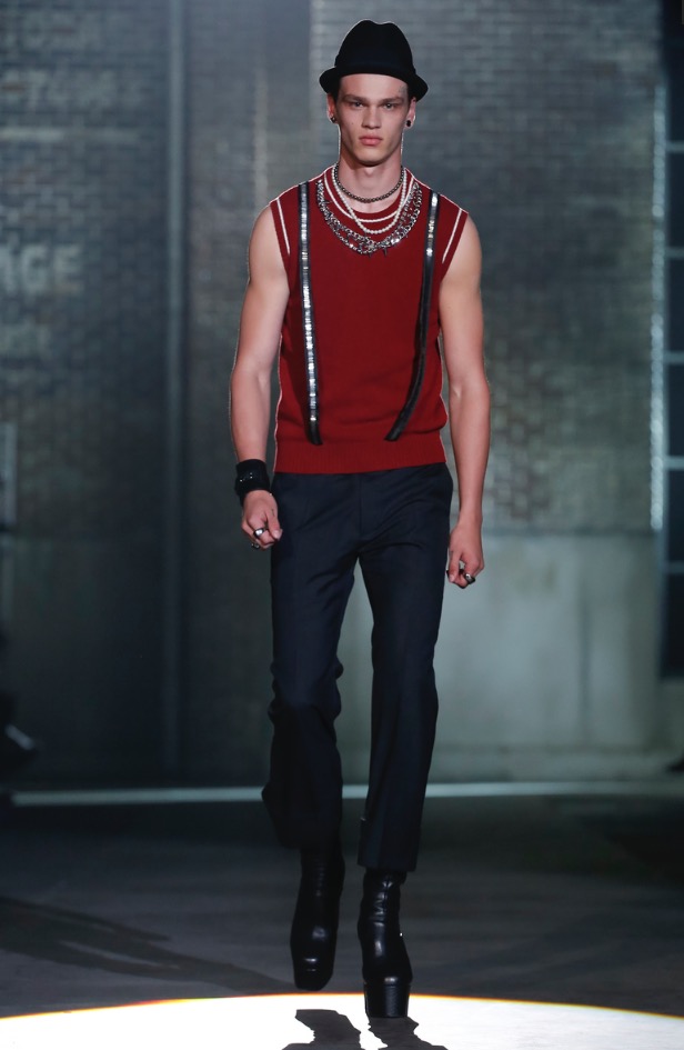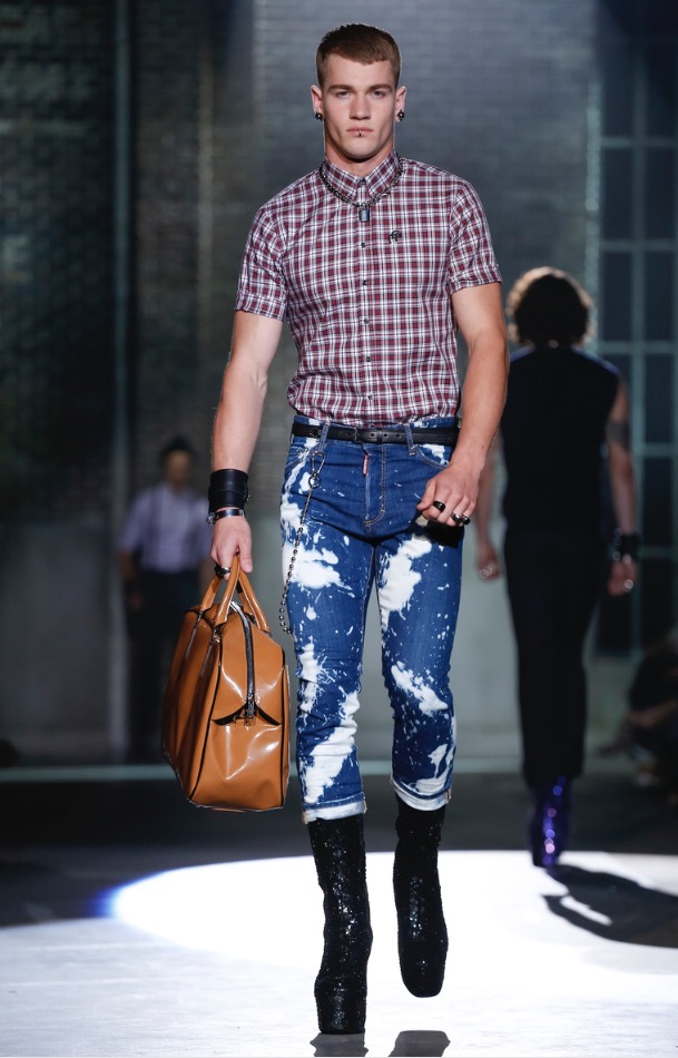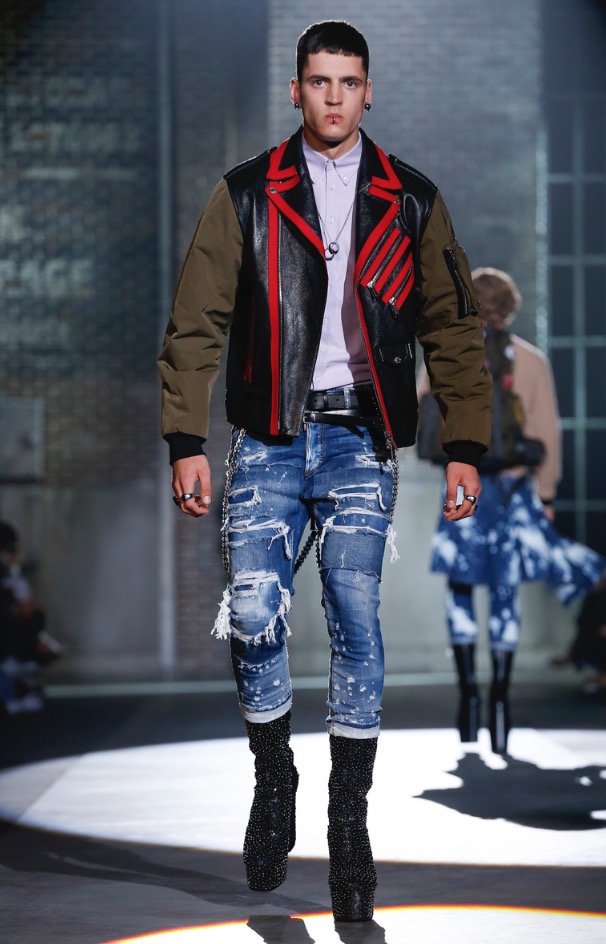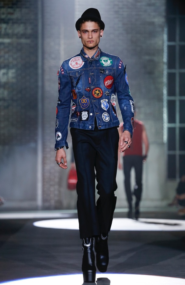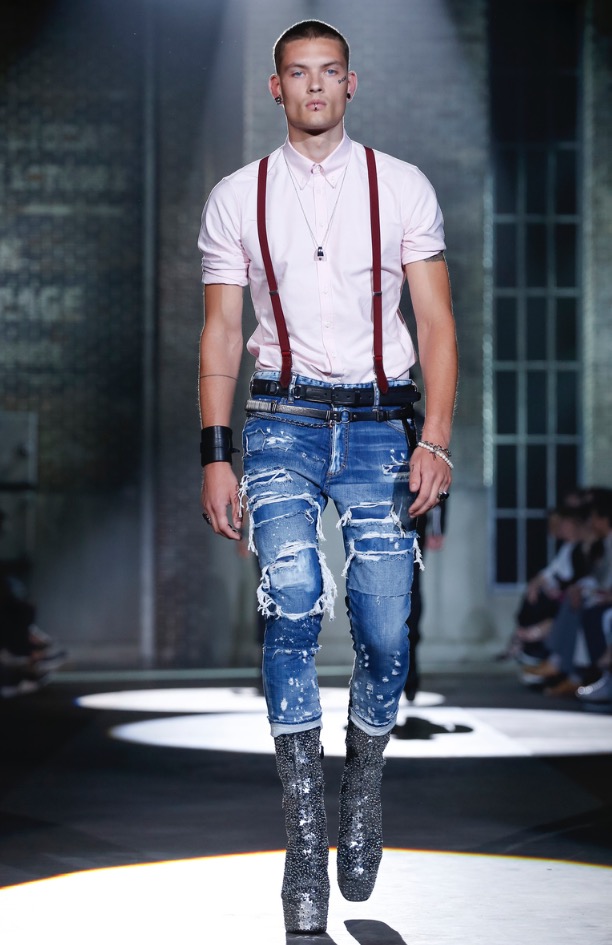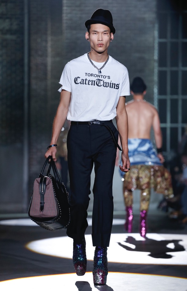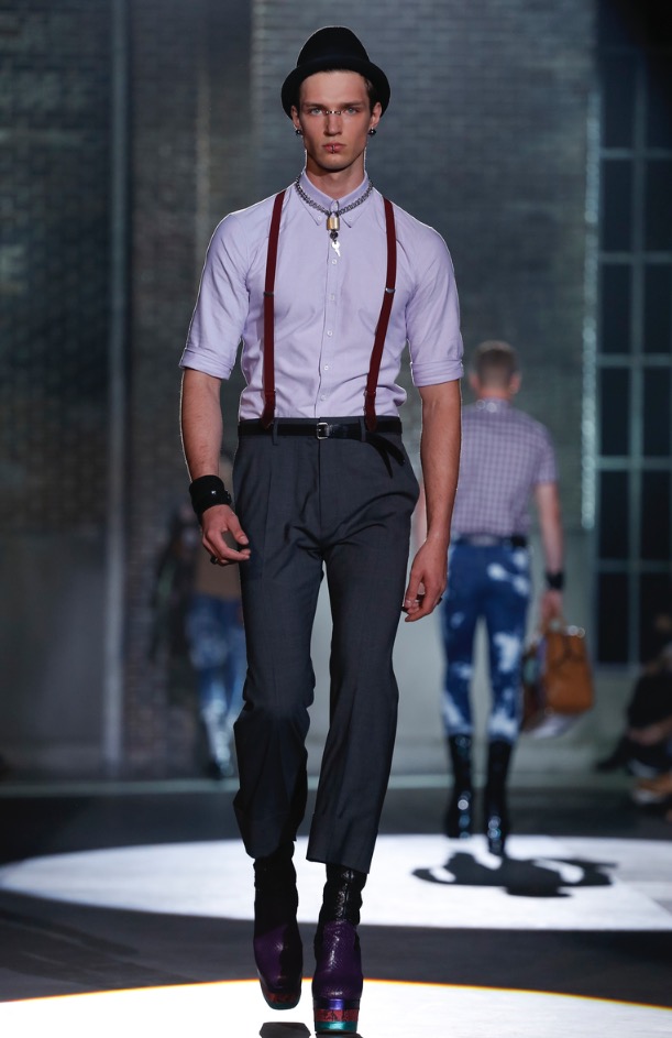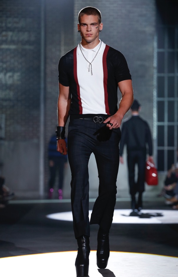 Let’s start at the bottom. Those platforms represented 6 inches of lift and came in silver paneled black calfskin or spangled with star paillettes. They were giddy and Ziggy and got the audience giggly. Dean and Dan Caten said backstage that the footwear had defined their casting for this show. “We really have to hand it to them. The first thing we did at the casting was to make them try the shoes. And if they could walk in them, then we dressed them, then they got the show.”