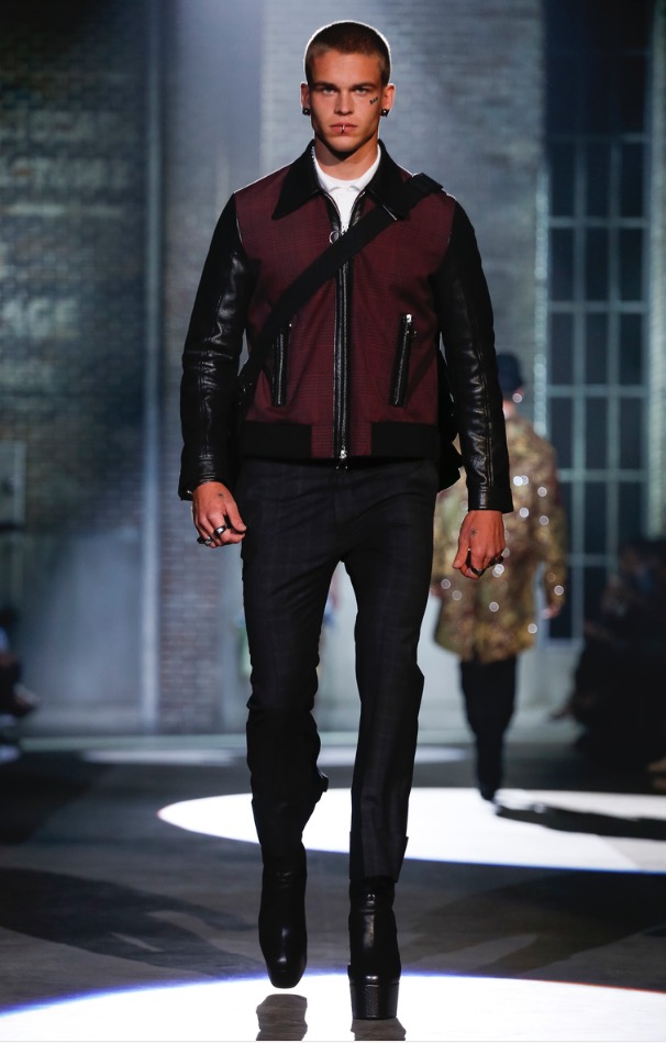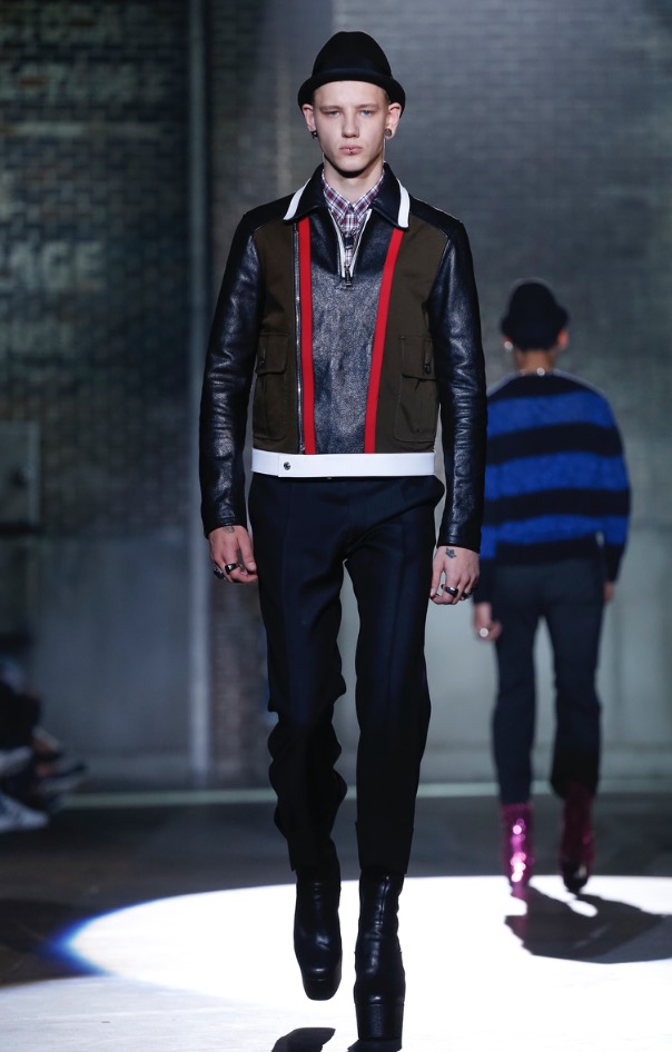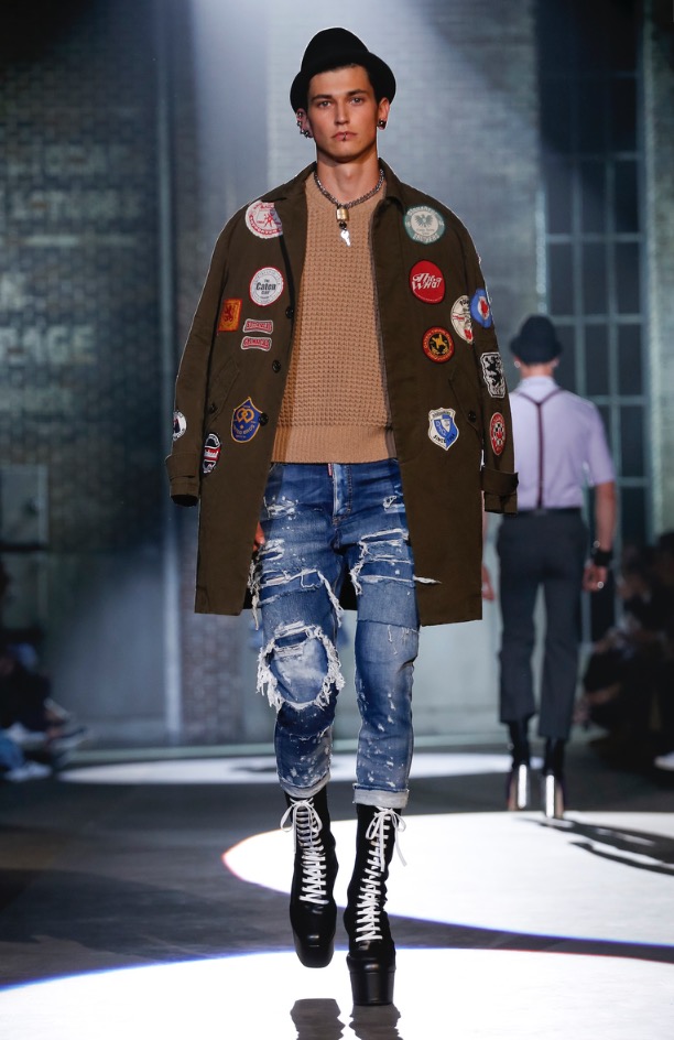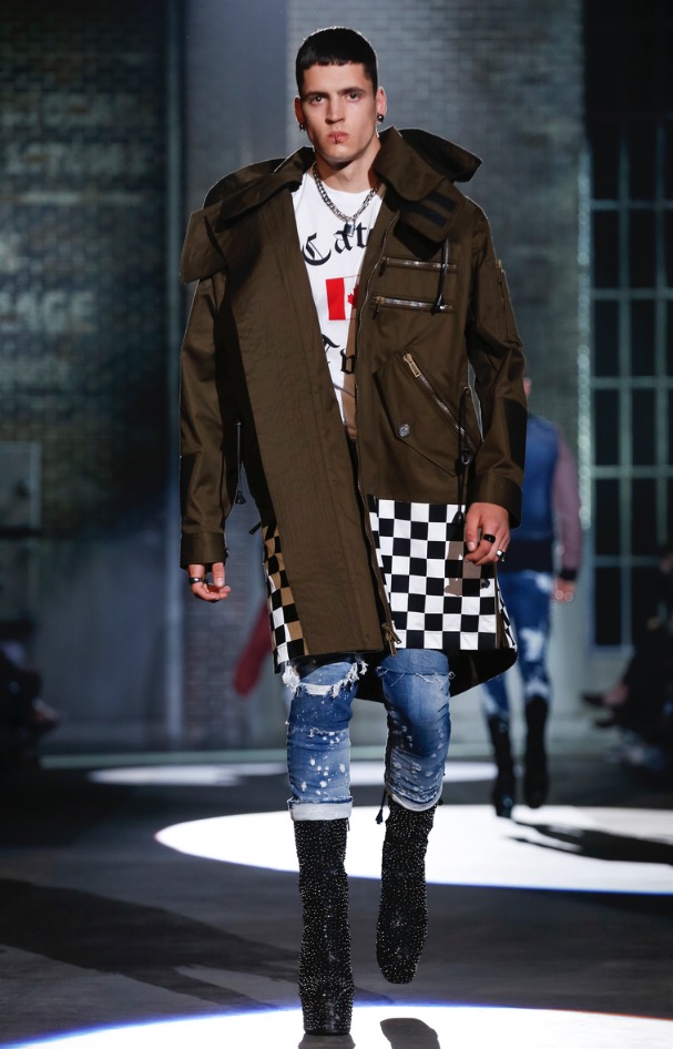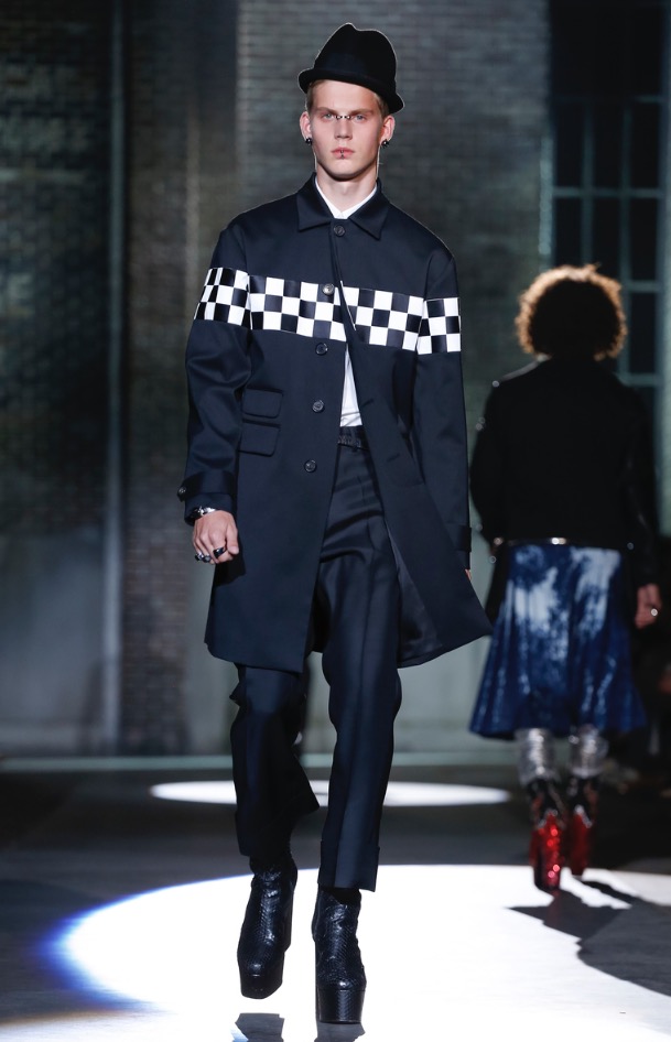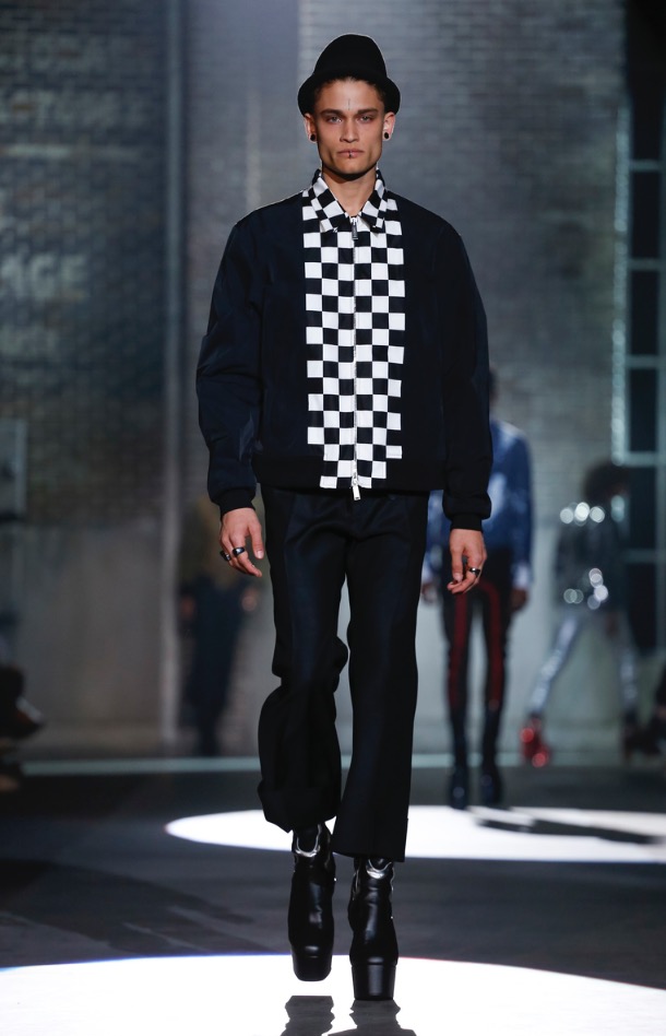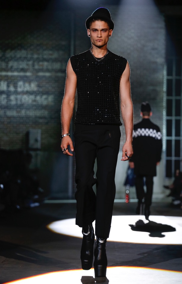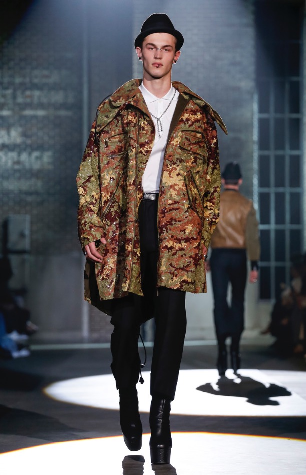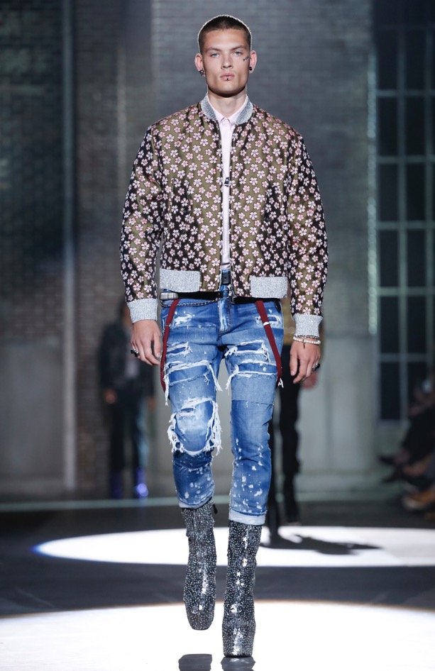 With the rare exception of one or two guys who gingerly relied on glutes over core to maintain mastery of the floor, most of these models managed their Bowie-boots with great grace. Above them they wore a highly worked montage of masculine youth tribes drawn from the Catens’ country of residence, Great Britain, which were made capital-F Fabulous by those boots and their lavishness of fabrication. So we had skinhead/suedehead tank tops and bleach-splattered tight denim heaped with jewelry. The mod favorite fishtail parka came in a paillette-rendered camouflage, as did combats and bombers. Under porkpie hats the checkerboard motif of 2 Tone ska was played out in lush satin. A string vest spattered with Swarovski was bitchily butch. A jacquard of daisies in pink dotted silver Lurex was military-subversive.