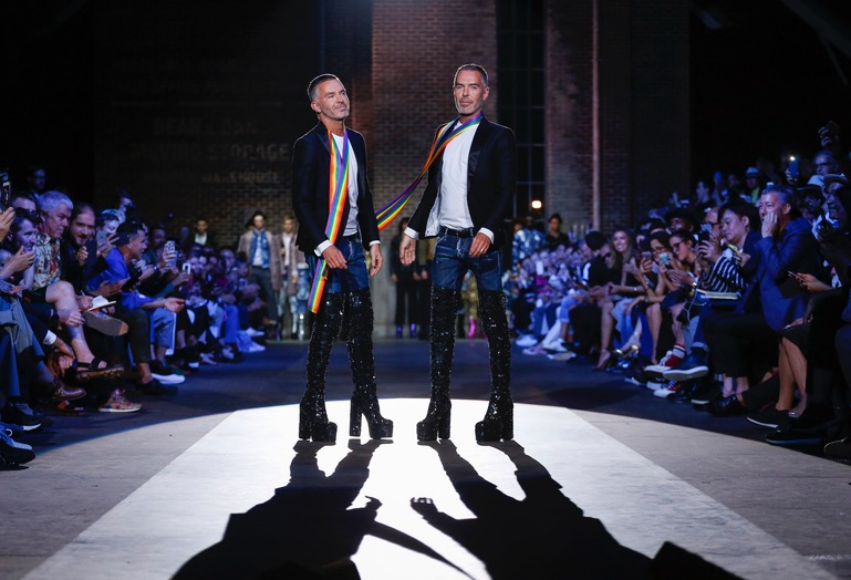 “This is also a celebration of our homosexuality,” said the designers. At the finale they wore those platforms, thigh high, to take their bow—“we have to because we are already dwarves and those boys are towering over us”—and garlanded themselves in rainbow ribbons as an expression of solidarity for violated Orlando.