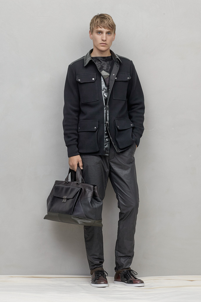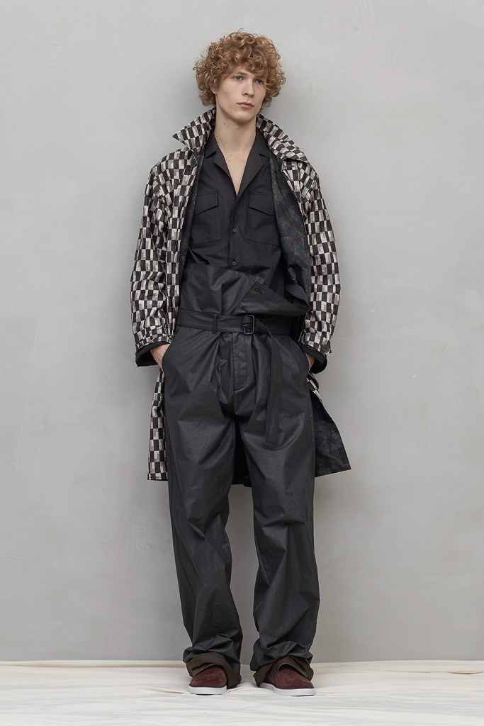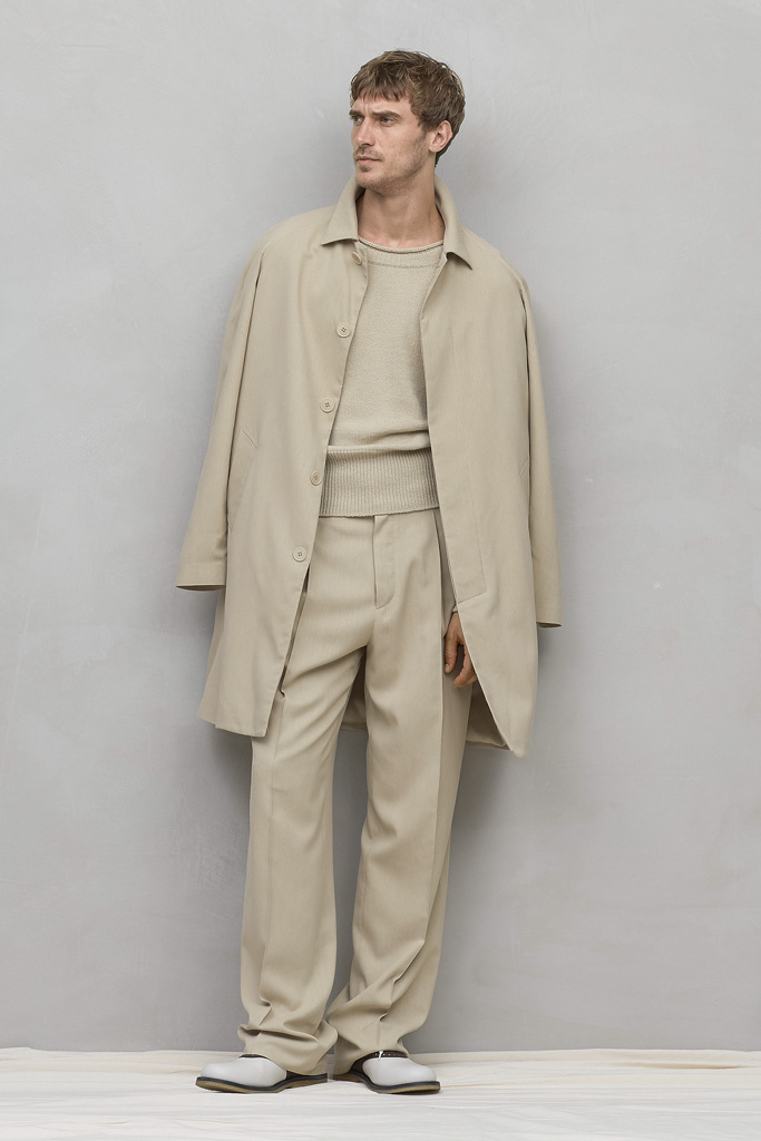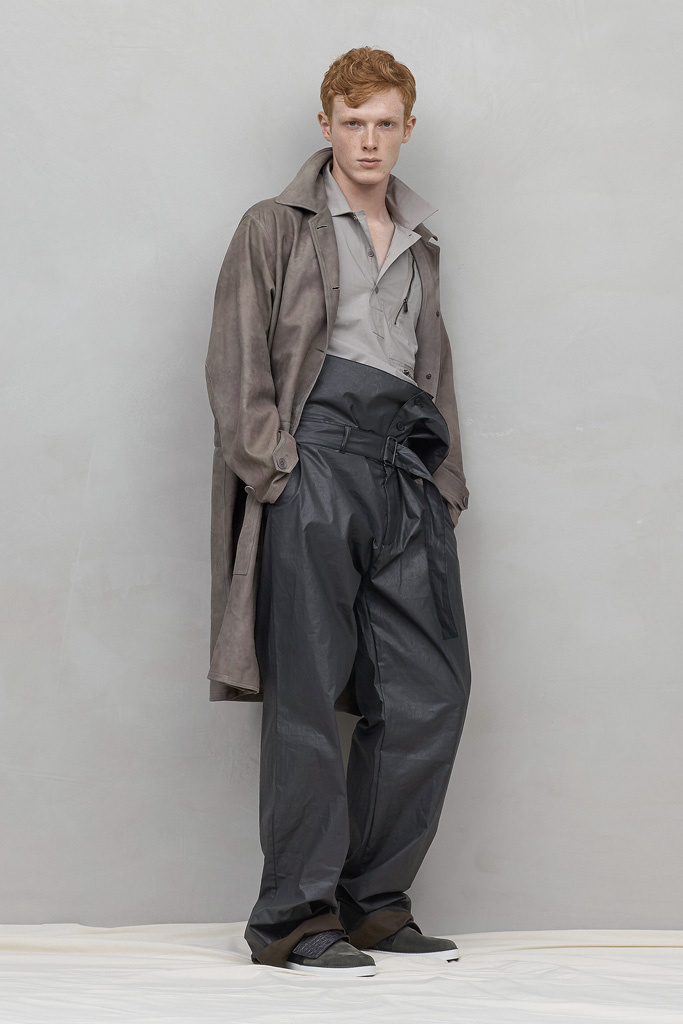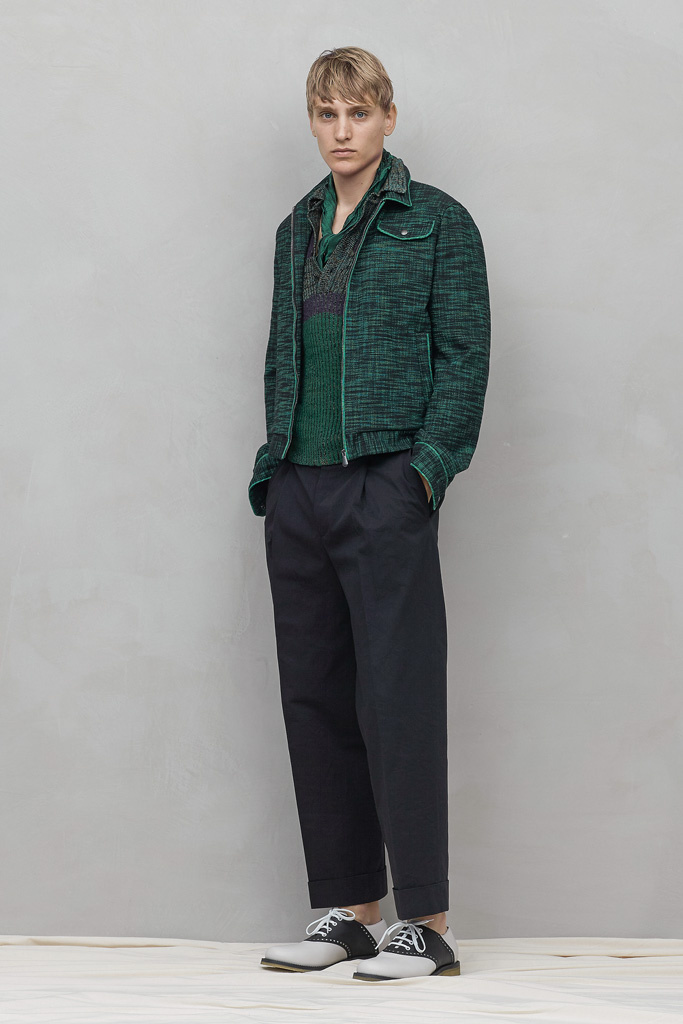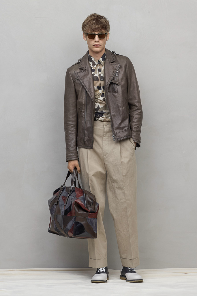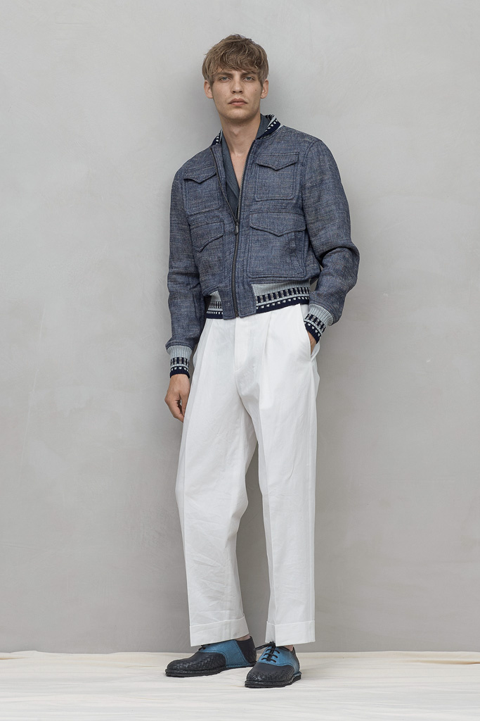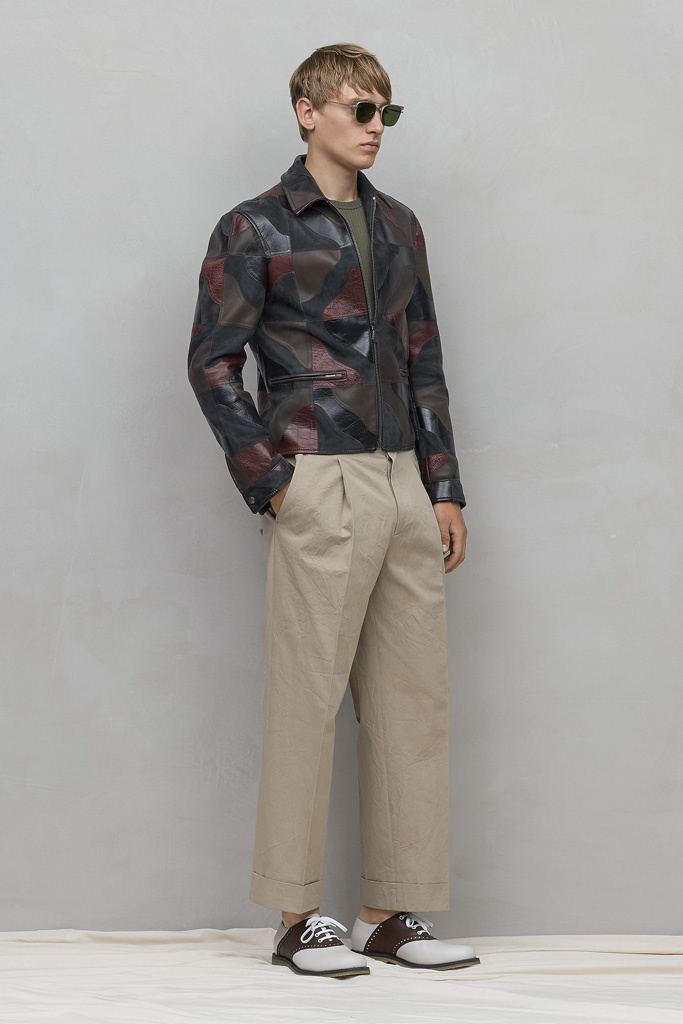 The Forties was his touchstone decade this time, telegraphed by roomy pants that puddle over two-tone saddle shoes, and a borderline-drab wartime palette. Tailoring in lustrous cotton blends or deliberately rumpled, metal-flecked linen had the same slouchy and elongated line as his fall 2016 collection. Workwear details like utility pockets, metal studs and leather patches tempered the luxury factor of the sportswear.