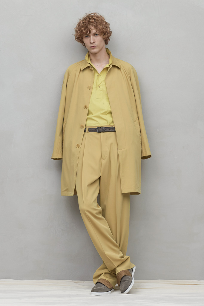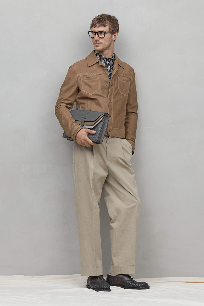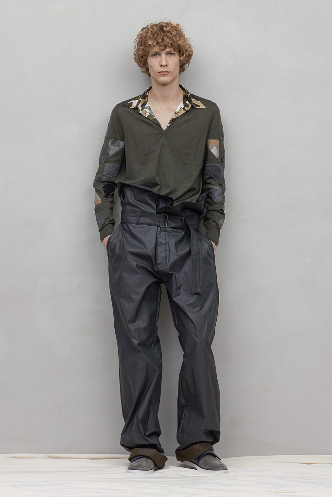 The brand’s signature braiding sprouted over brogues, biker jackets and blousons, adding texture to pockets and yokes on clothing. Puzzle-like patchworks on leather blousons recalled the Seventies, as did camp shirts and donkey jackets in a polyester doubleknit. While some of the clothes were overcharged with crinkling and patchworking, Maier nailed it with the quiet chic of a languid, beige silk trench, or a crisp uniform-like shirt tucked into those big pants.