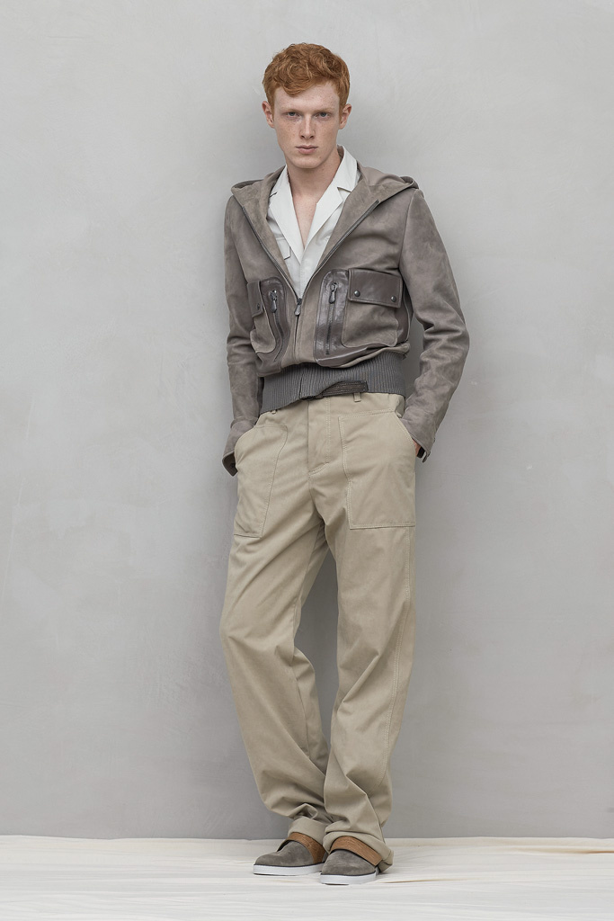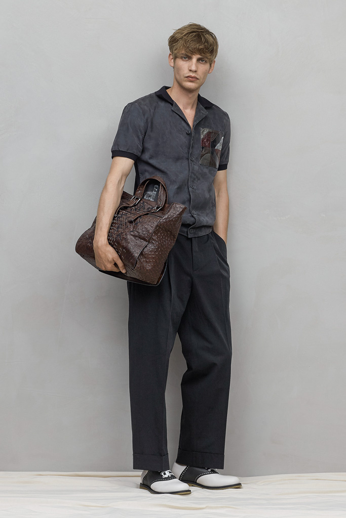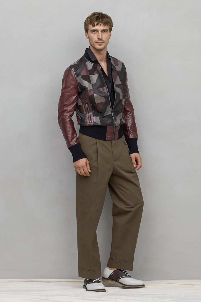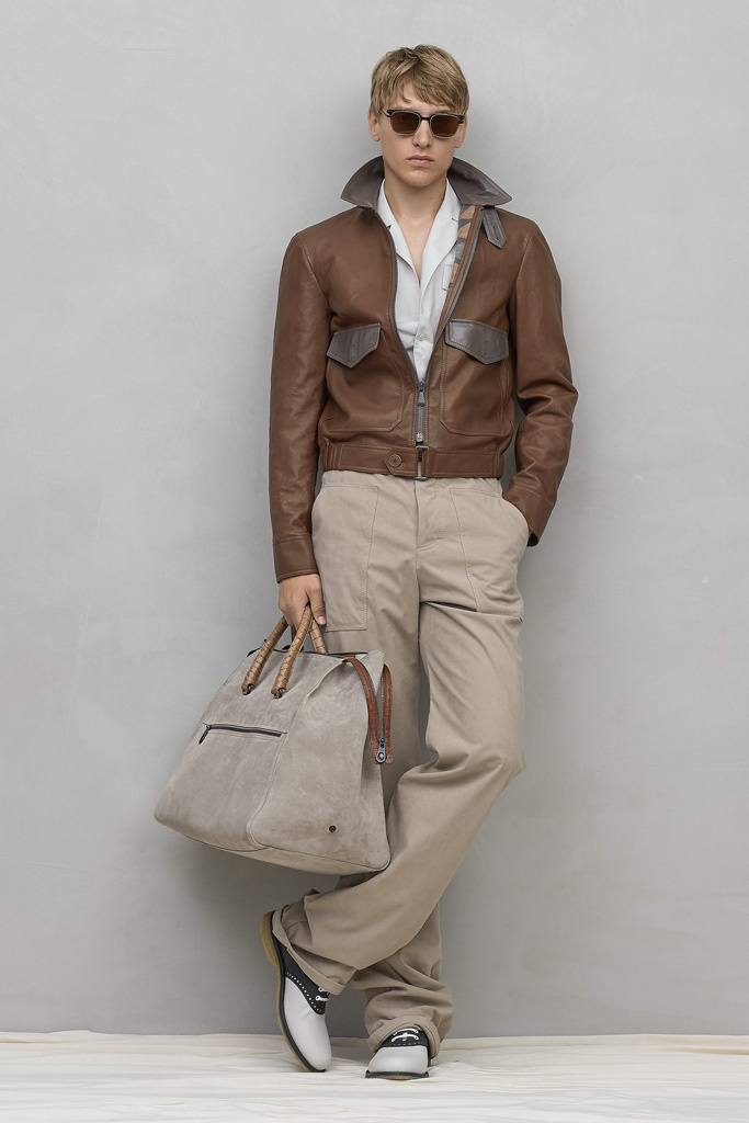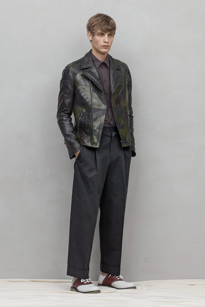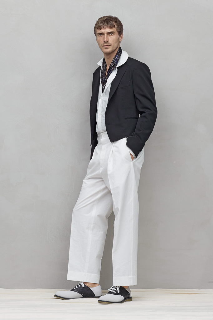 The Forties was his touchstone decade this time, telegraphed by roomy pants that puddle over two-tone saddle shoes, and a borderline-drab wartime palette. Tailoring in lustrous cotton blends or deliberately rumpled, metal-flecked linen had the same slouchy and elongated line as his fall 2016 collection. Workwear details like utility pockets, metal studs and leather patches tempered the luxury factor of the sportswear.