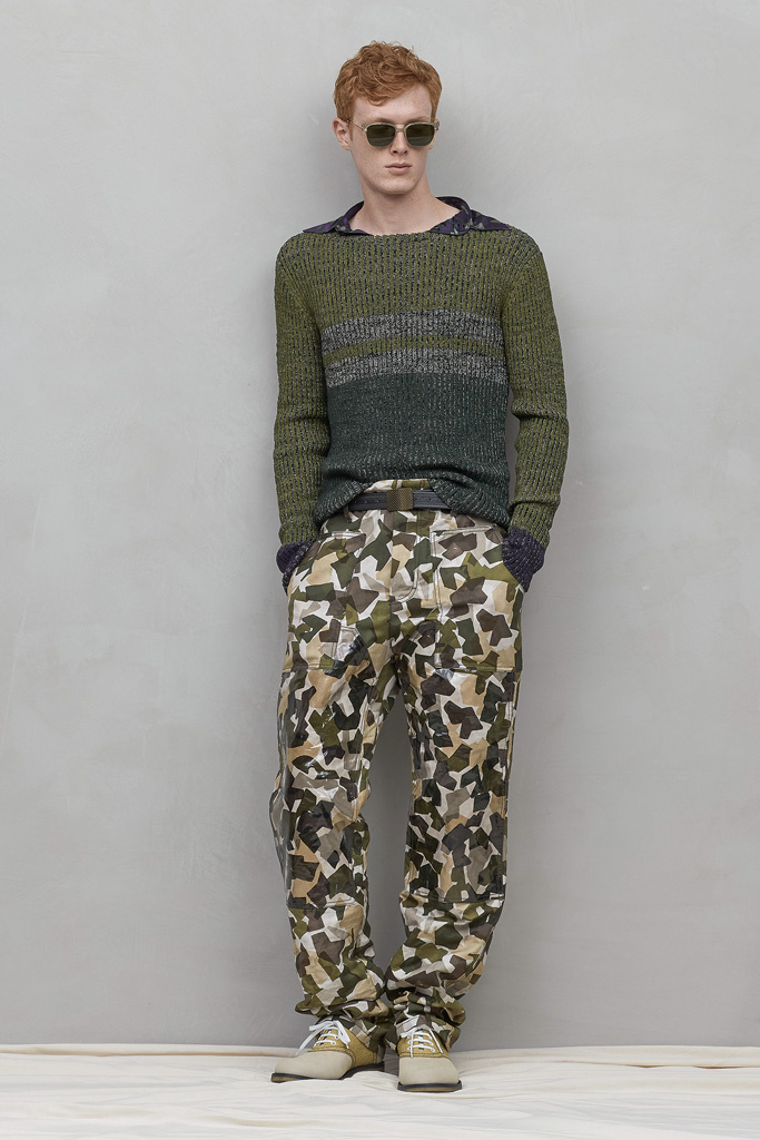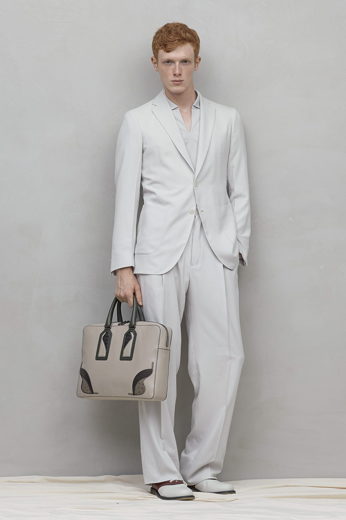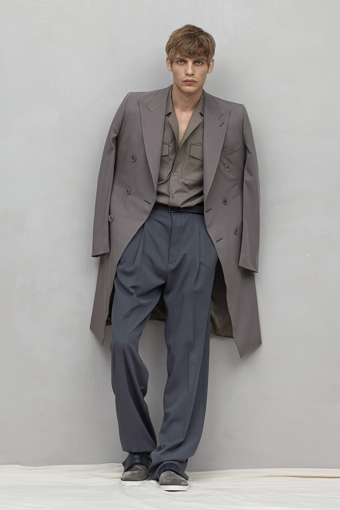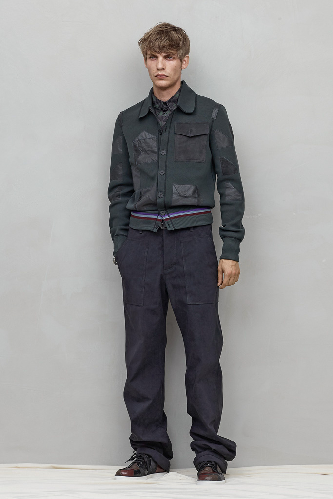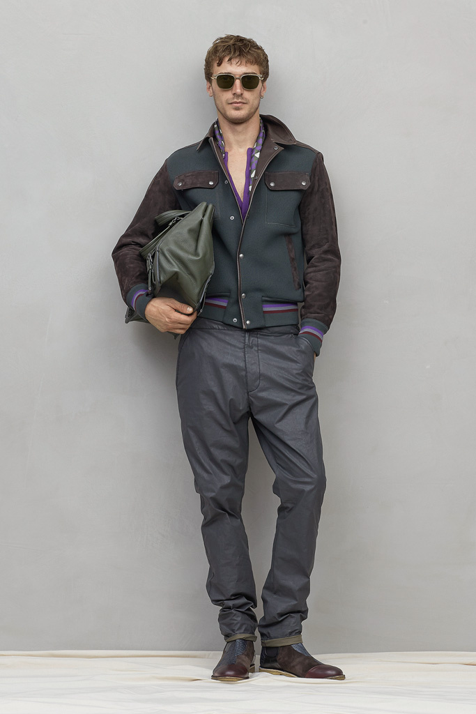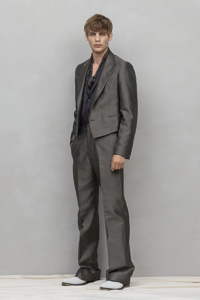 The Forties was his touchstone decade this time, telegraphed by roomy pants that puddle over two-tone saddle shoes, and a borderline-drab wartime palette. Tailoring in lustrous cotton blends or deliberately rumpled, metal-flecked linen had the same slouchy and elongated line as his fall 2016 collection. Workwear details like utility pockets, metal studs and leather patches tempered the luxury factor of the sportswear.